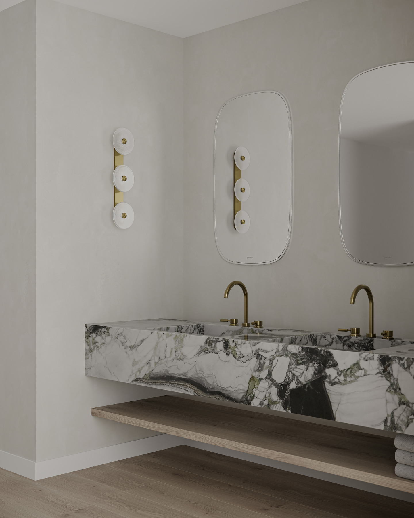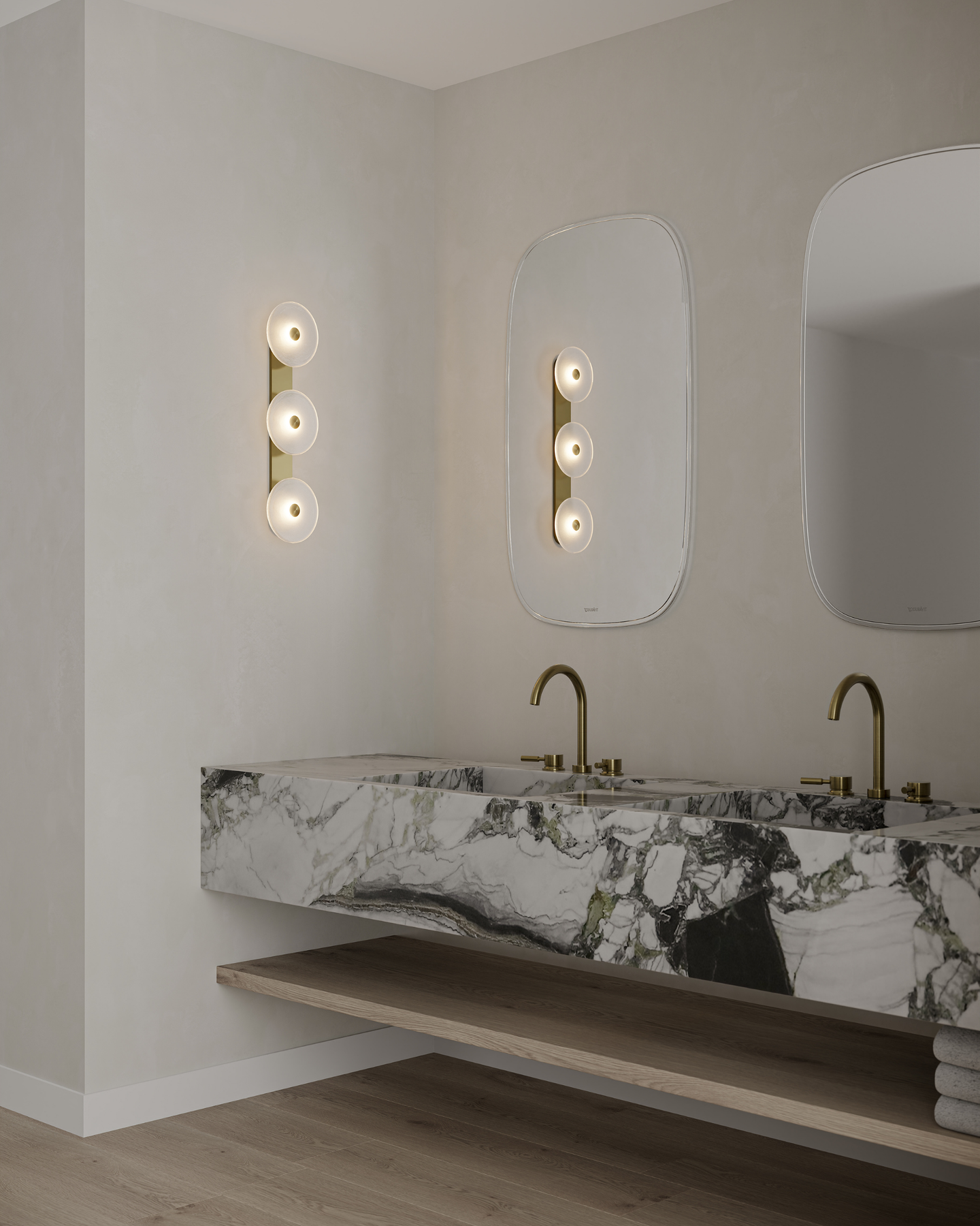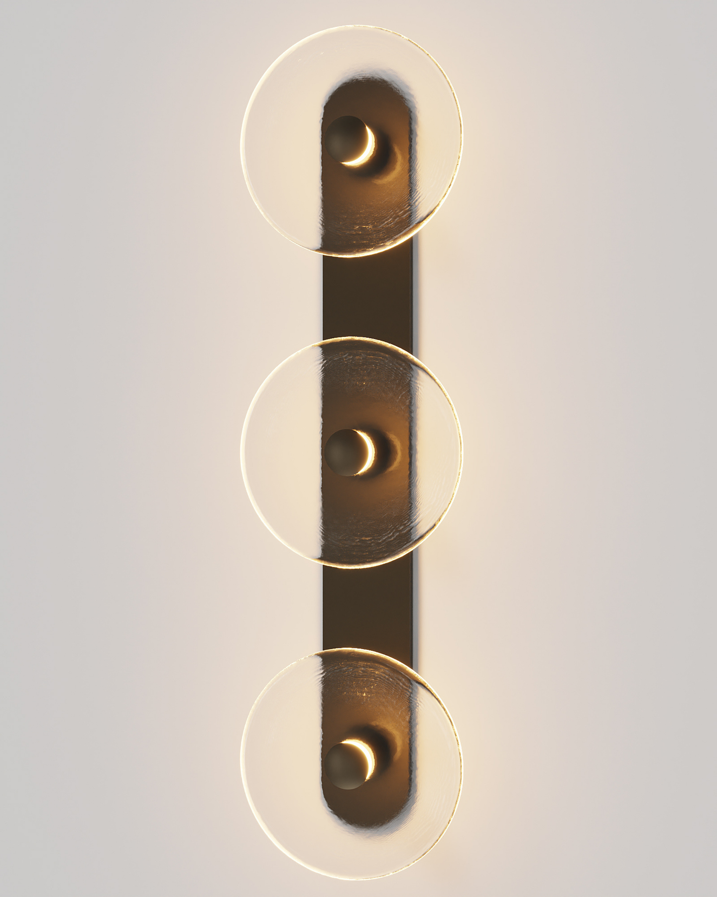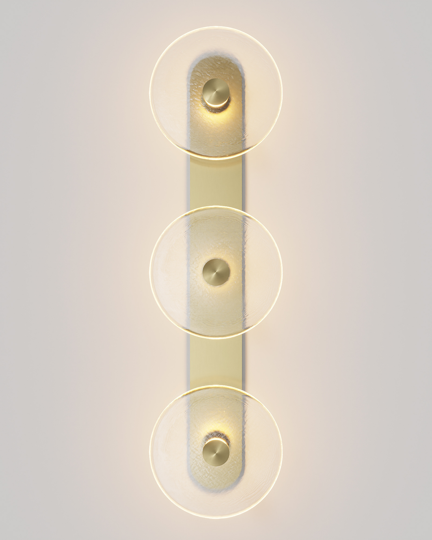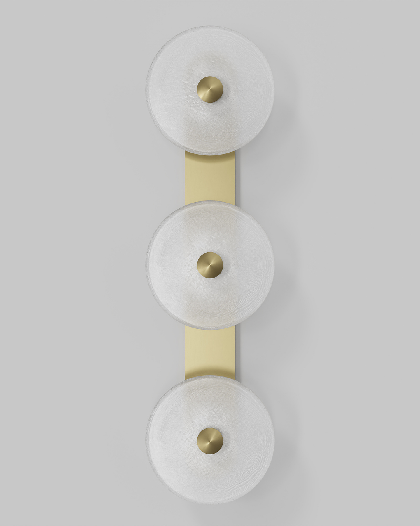 Individually handmade in Currumbin, Australia, this design is crafted from hand-blown frosted or clear Swedish glass. Designed by Oliver Höglund & Ryan Roberts, it features three discs mounted upon a sleek wall mount, making it ideal for both residential and architectural spaces. The glass is hand-blown at one thousand degrees Celsius, resulting in subtle variations that make each piece unique.