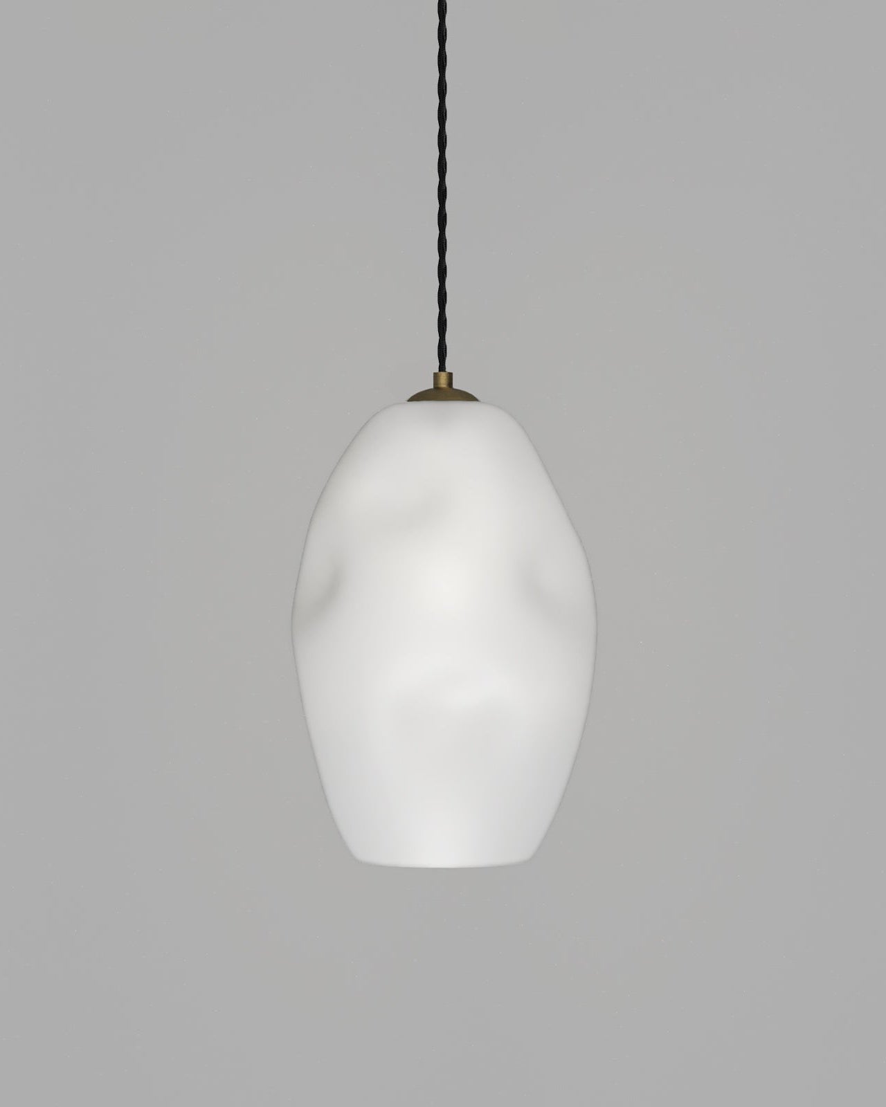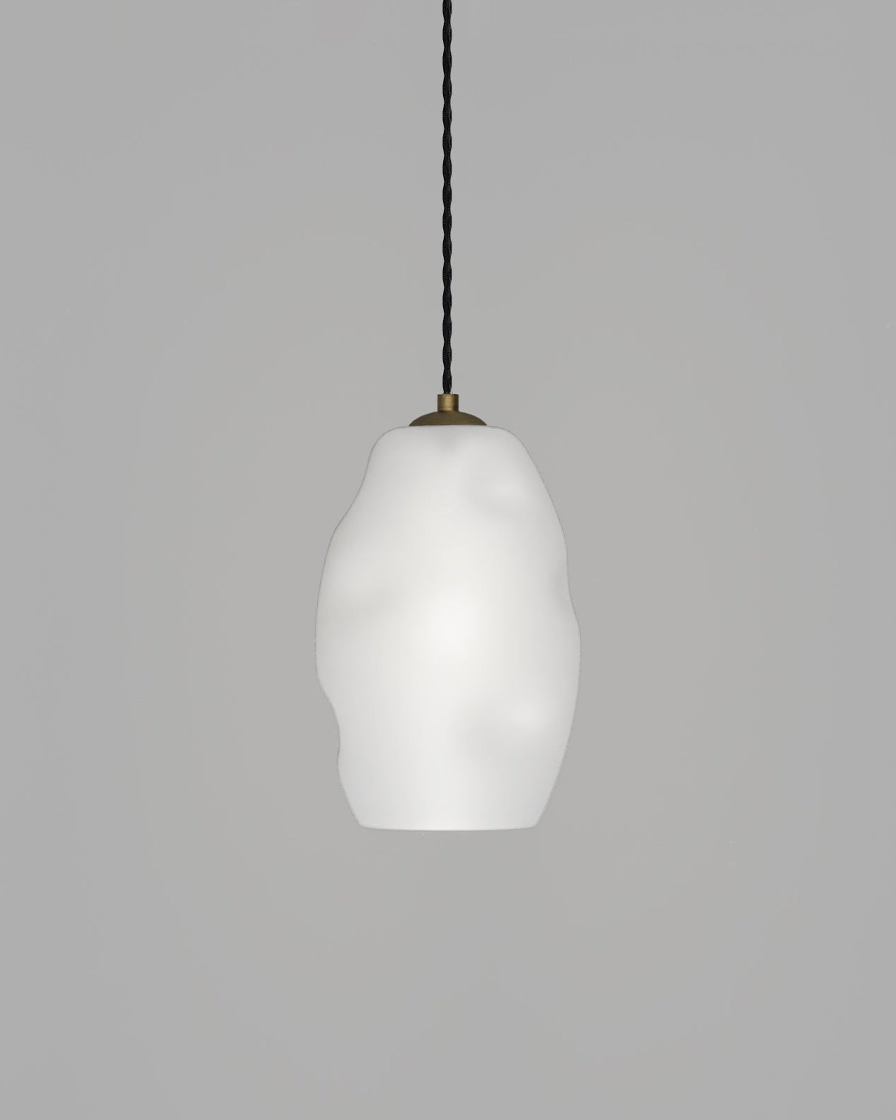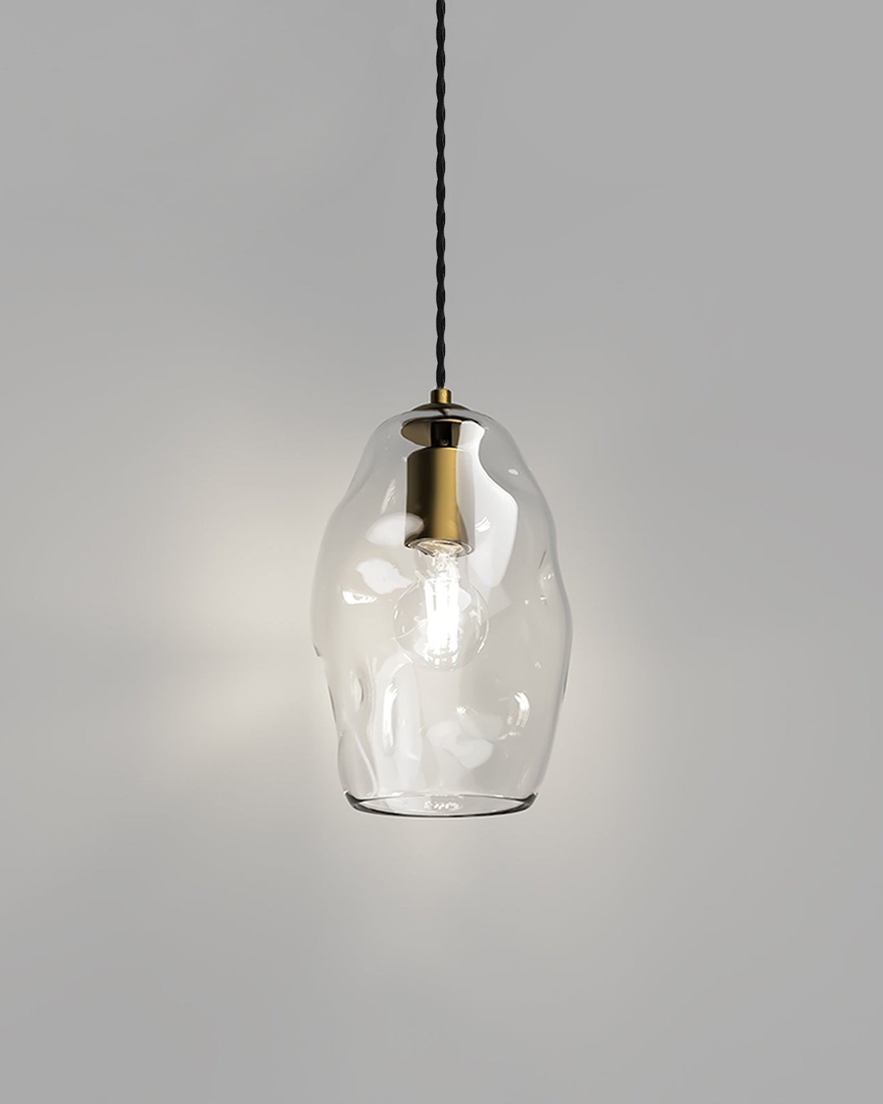 Crafted with elements of mouth-blown thick imperfect glass, and solid brass or iron with a raw aged tarnish, this organic style glass pendant will elevate your interior space. The Indented Mouth Blown Glass Pendant Light is available in an iron or brass finish and complemented with an elegant braided black cloth cord. Install this unique pendant on its own or as a cluster, this eye-catching pendant will complement the design of any dining room, bedroom or living room to bring an ambient warm glow into the interior space.