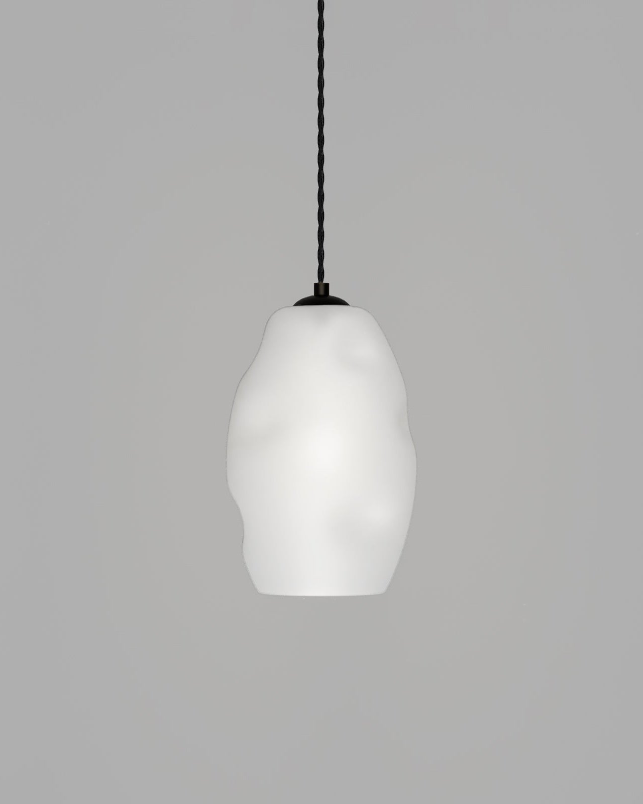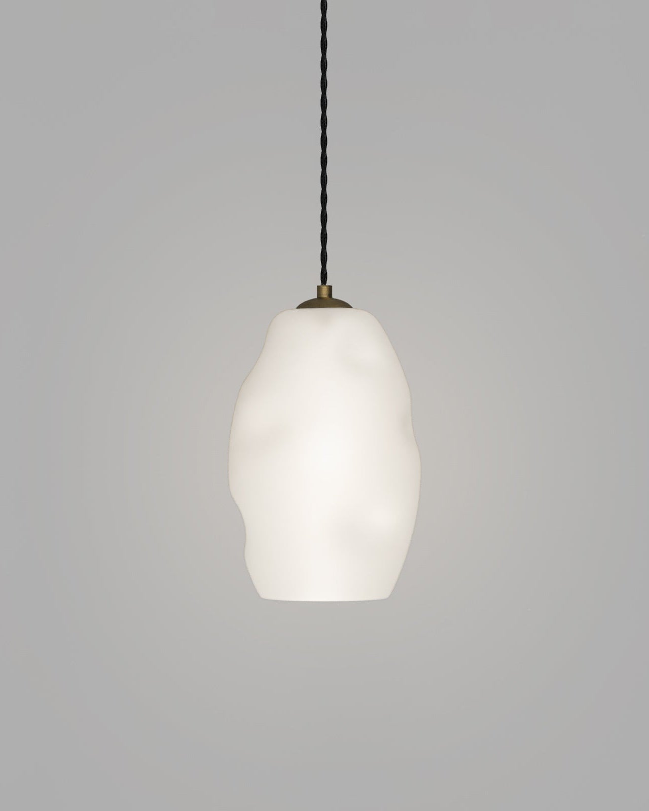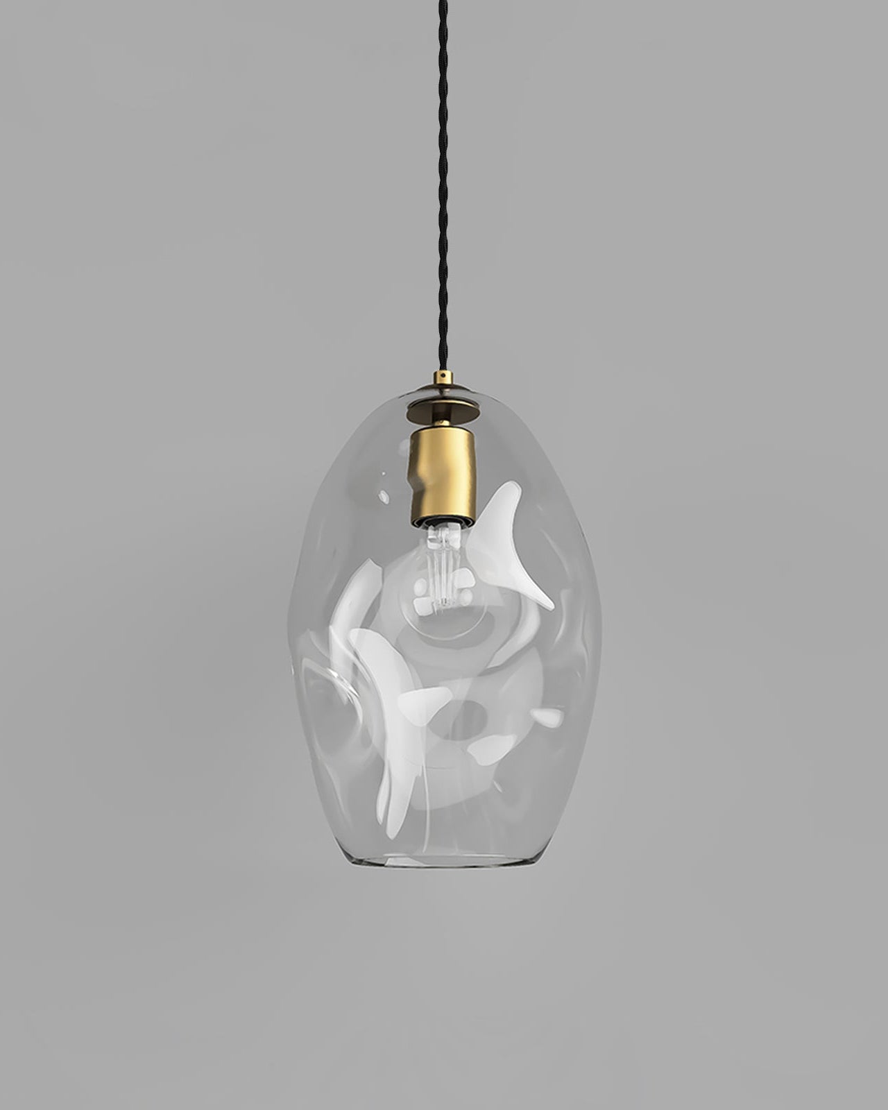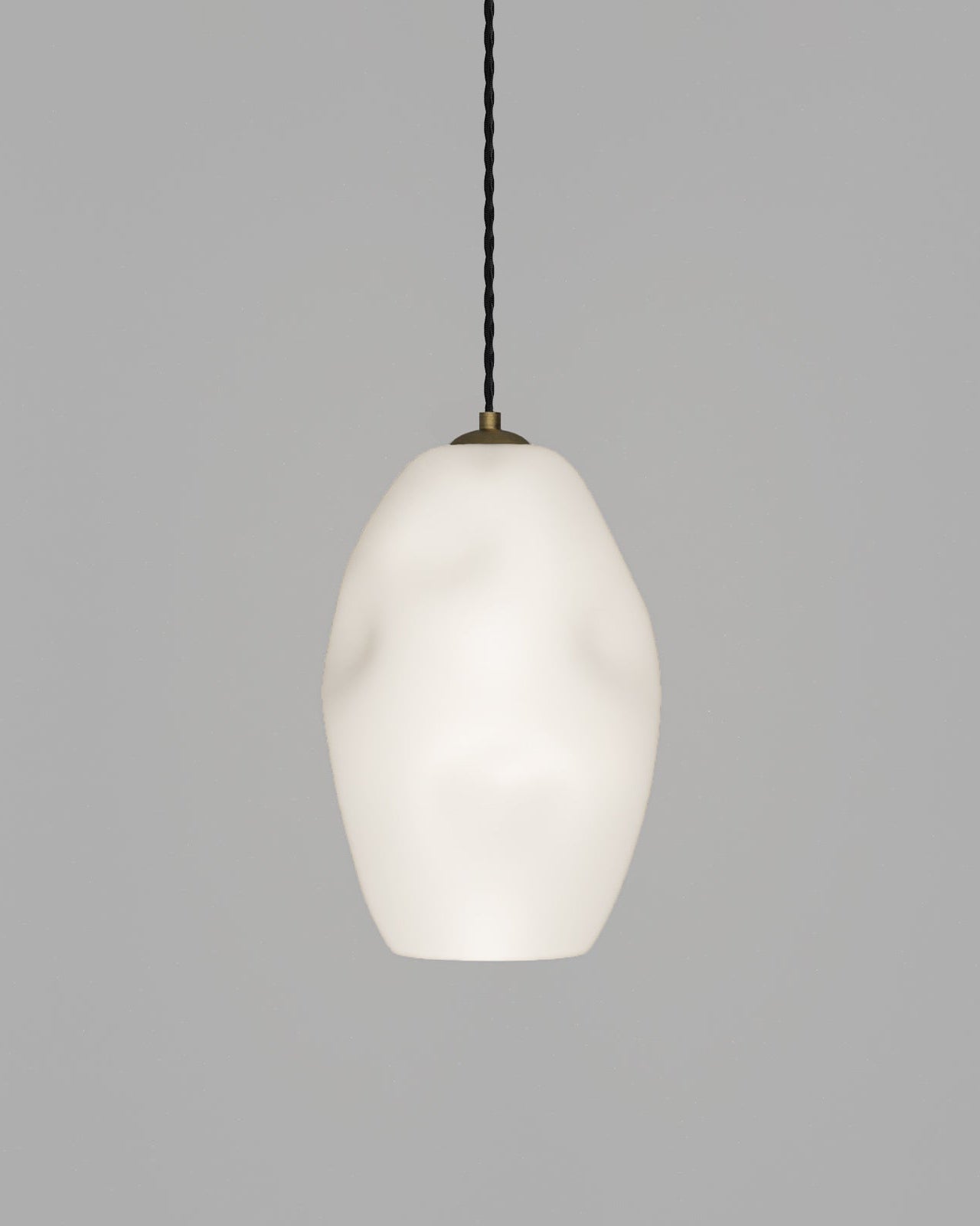 Crafted with elements of mouth-blown thick imperfect glass, and solid brass or iron with a raw aged tarnish, this organic style glass pendant will elevate your interior space. The Indented Mouth Blown Glass Pendant Light is available in an iron or brass finish and complemented with an elegant braided black cloth cord. Install this unique pendant on its own or as a cluster, this eye-catching pendant will complement the design of any dining room, bedroom or living room to bring an ambient warm glow into the interior space.