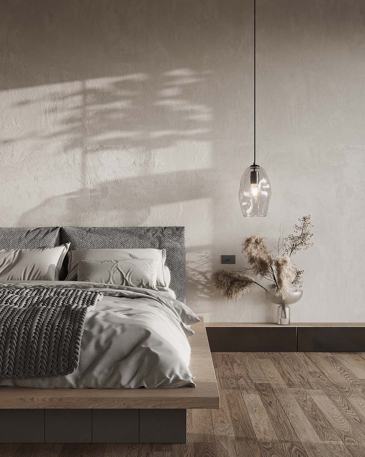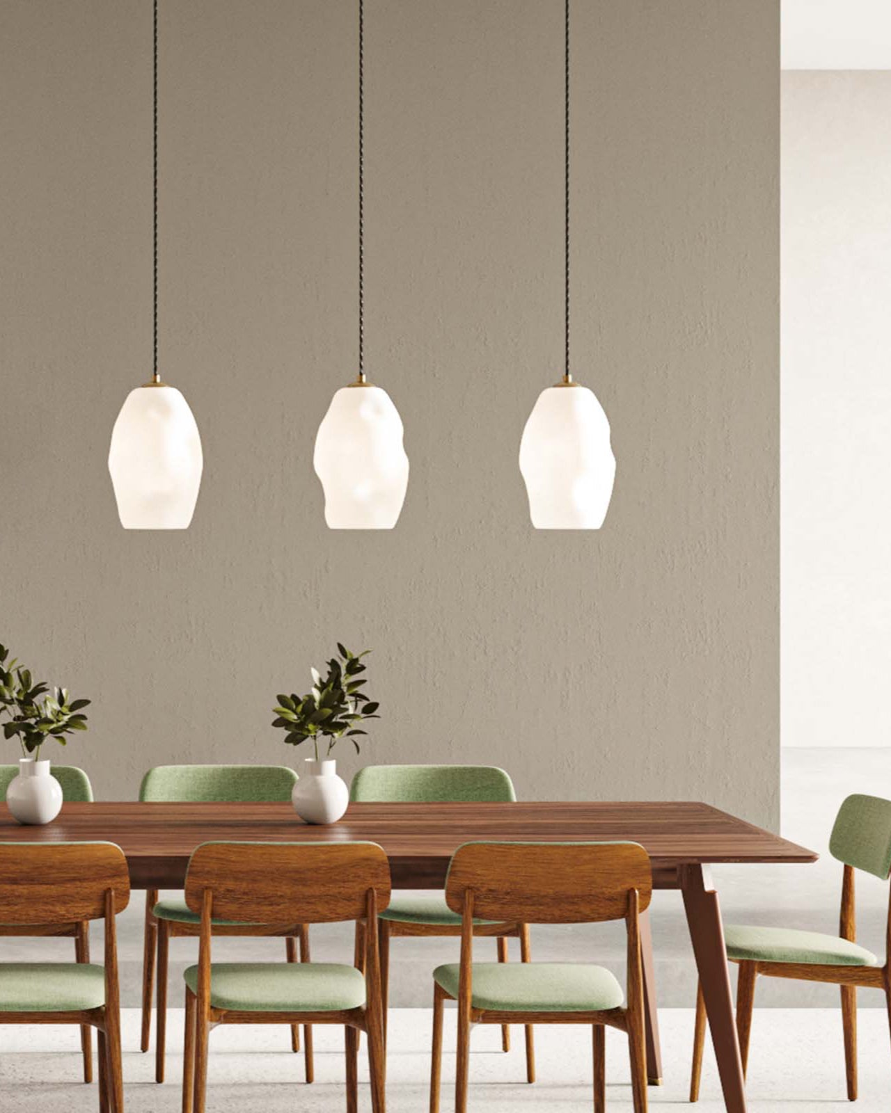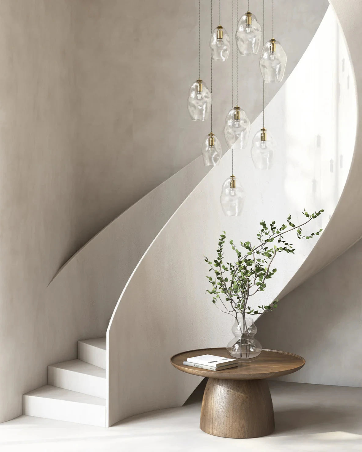 Modern interior with a wooden table, vase with greenery, and glass pendant lights.