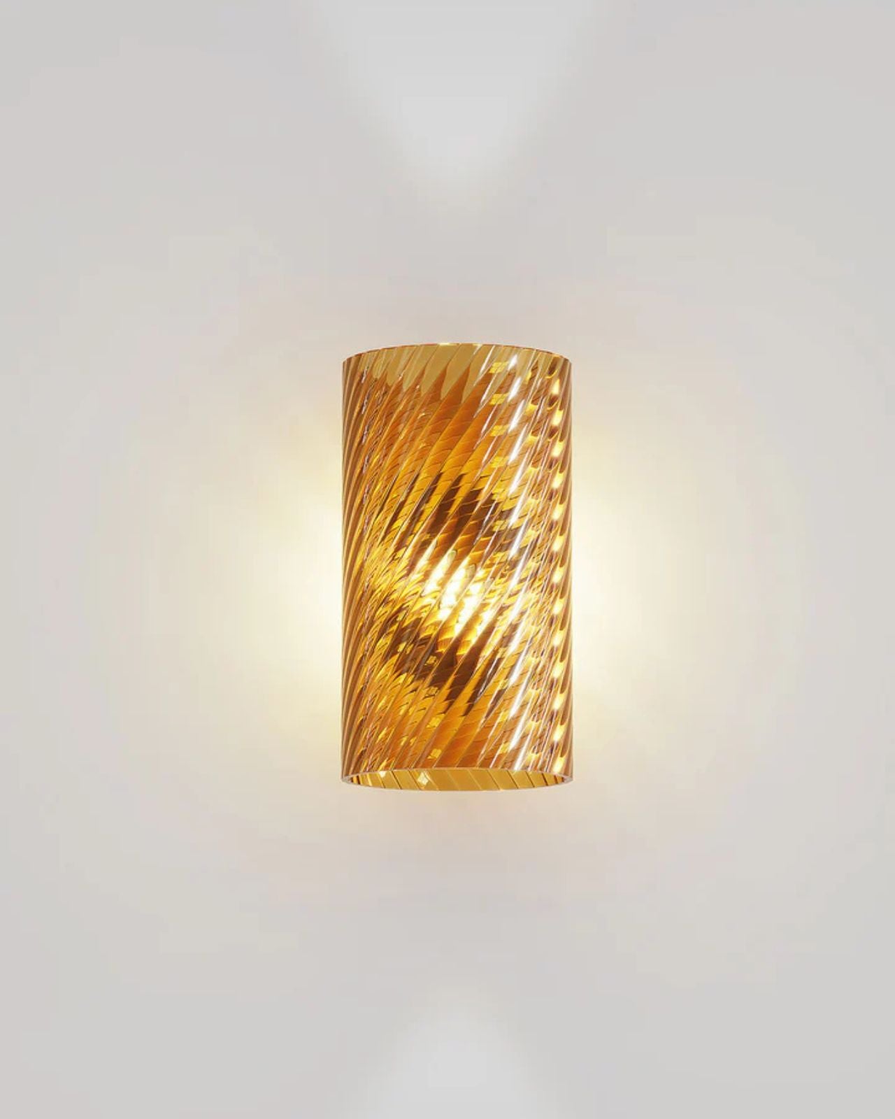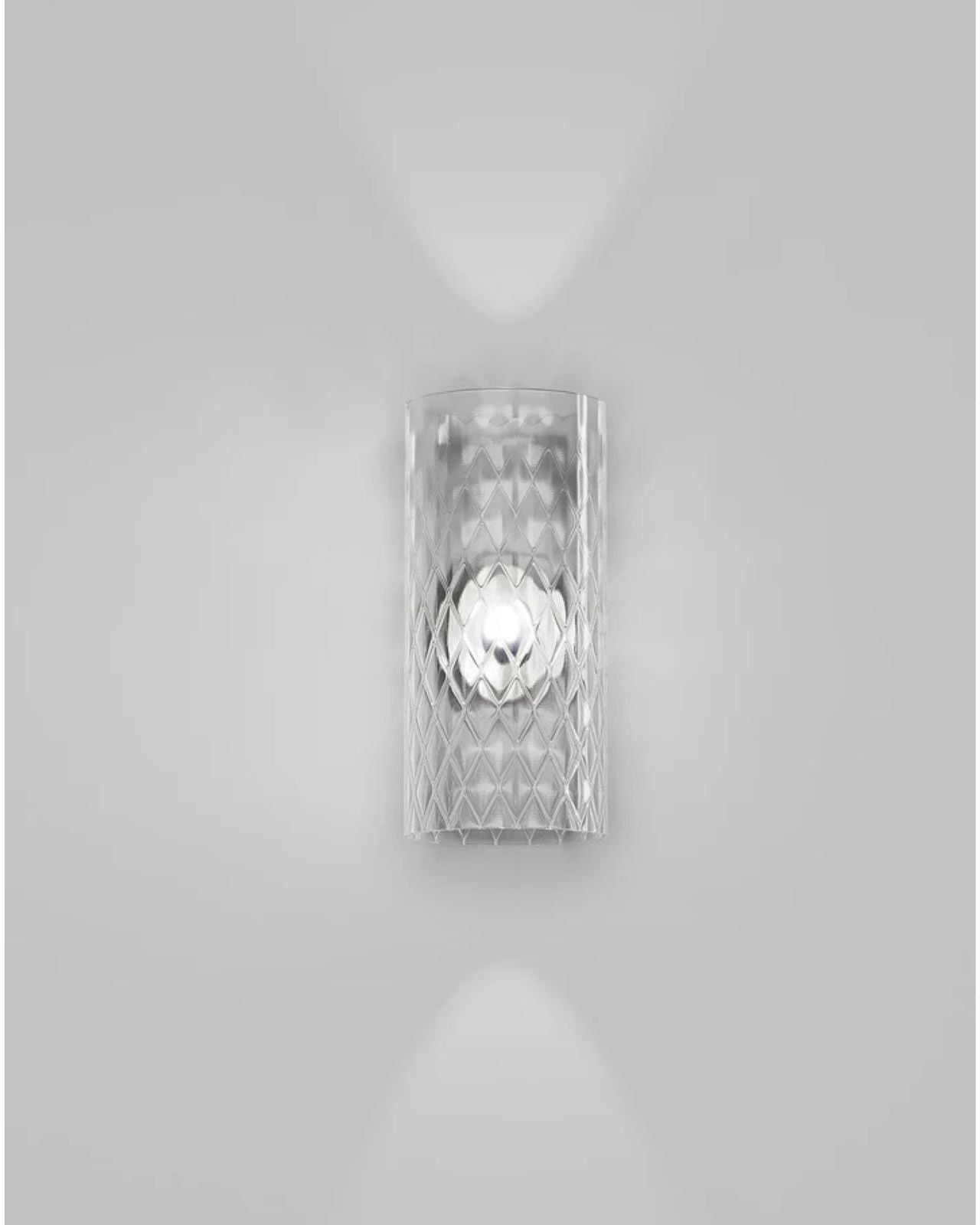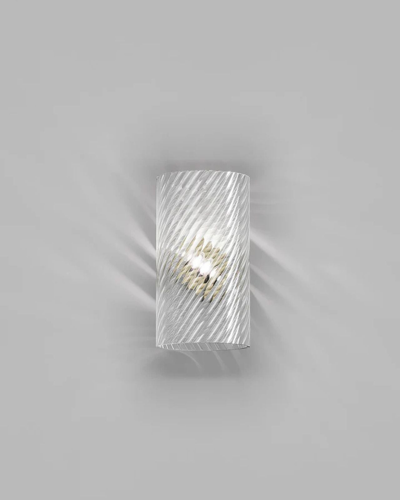 Crafted by Francesco Lucchese, this wall light is expertly made from metal and glass, using traditional techniques such as twisted "rigadin", "balloton", and straight designs. Produced in Italy, the cylindrical shade is offered in various crystal textures and colours, complementing the modern design of the fixture. Providing a warm, patterned light, this wall light is perfect for contemporary living spaces, hallways, foyers, or bedrooms.