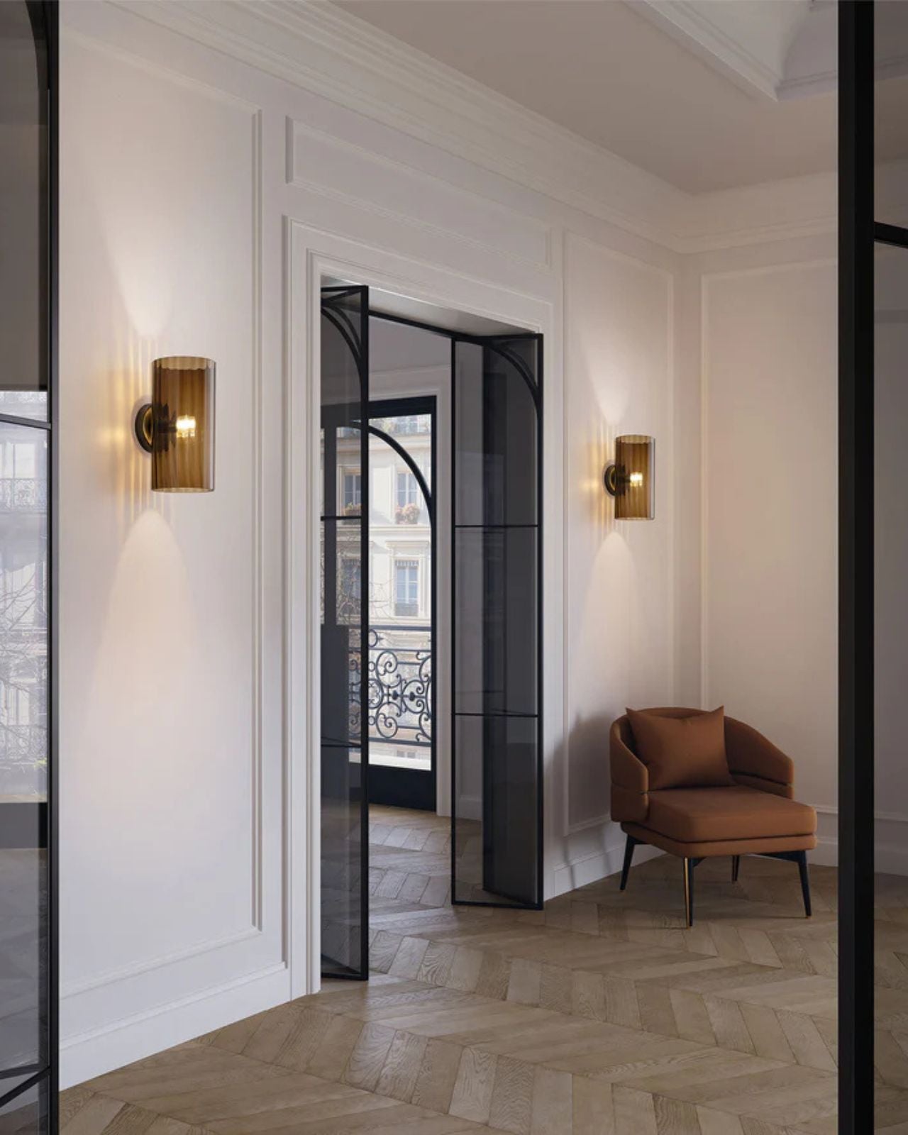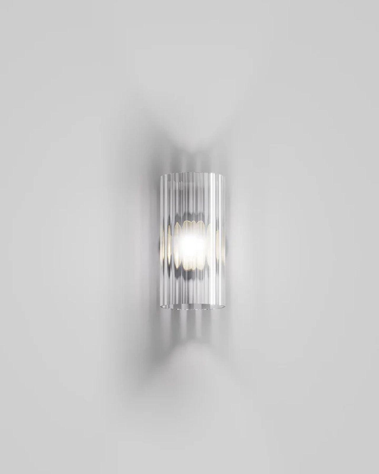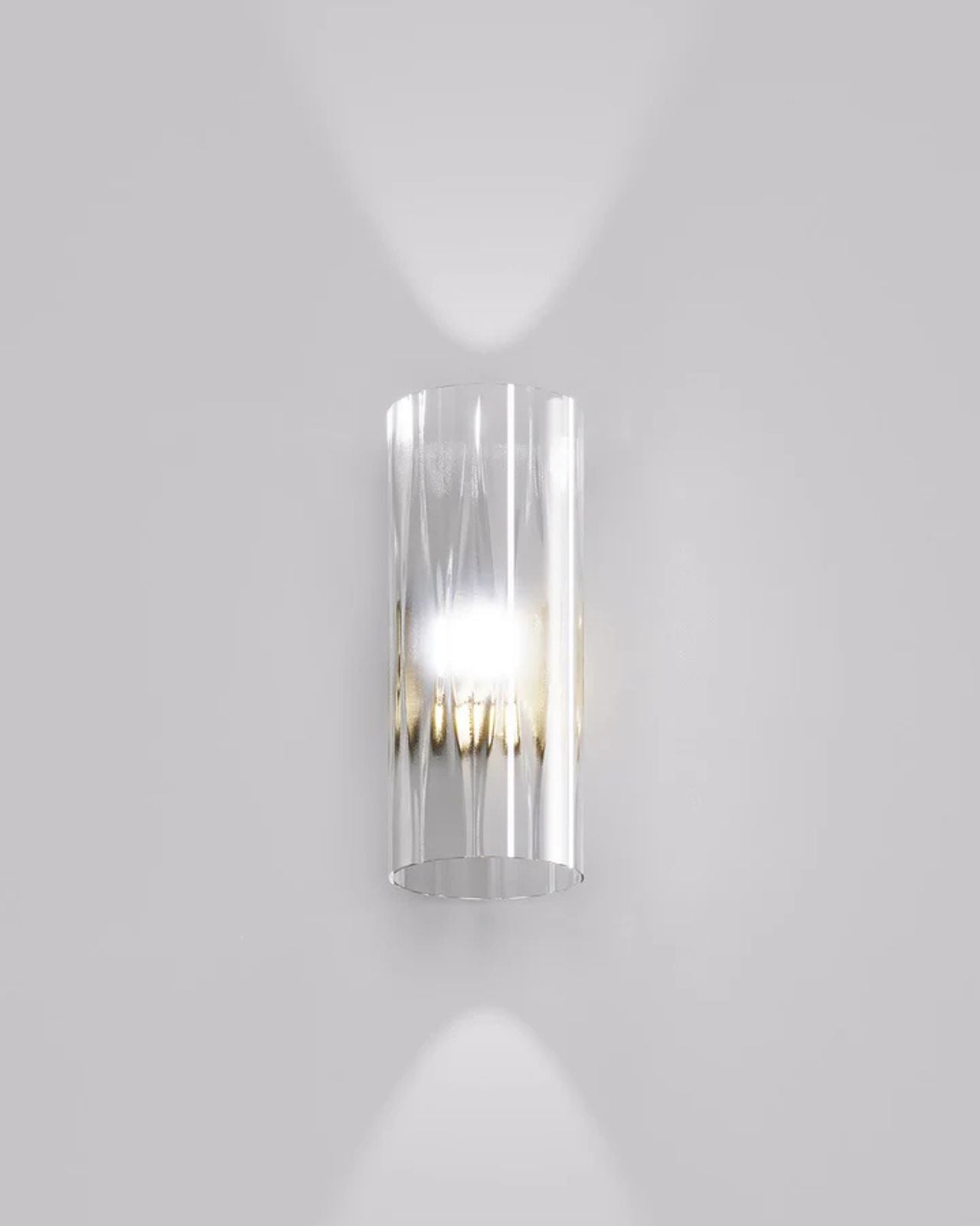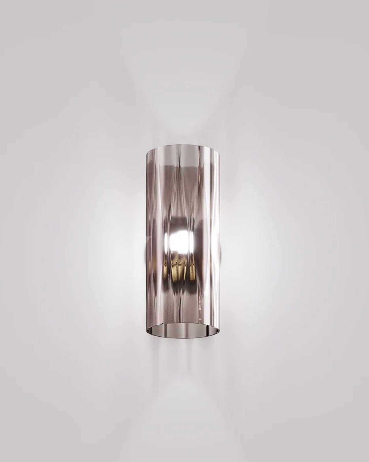 Crafted by Francesco Lucchese, this wall light is expertly made from metal and glass, using traditional techniques such as twisted "rigadin", "balloton", and straight designs. Produced in Italy, the cylindrical shade is offered in various crystal textures and colours, complementing the modern design of the fixture. Providing a warm, patterned light, this wall light is perfect for contemporary living spaces, hallways, foyers, or bedrooms.