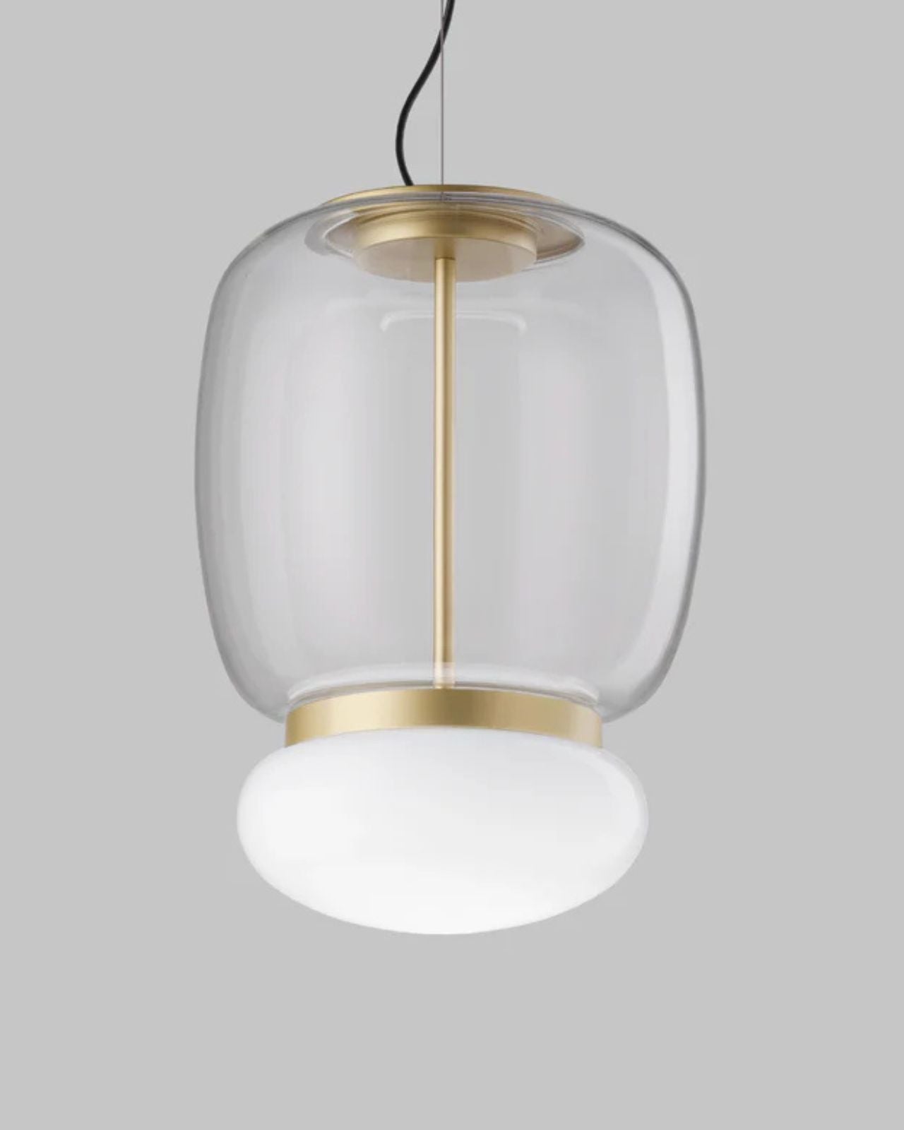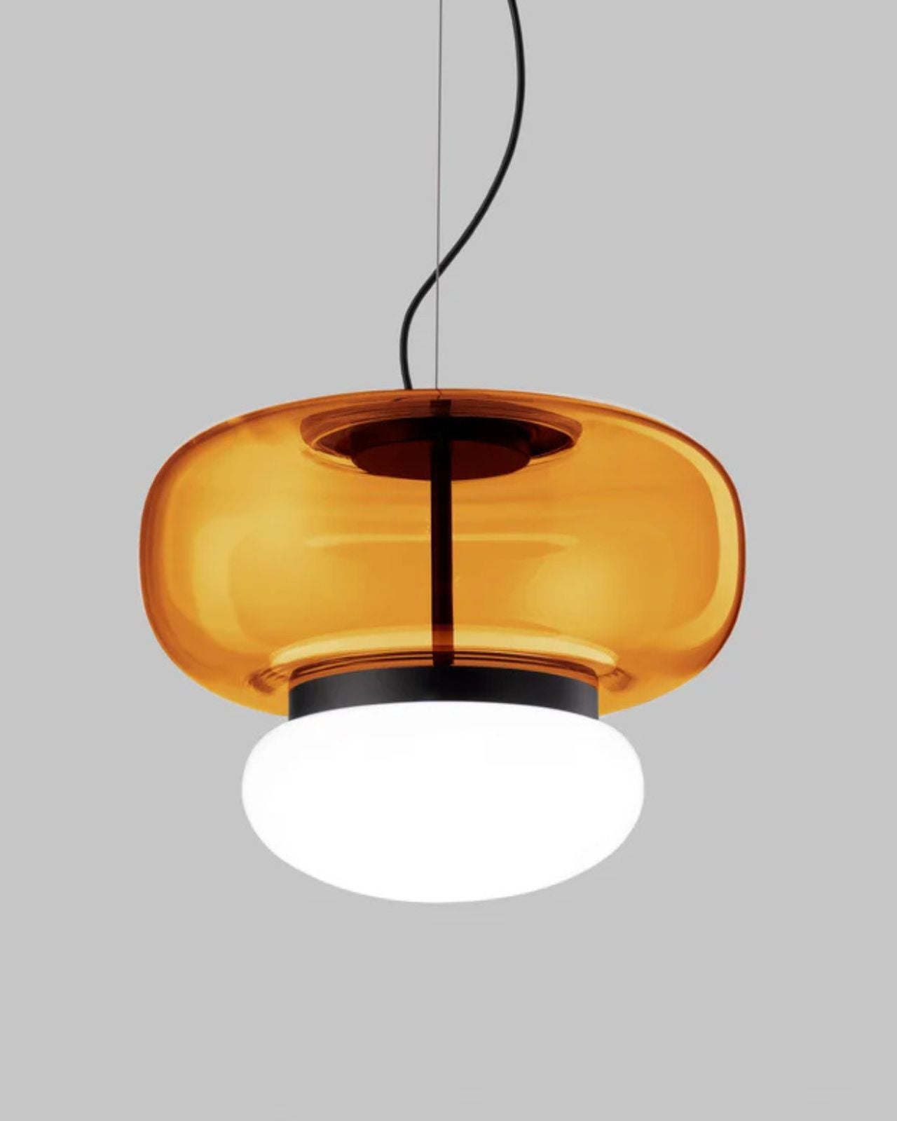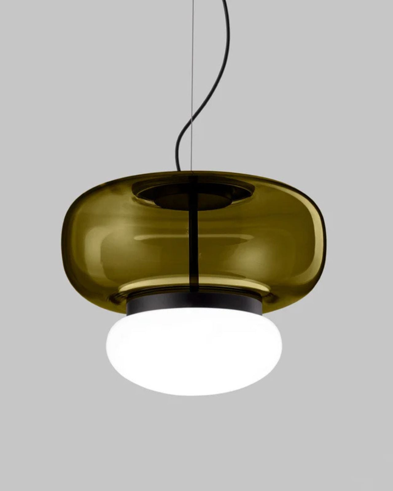 Expertly crafted in Italy by designer Oriano Favaretto, this pendant showcases stunning dual hand-blown Murano glass shades. The first shade, available in green, dark amber, burned earth, or clear, brings to mind the tranquil Venetian lagoon. The second shade boasts a glossy white opaque finish, reminiscent of the mainland, providing a gentle and diffused light in any interior. Both shades are connected by a sleek metal ring in either matte black or painted brass. This pendant will become an exquisite focal point with in any interior.
