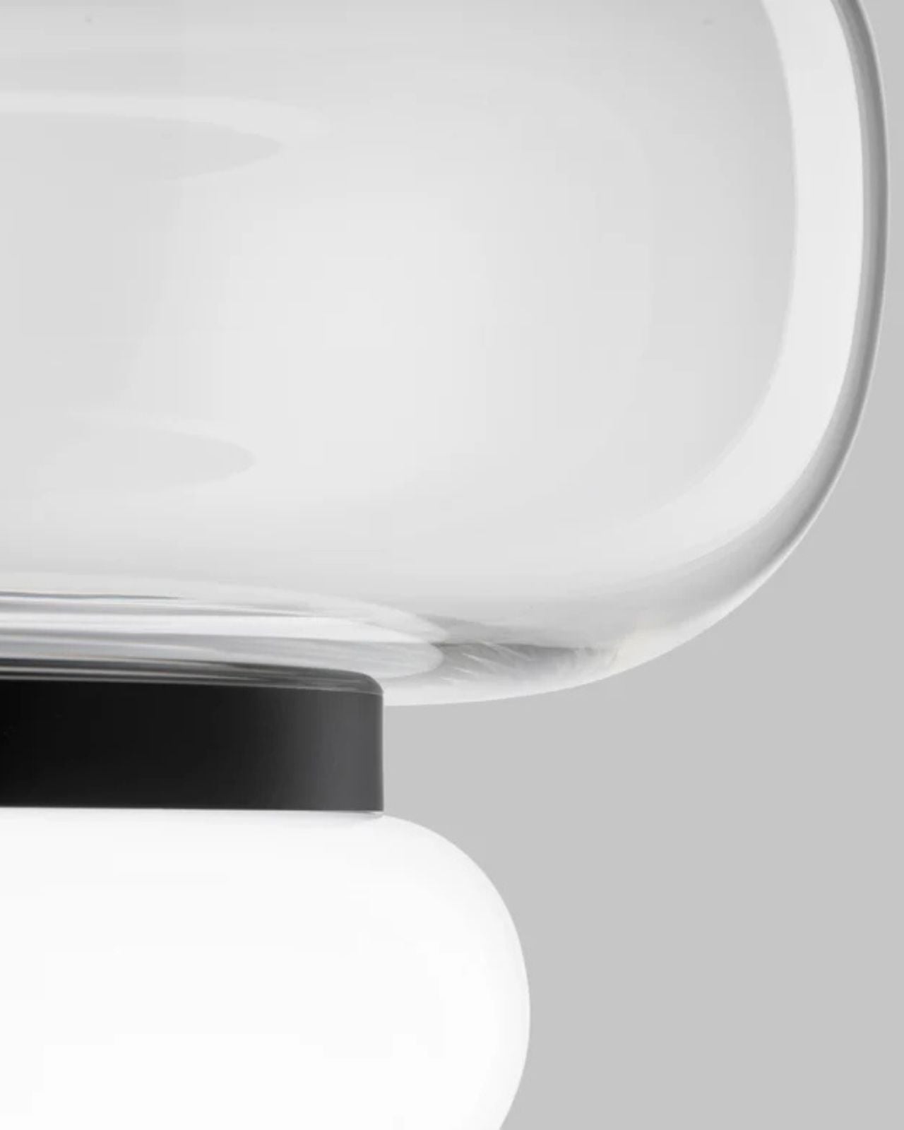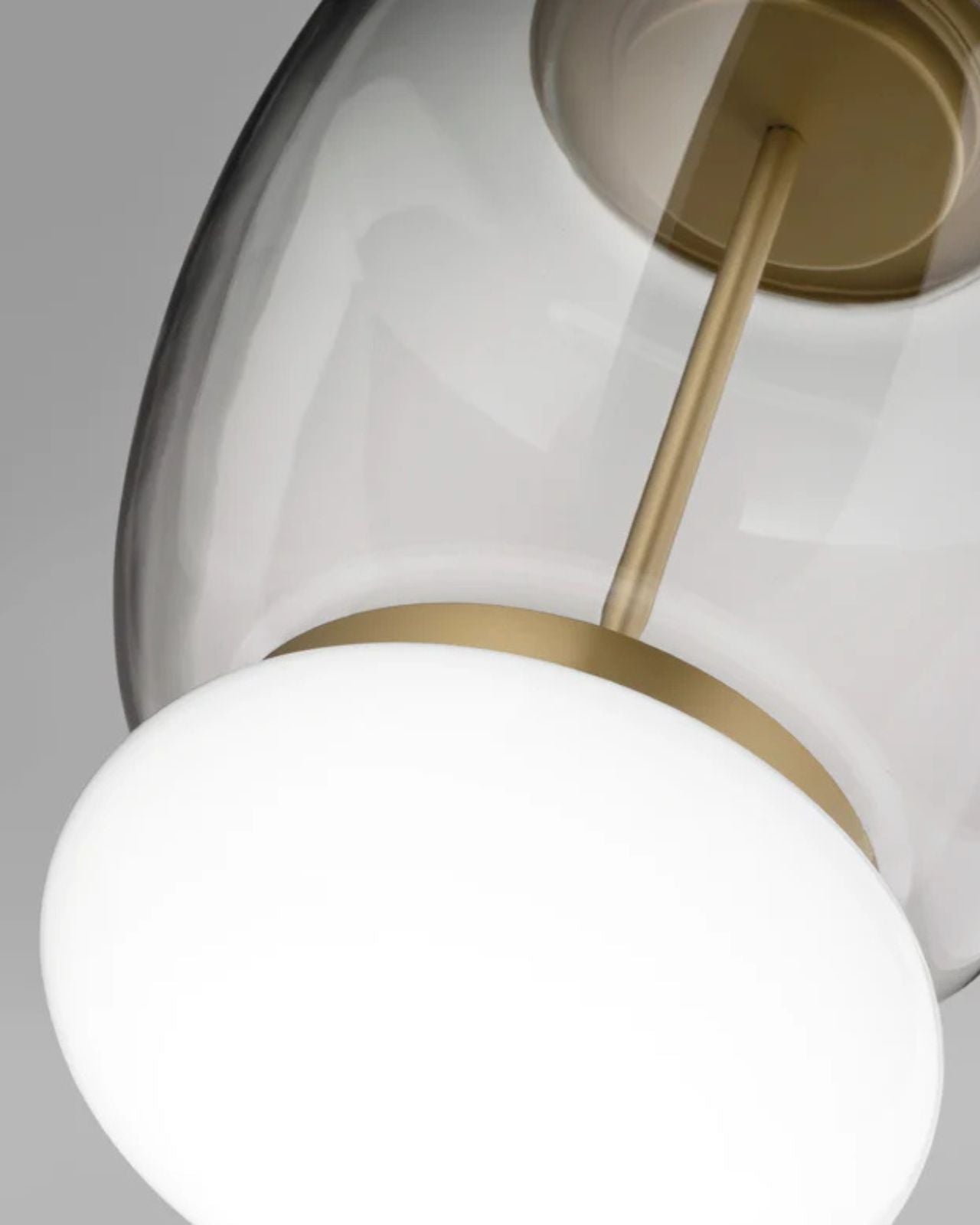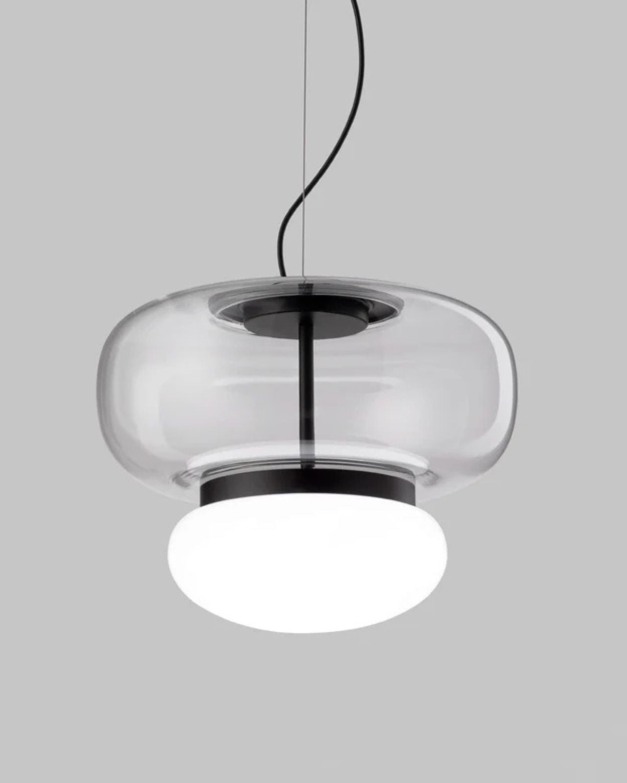 Expertly crafted in Italy by designer Oriano Favaretto, this pendant showcases stunning dual hand-blown Murano glass shades. The first shade, available in green, dark amber, burned earth, or clear, brings to mind the tranquil Venetian lagoon. The second shade boasts a glossy white opaque finish, reminiscent of the mainland, providing a gentle and diffused light in any interior. Both shades are connected by a sleek metal ring in either matte black or painted brass. This pendant will become an exquisite focal point with in any interior.