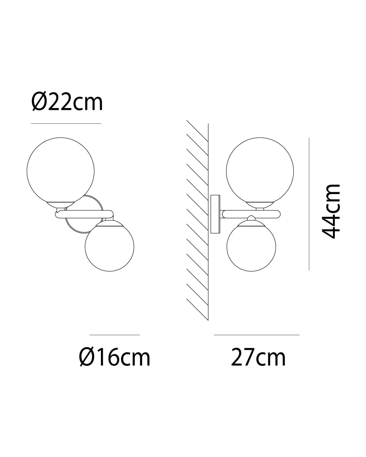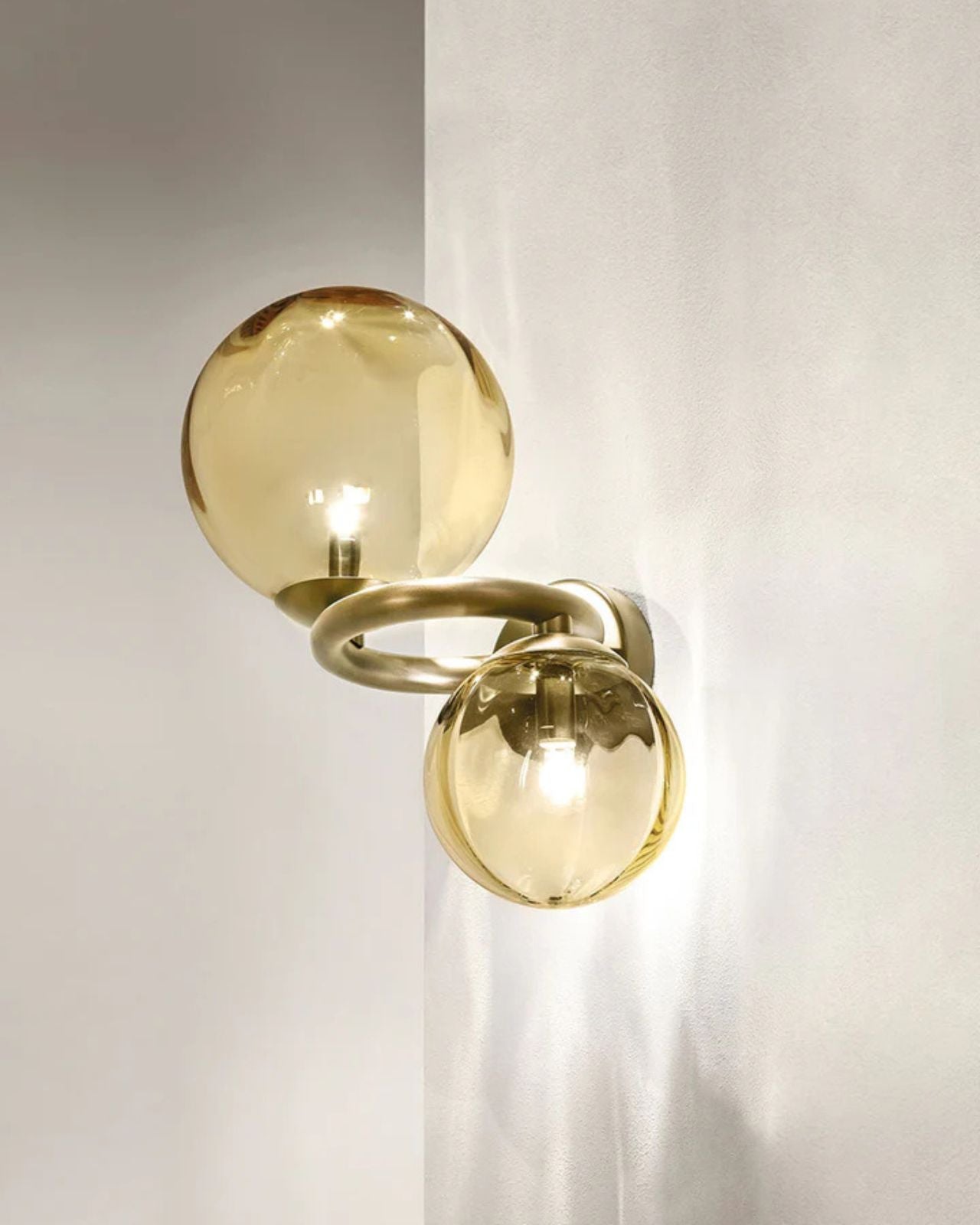 This wall light is a modern and elegant design that features two spheres suspended on a ring. It is crafted from Italian mouth-blown Murano glass with the utmost precision and care. The light emitted from this wall light is warm and soft, and it creates an inviting atmosphere in any space. The Italian hand-blown glass used in this piece is of exceptional quality, making it a sleek and on-trend addition to interiors.