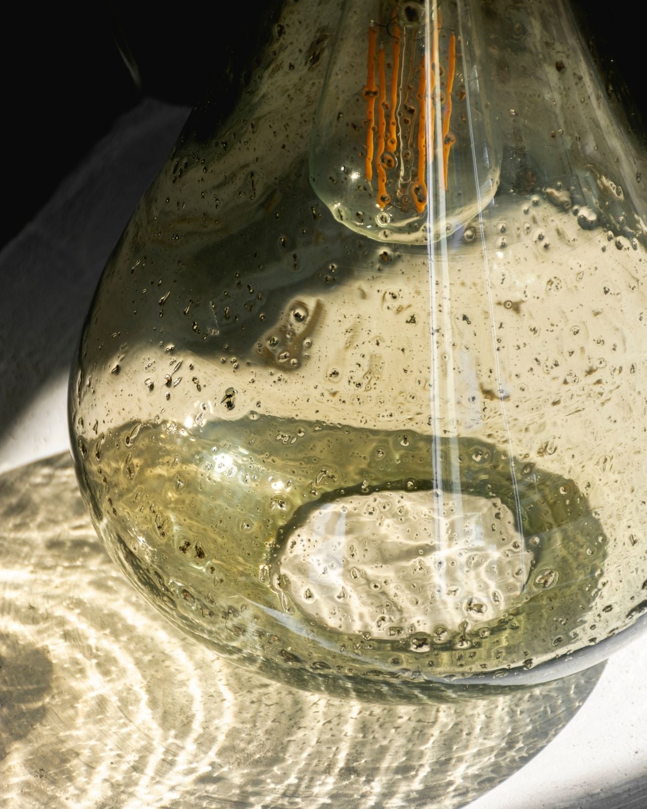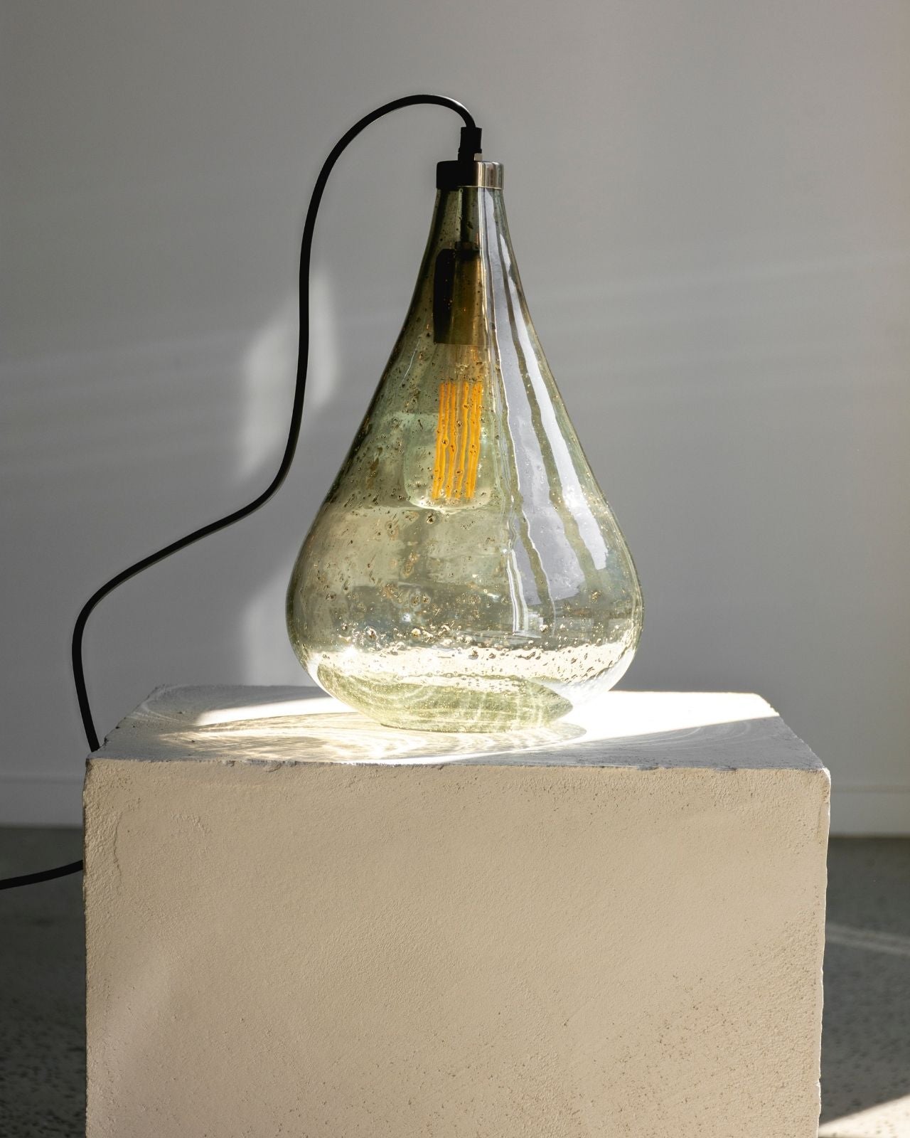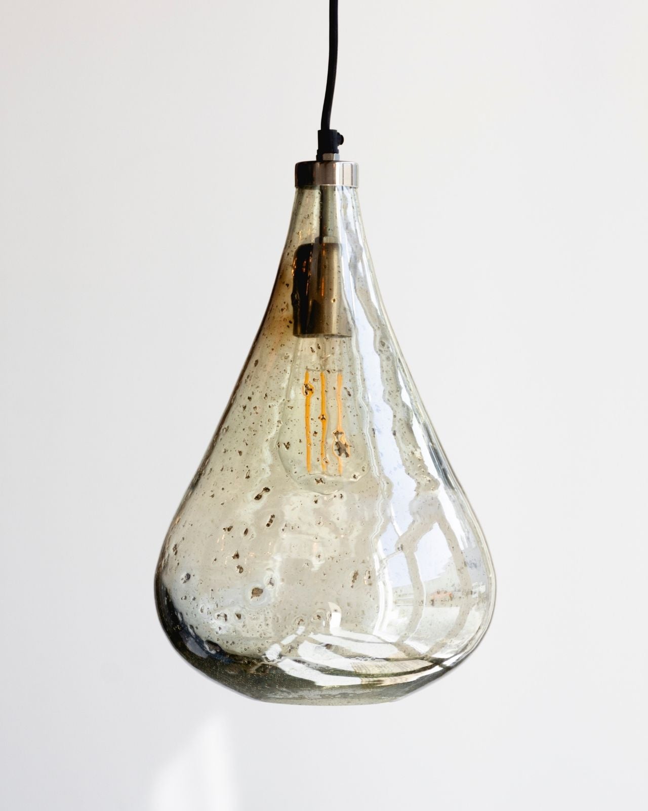 The Lustre Teardrop Stone Glass Pendant Lights are hand-blown into a classic teardrop shape, with a stone effect through the glass giving it a wonderful organic texture, while the lustre of the glass finishes it into an elegant light. This light is available in 3 colours (Clear, Pale Gold, and Pale Green).