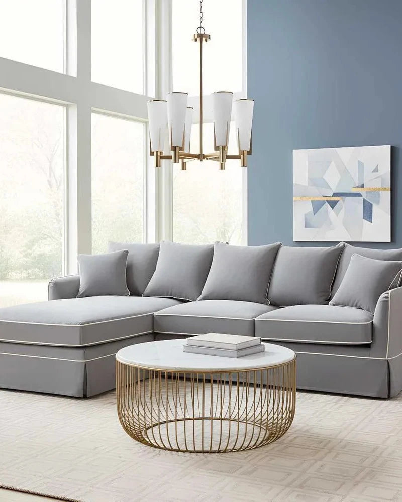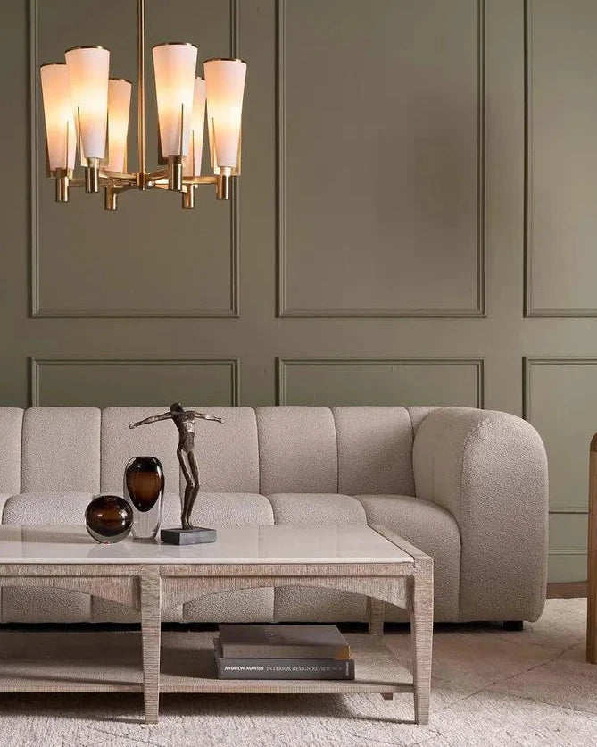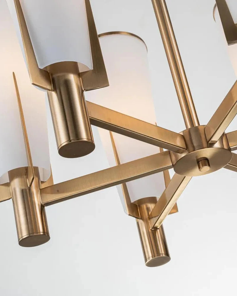 Made from robust iron with a brass finish, this chandelier inspired from Hamptons and mid-century styles with a modern twist will make a statement in bedrooms, living rooms, dining rooms or entrance halls. Elevating interiors with style and grace, this luminary masterpiece features a sleek structure adorned with six shades made from frosted tapered glass and it will spread a functional yet pleasant light around.