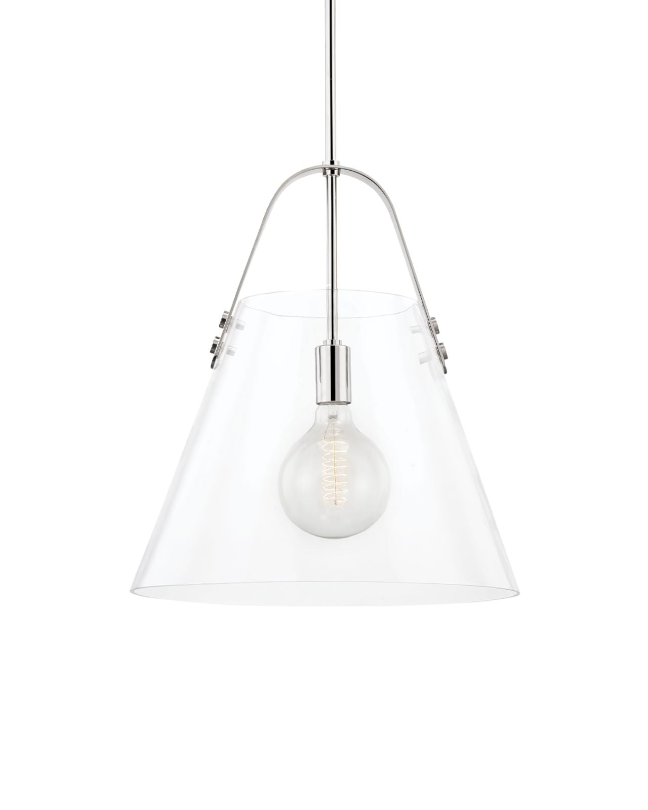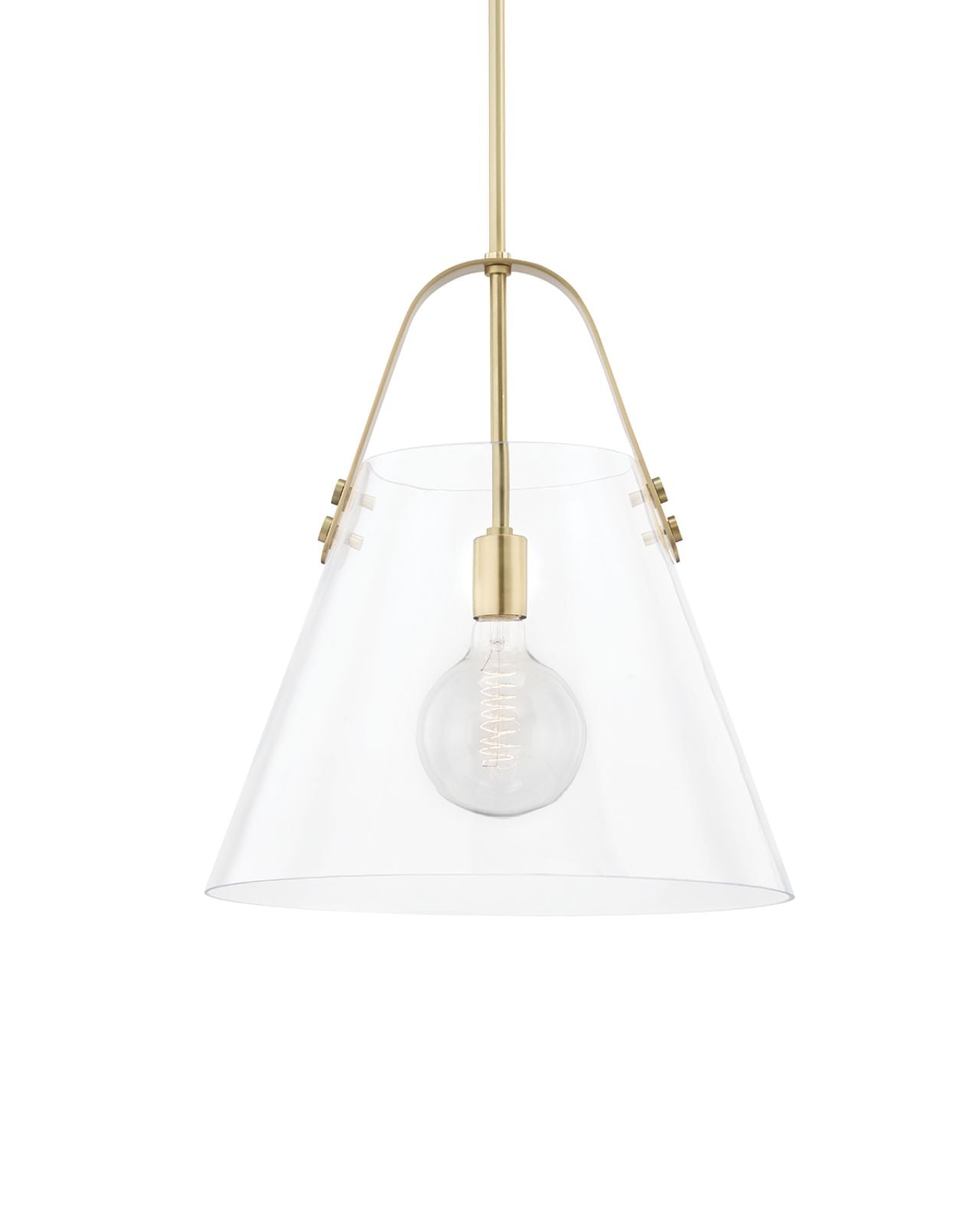 This stunning simplistic glass pendant boasts a translucent conical shade and metallic features. Creating a uniquely beautiful piece suited to a variety of spaces. Available in both small and large and with either aged brass or polished nickel. Cast shadows and soft lighting through an elegant filament bulb.