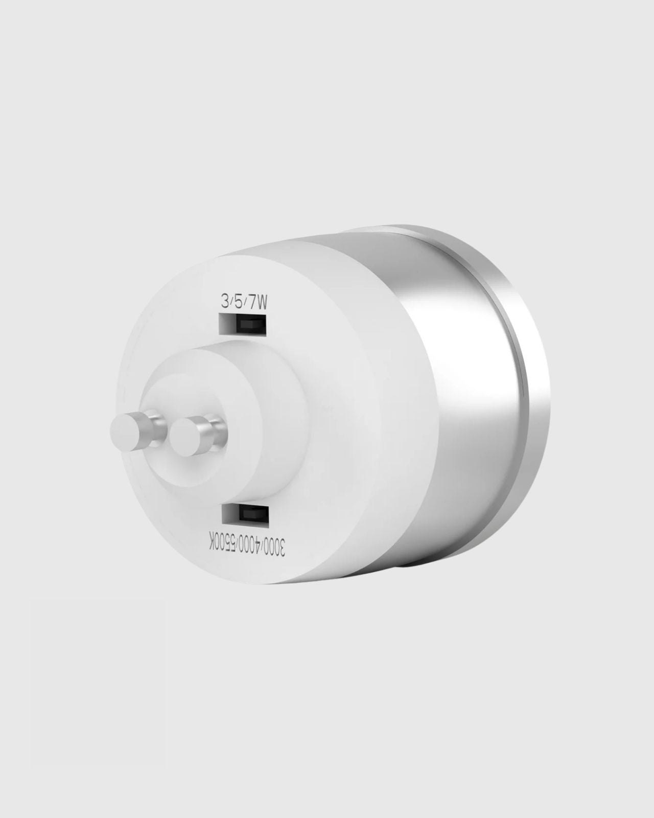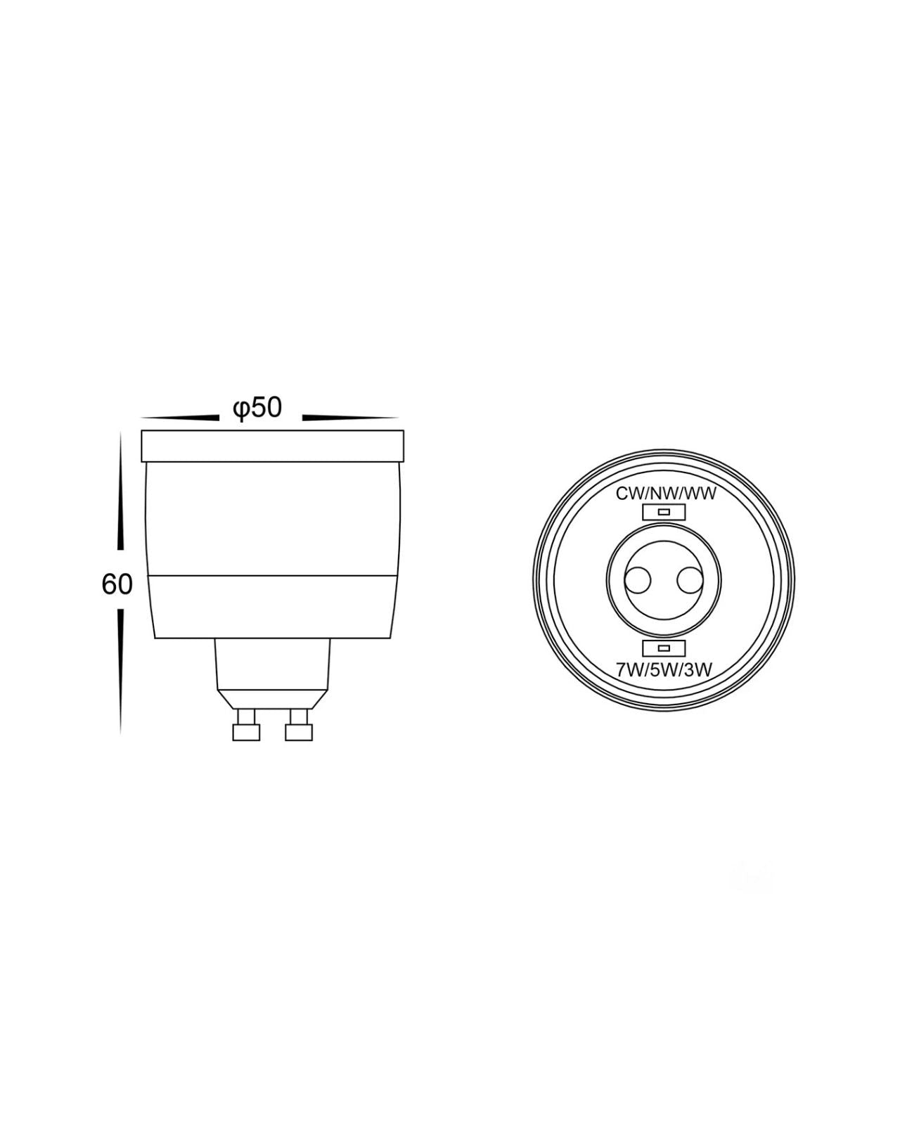 This GU10 is equipped with the ability to be set to 3, 5, or 7 watts.  The colour temperature of the globe can also be selected from 3000k, 4000k, and 5500k with the flick of a button at the bottom of the globe.