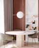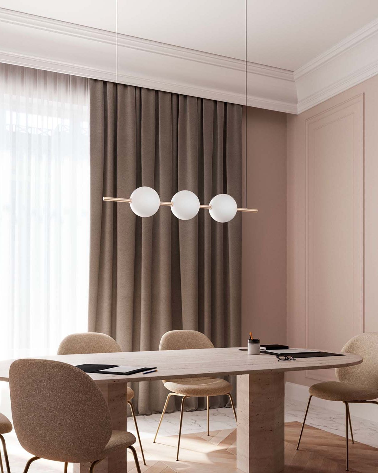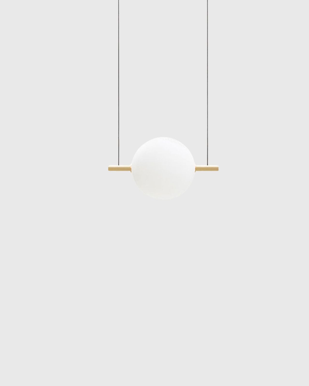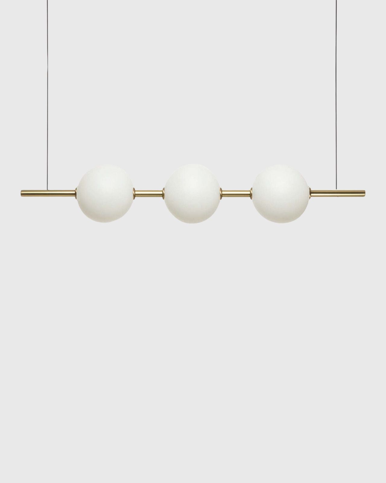 A suggestive fusion of glass and brass, this beautifully created pendant suits contemporary, modern interiors. Beaming with intense light given off by the dimmable LED light source. The balanced geometry gives a sense of stability lightened by the suspended light spheres.