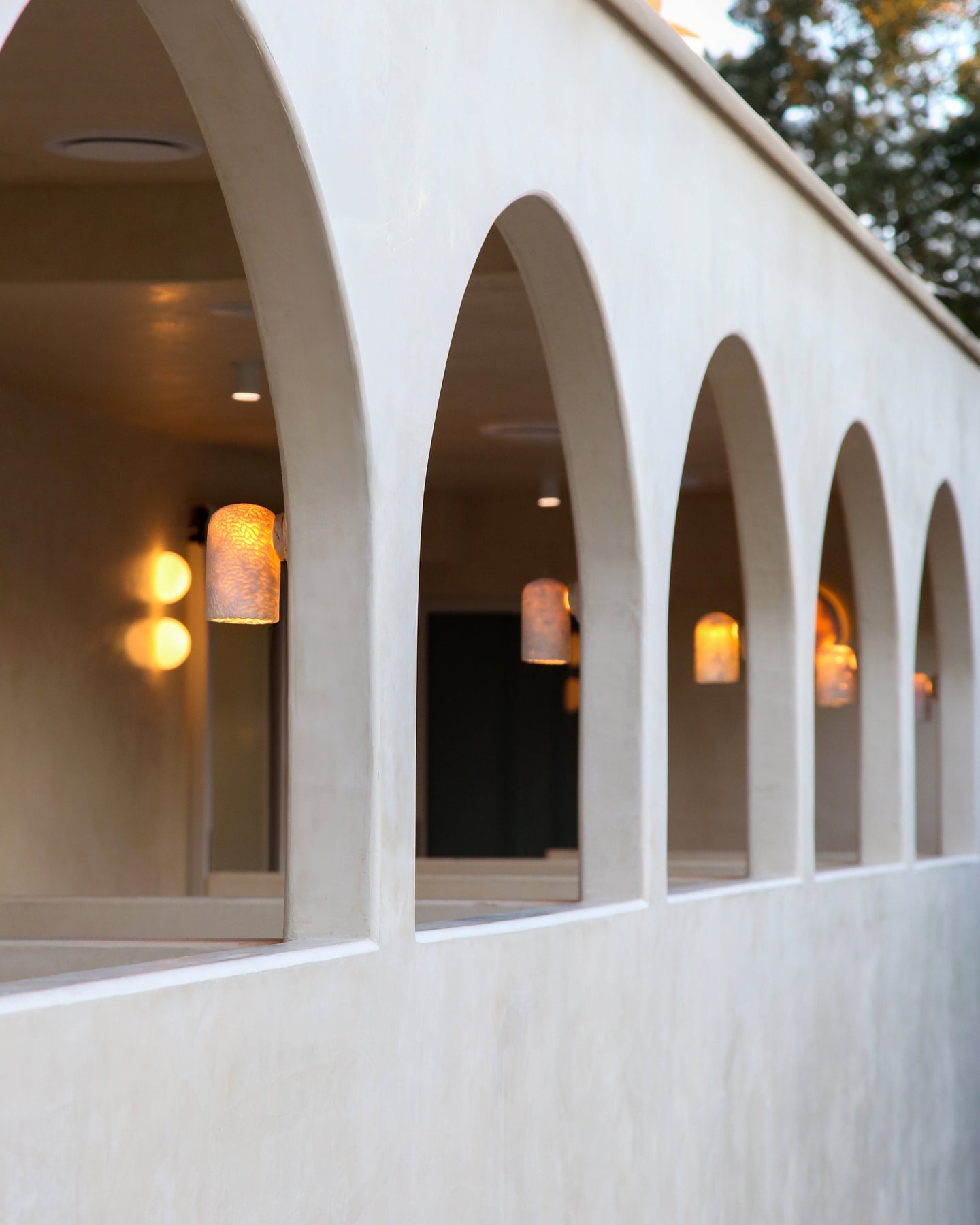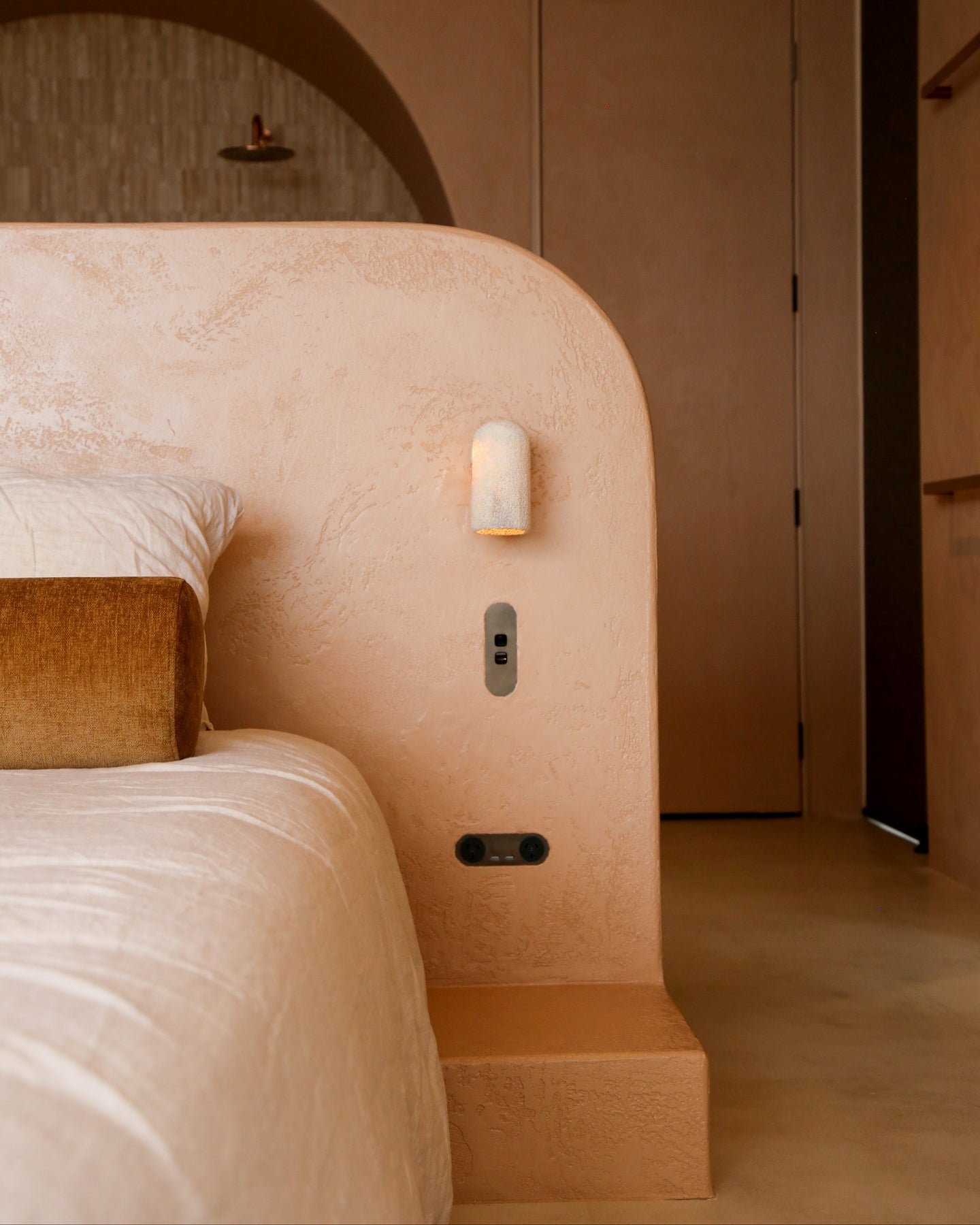 Ceramic wall sconce emitting a warm glow on a beige wall