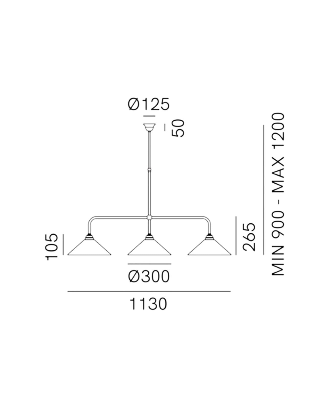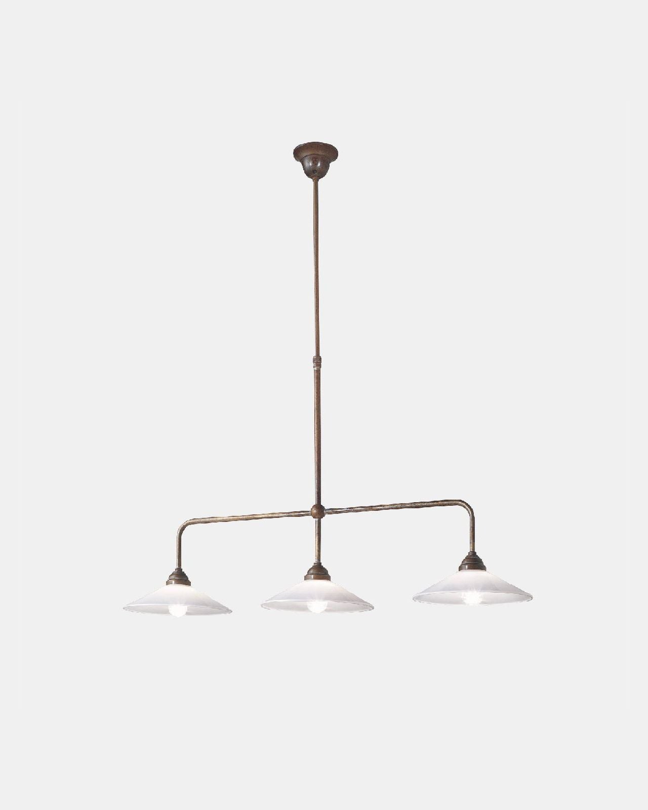 Elevate any dining, kitchen, or living space with this linear pendant. Crafted with pre-aged brass and white blown glass, it offers a charming, rustic modern look. Boasting a maximum drop of 1100mm and a sleek tube design, three conical shades lend a warm light to both traditional and modern interiors.