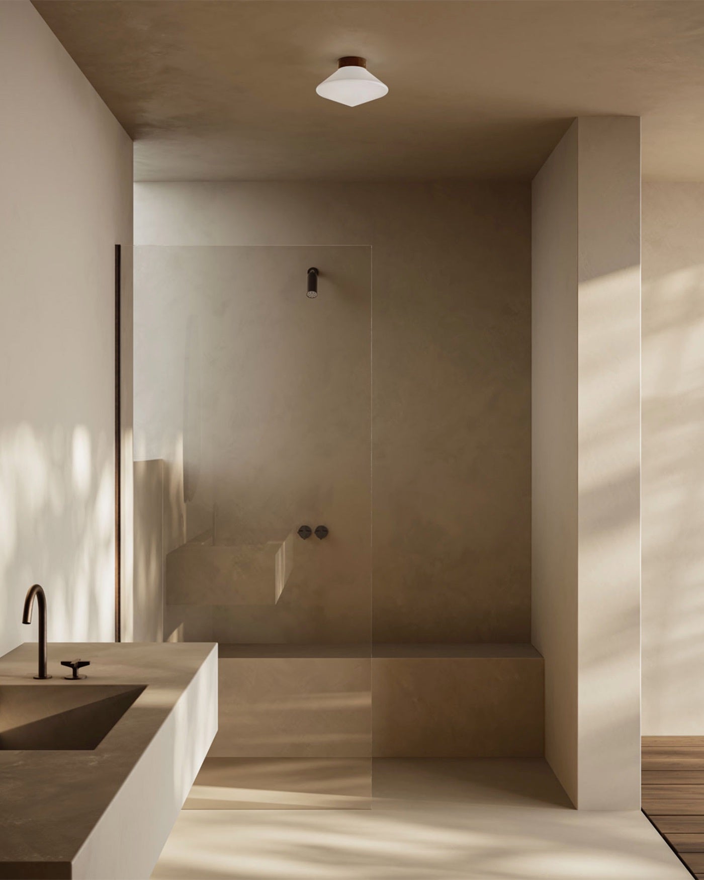 Diamond shaped ceiling light placed in a minimalist bathroom
