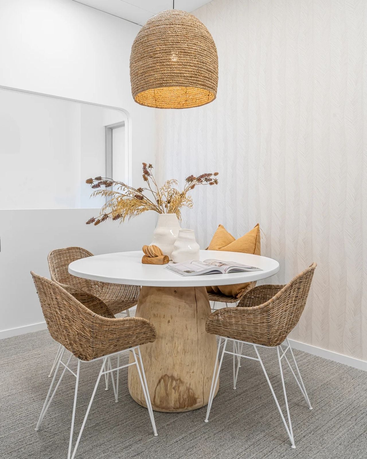 Modern dining area with a white round table and wooden chairs, featuring a rattan teardrop pendant