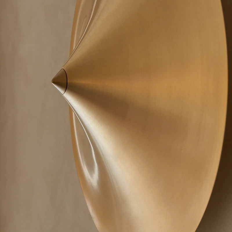Made from steel and finished in either a Matte Brass or Black finish this cymbal-like circular wall light will bring a simplistic yet striking design feature to interior spaces. With a central raised point and smooth shape, this steel wall light is designed to be installed singularly or as a pair.
