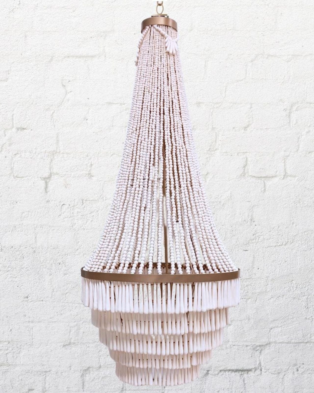 Beaded chandelier with a metal fixture and white beads