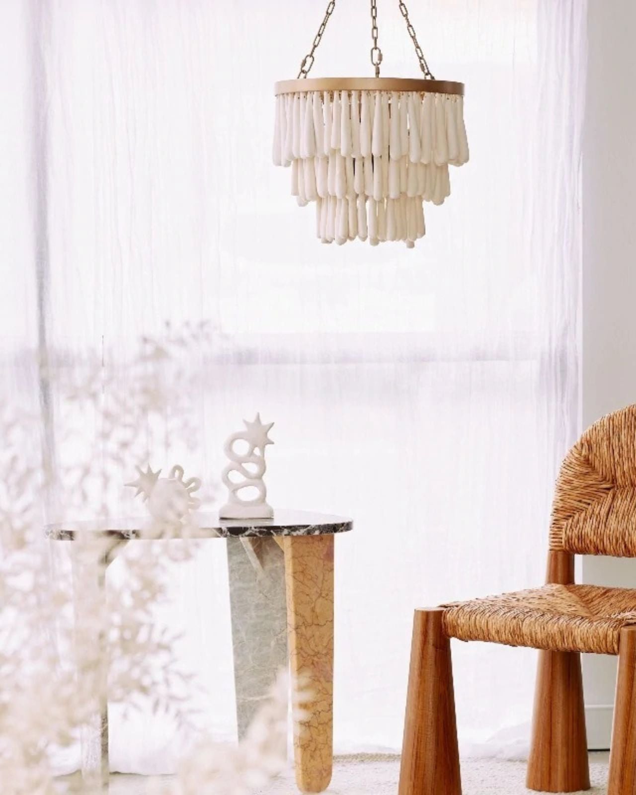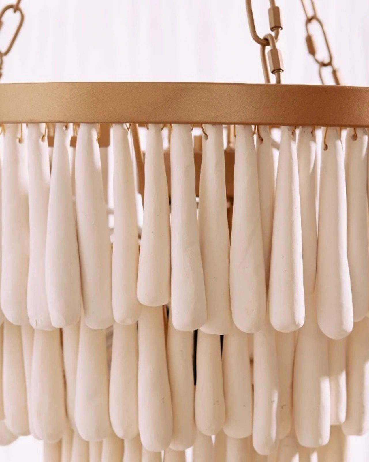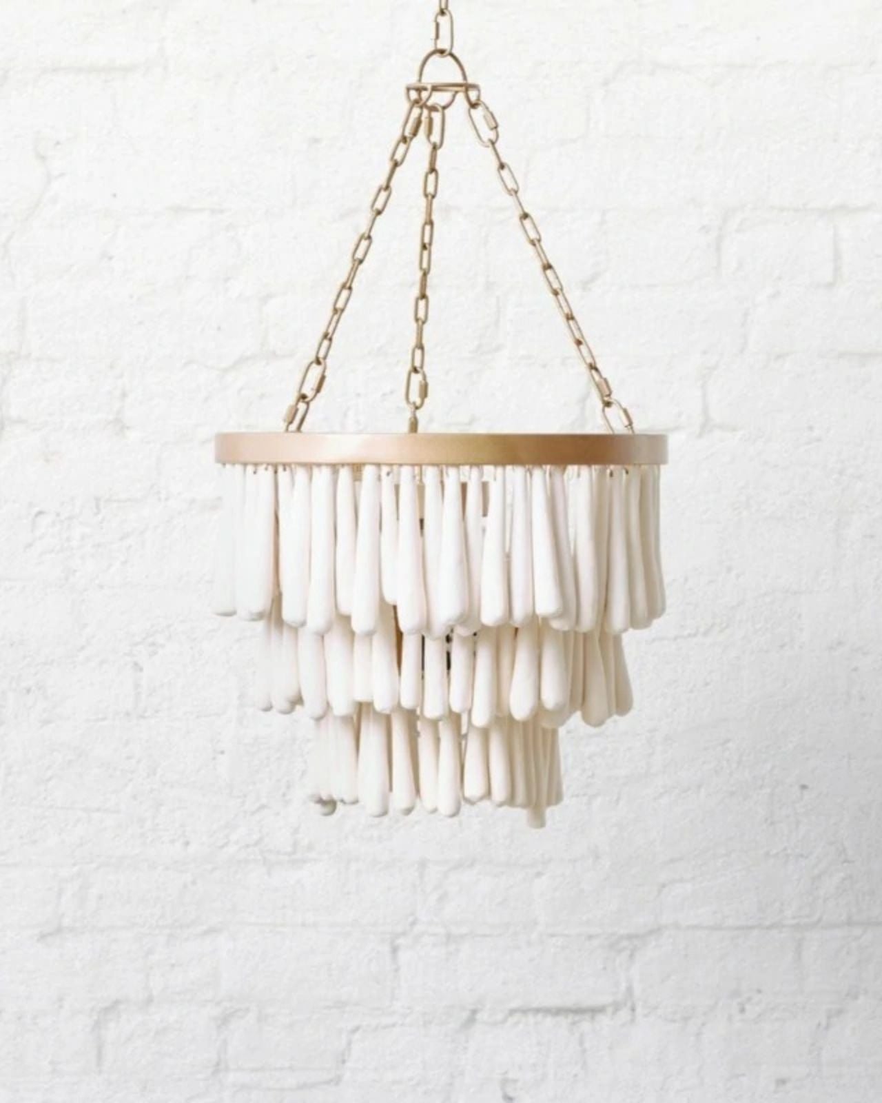 This romantic design will become an artistic focal point within any interior. Comprised of individually rolled clay beads that are kiln fired, dip-dyed and then threaded onto a wrought wireframe. Its layered clay form will add beautiful texture to dining rooms, master bedrooms and entranceways. This design is ideal for lower ceilings and can be installed flush against the ceiling or lower with its chain suspension. Handmade by an African community in Kwazulu Natal.