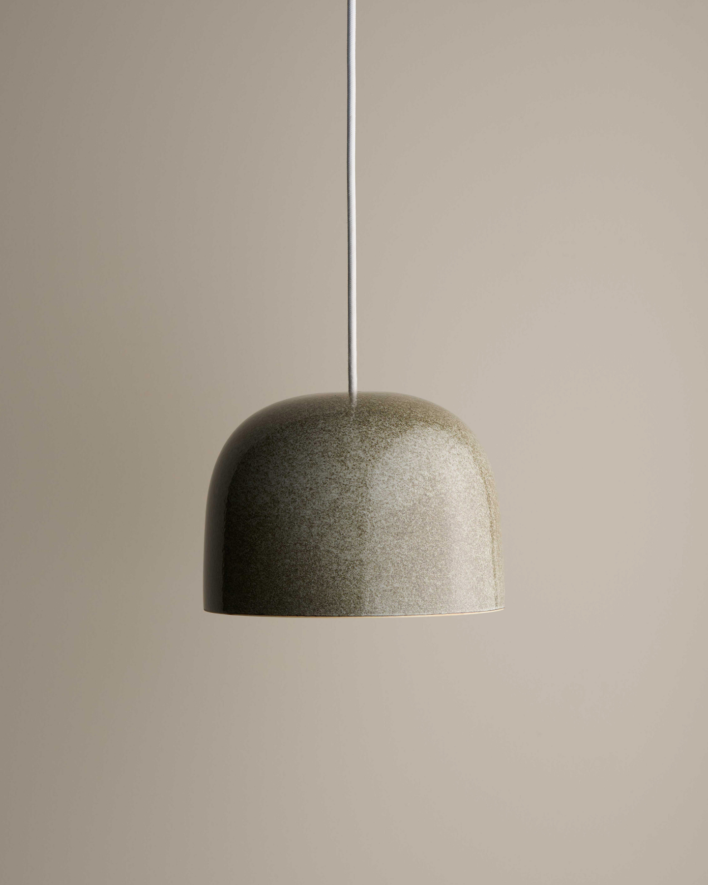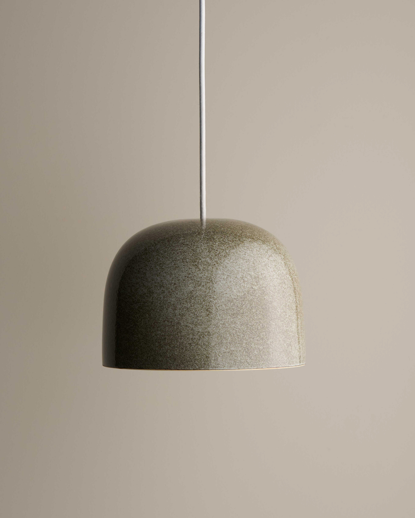 Green ceramic pendant light against a beige wall