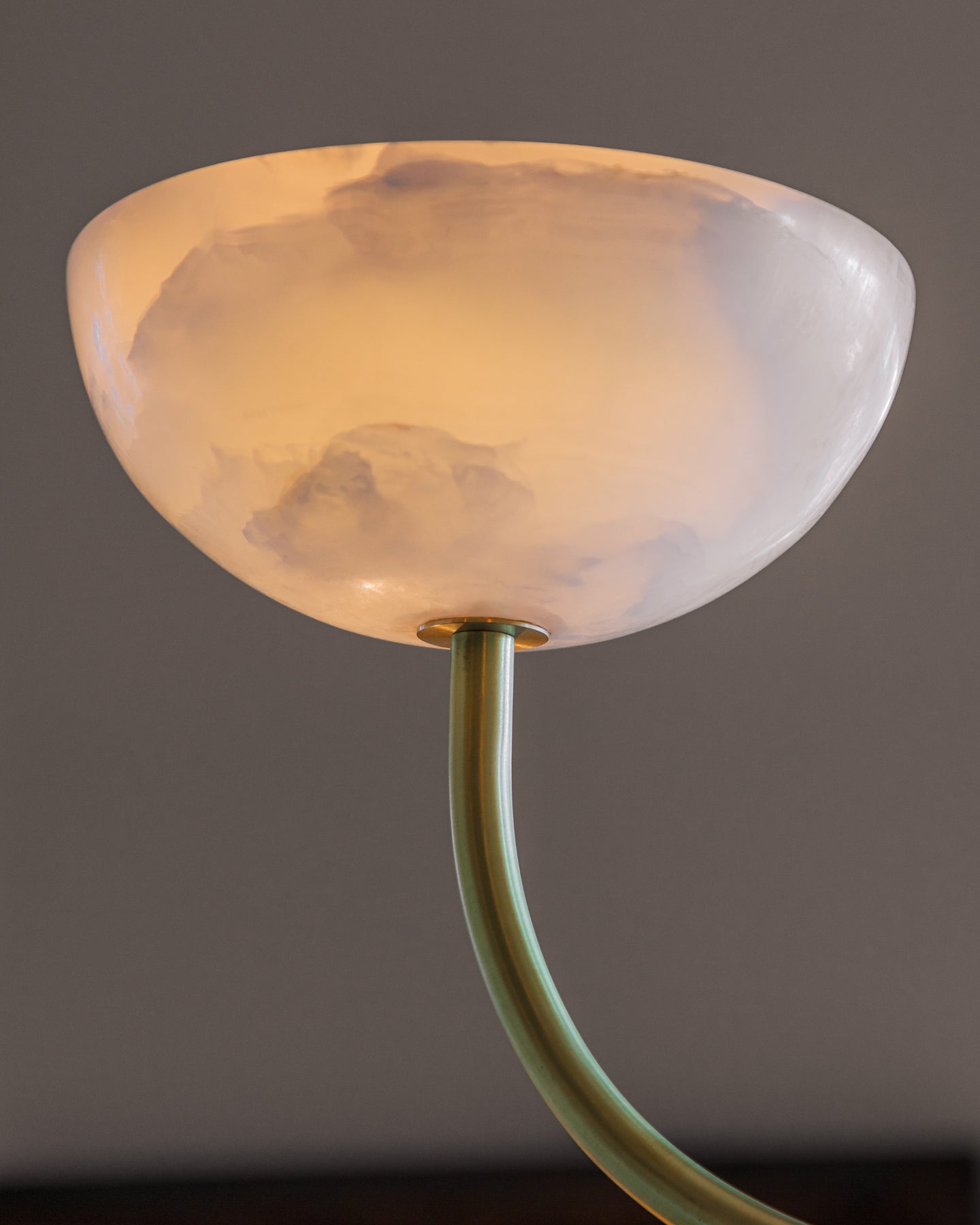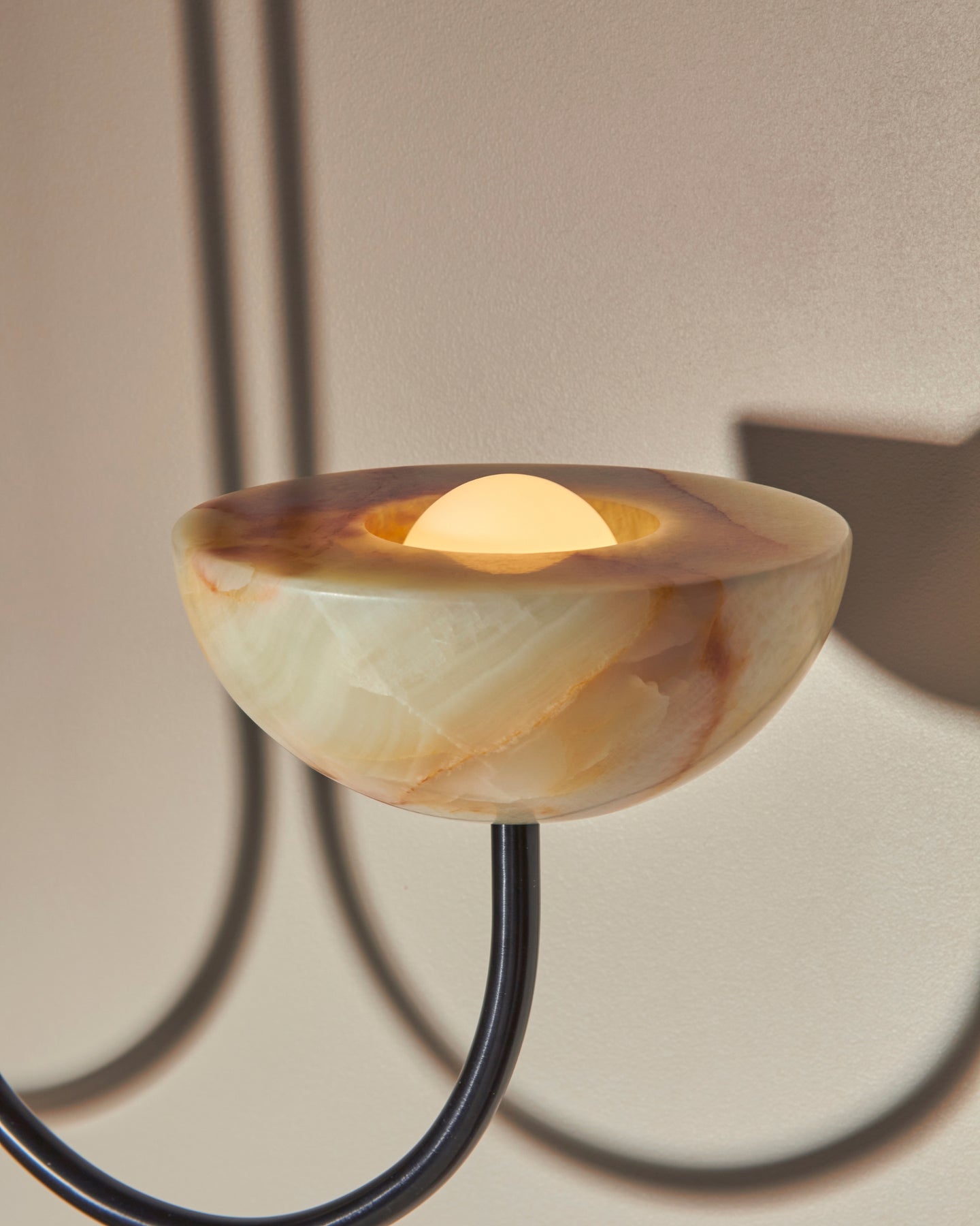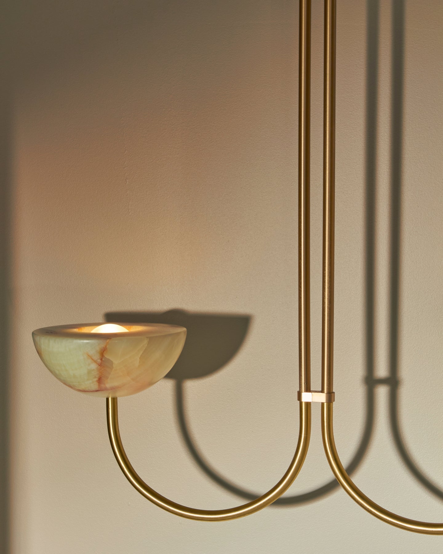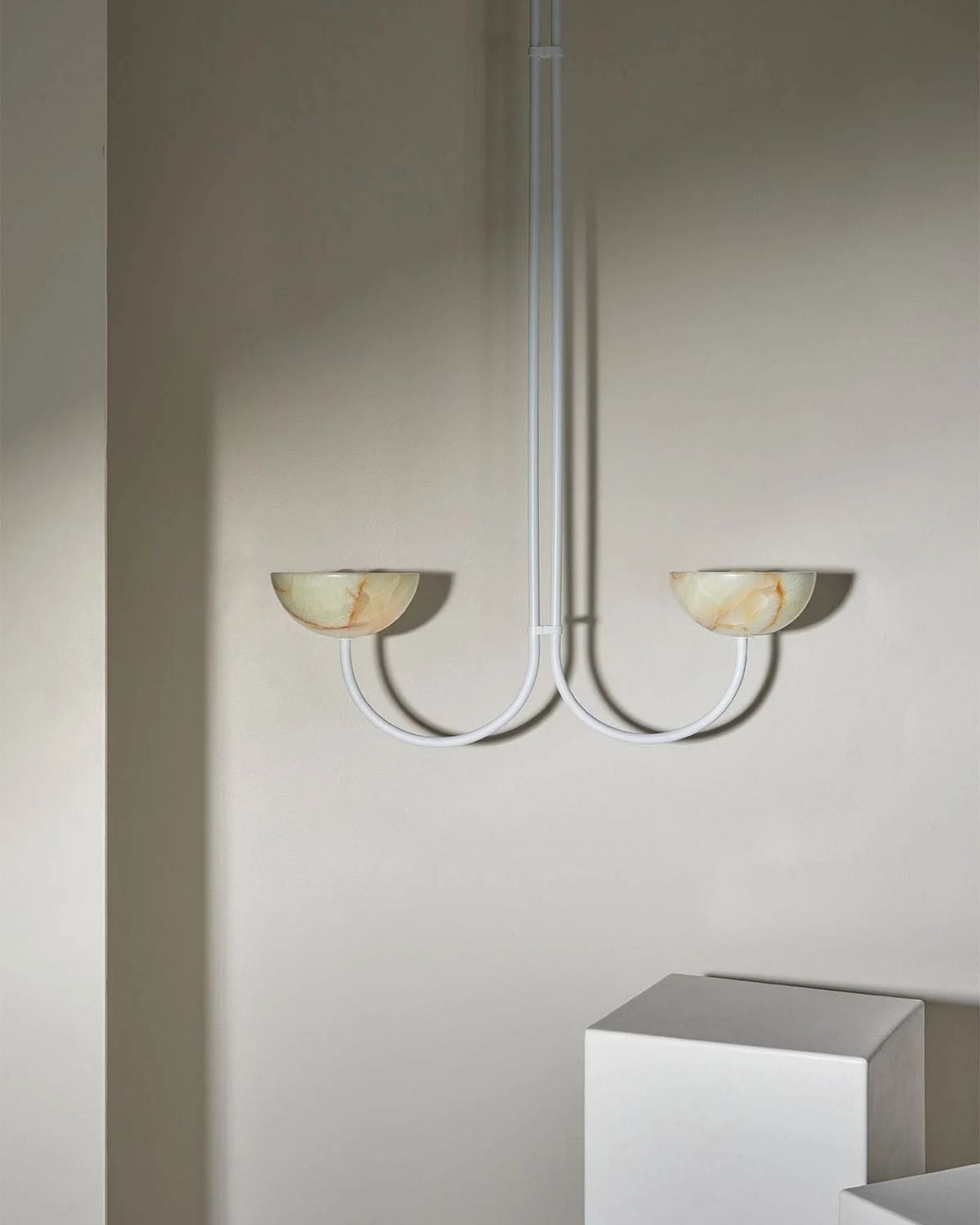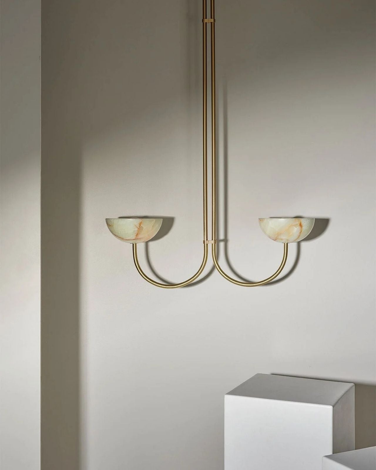 This symmetrical double dome pendant is a contemporary version of a classic chandelier with shades turned upside down for stunning soft illumination. This fixture is made from jade or white onyx and is paired with solid metal rods available in three finishes, brass, brushed black or white finish. Ideal in living rooms, dining rooms or restaurants, this pendant will bring a celestial and refined touch to the surroundings.