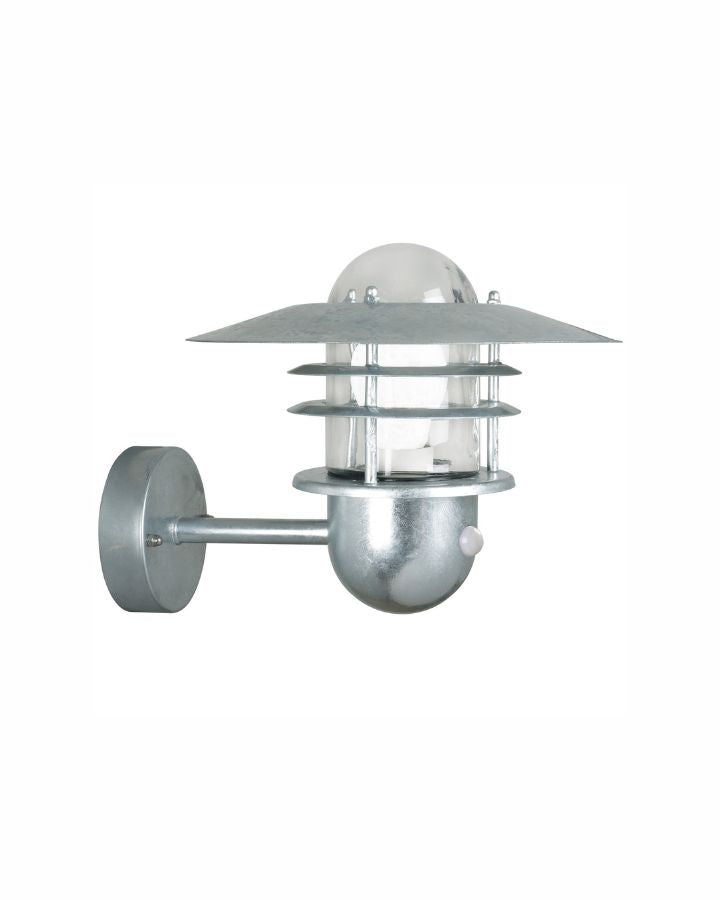 The Contemporary Steel Wall Light with Sensor is an industrial style fitting in a Galvanised Steel finish. Featuring a cylindrical glass shade with a round shade on top, this light is ideal for exterior installation with an IP rating of IP54. Made from durable Steel, this wall light comes with a 15 year surface deterioration guarantee, making it suitable for seaside installation.