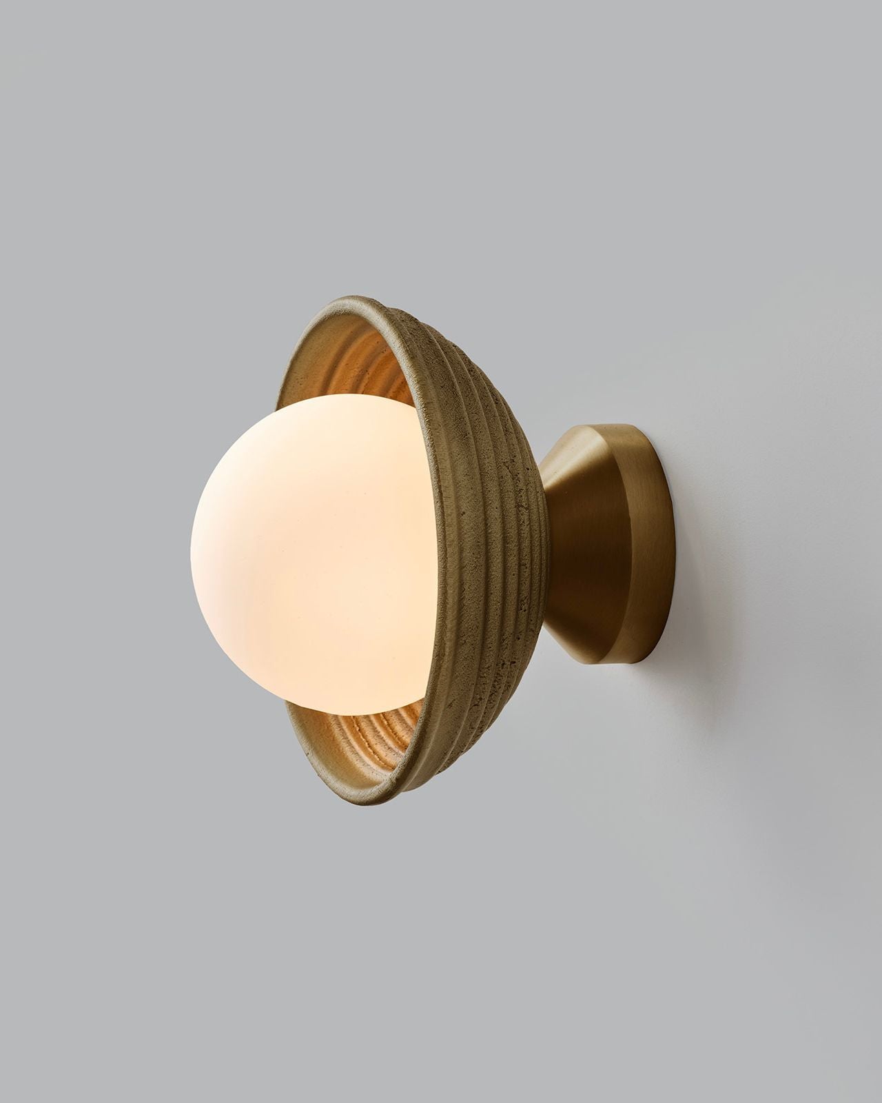 Hand-crafted in England, this wall light combines traditional sand-casting techniques with finely executed CNC-machined brass components. The softly textured cast metal shades contrast elegantly with crisp metallic detailing, while opal glass diffusers provide a warm, evenly dispersed light. Available in a selection of rich metal finishes, the fitting brings a timeless yet modern character to interiors, whether used as a singular statement or repeated rhythmically through a space. This wall light is ideal for mid-century modern and modern classic interiors.