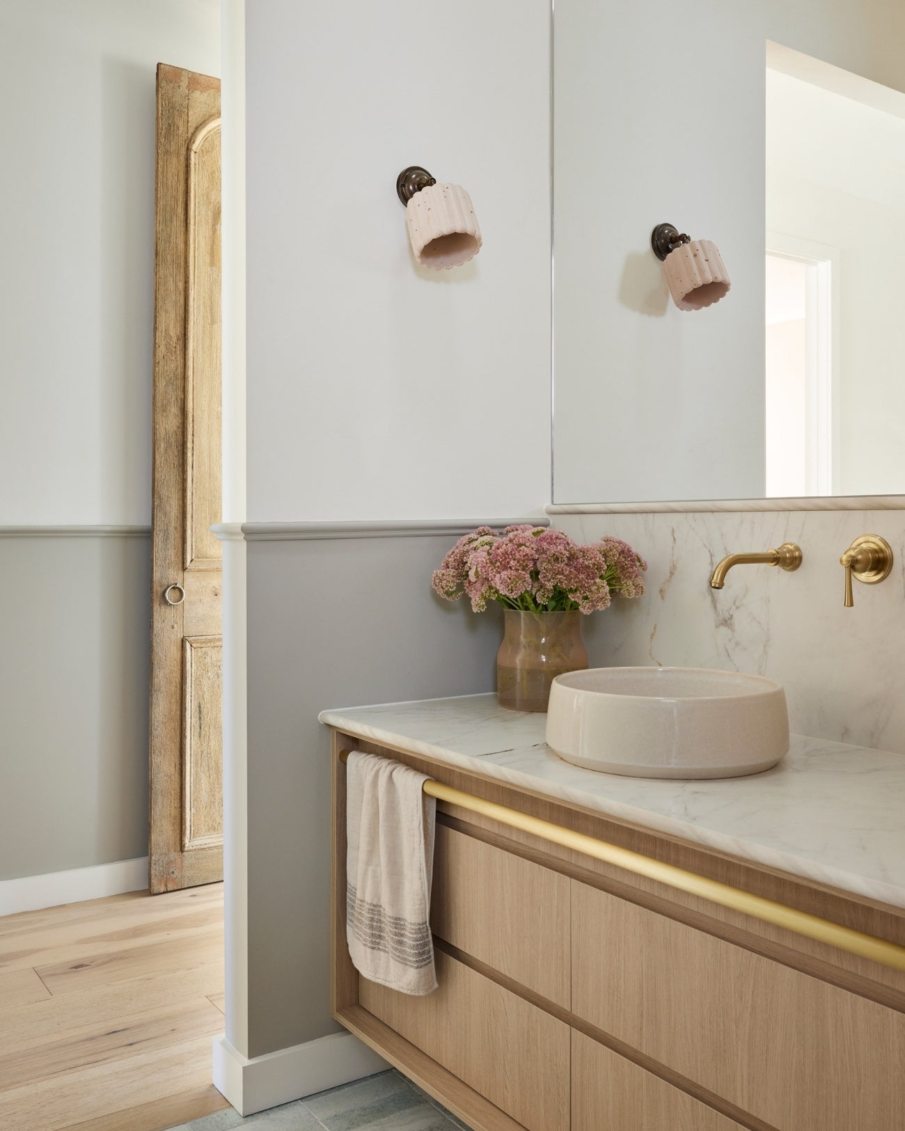 Bathroom interior with wooden vanity, sink, and a concrete wall light