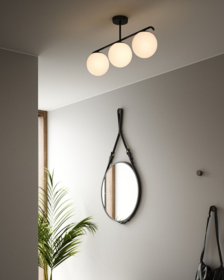 The Balance Spherical Pendant combines classic elegance with contemporary Scandinavian design. Featuring a sleek brass or black bar supporting three white opal glass shades, this fitting emits a soft, diffused glow that creates a warm and inviting atmosphere. Perfect for hallways, living spaces, or above dining tables, its refined silhouette and balanced proportions make it a versatile choice for both modern and timeless interiors.