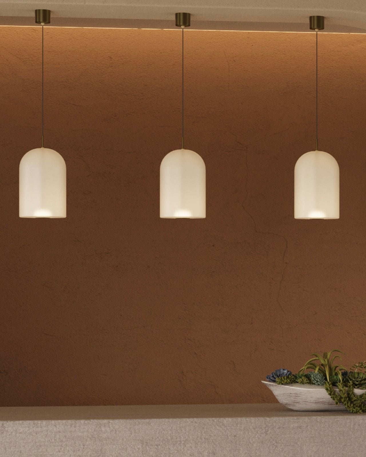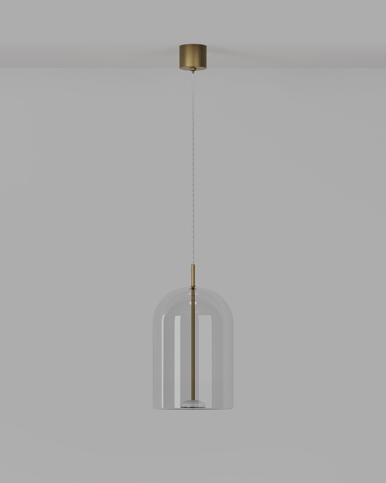 Hand-blown from durable borosilicate glass, the Elongated Glass Dome Pendant provides visual lightness and lasting quality. A signature Old Brass or Iron suspension rod complements the glass form, offering a warm contrast that enhances its elegant proportions. Designed for high ceilings, voids, stairwells, and other double-height spaces, this fixtures minimal silhouette makes it versatile across both residential and commercial applications. The pendant may be installed as a single feature light or arranged in clusters to create a strong architectural composition.