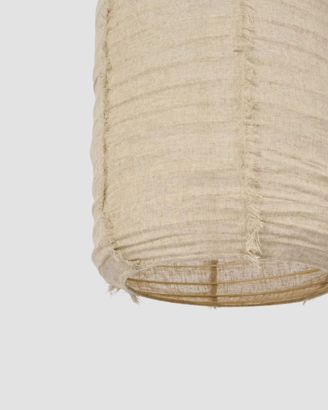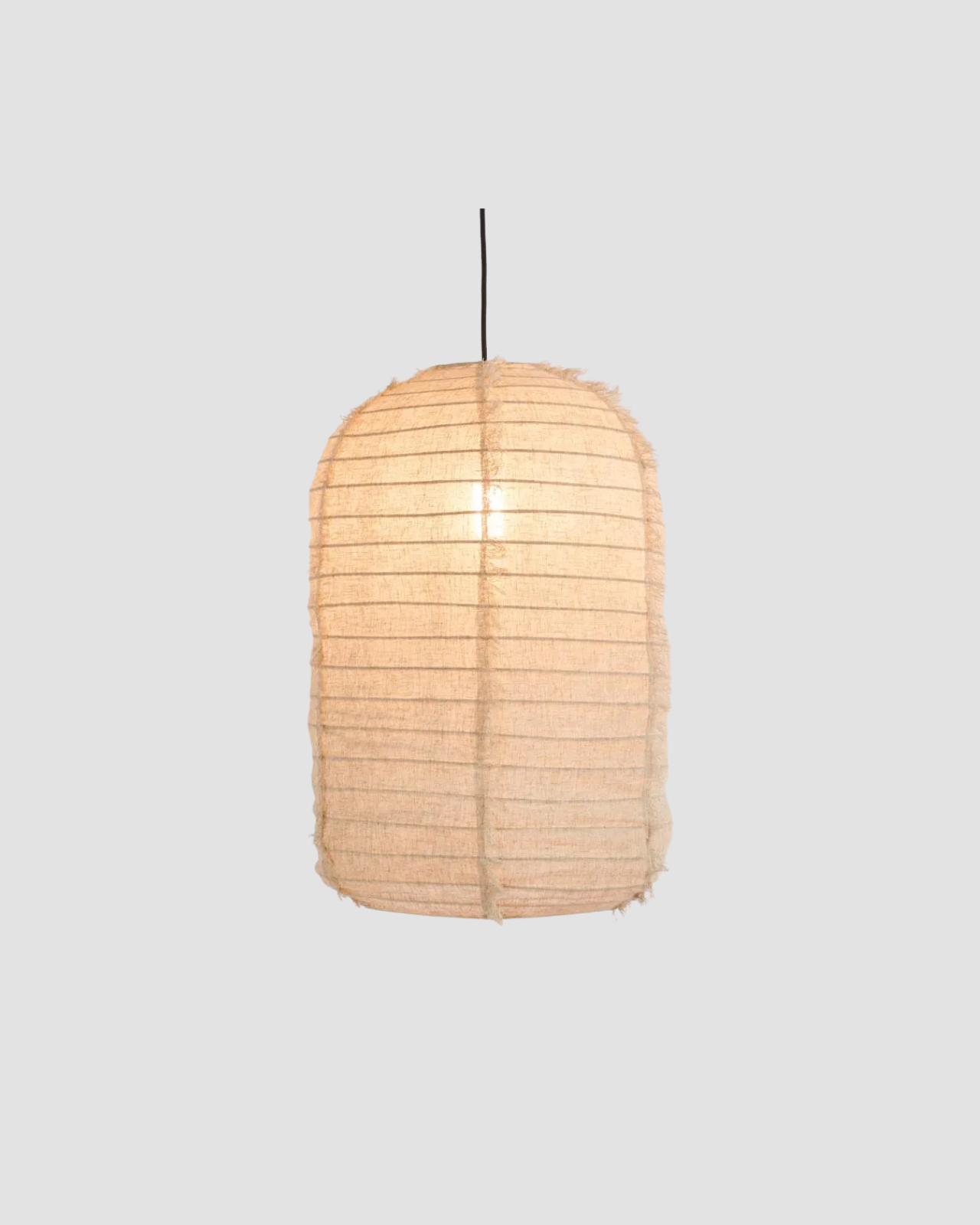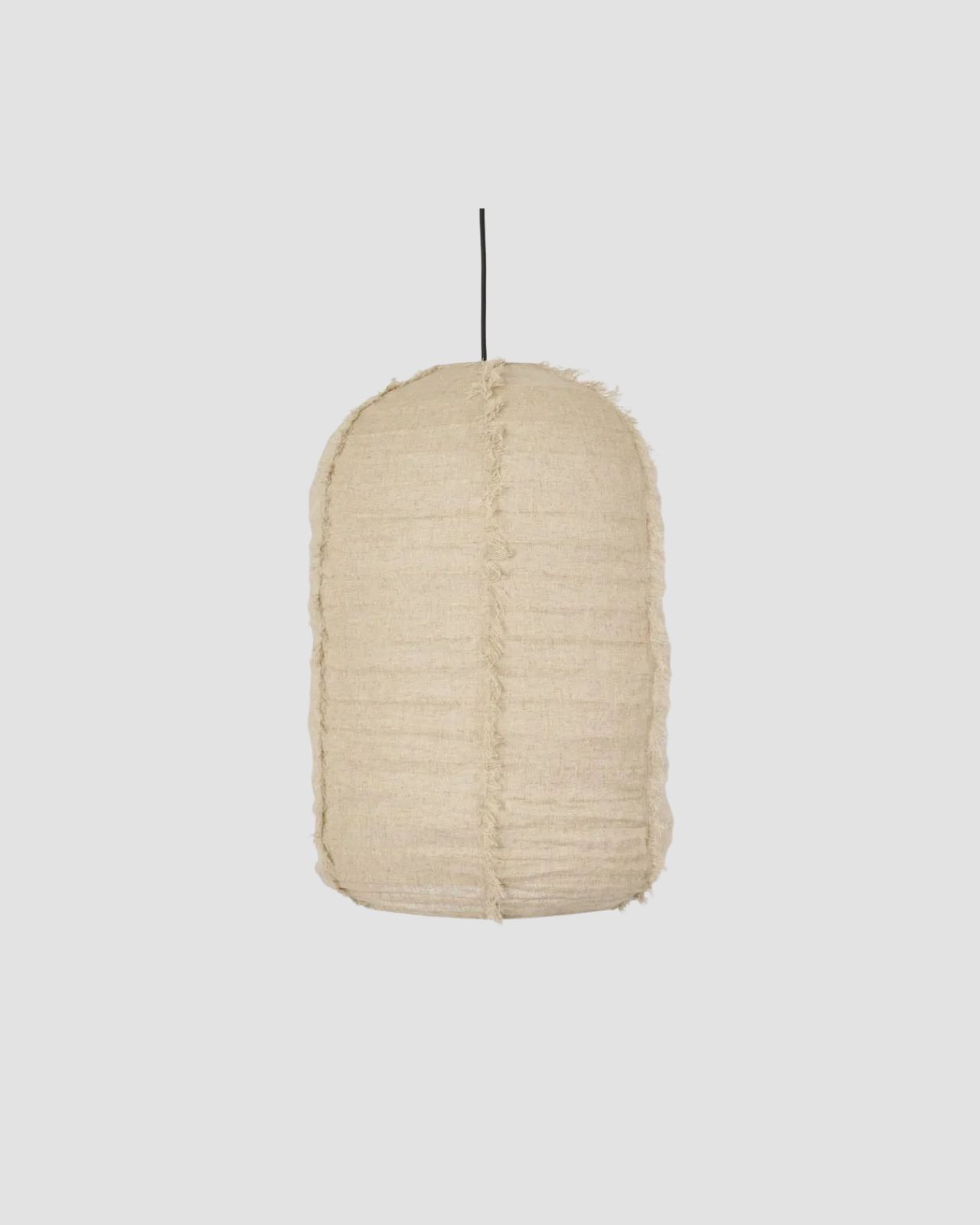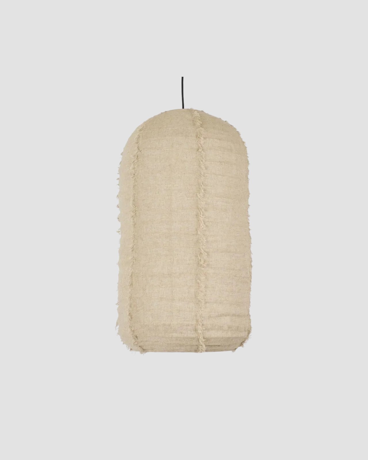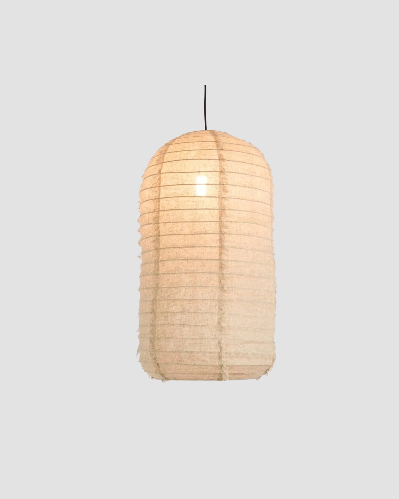 The capsule-shaped linen shade diffuses light gently, creating a soft, ambient glow ideal for bedrooms, dining areas, and living spaces. Its minimalist form and organic linen texture make it a timeless choice for Japandi, Scandinavian, and contemporary interiors.