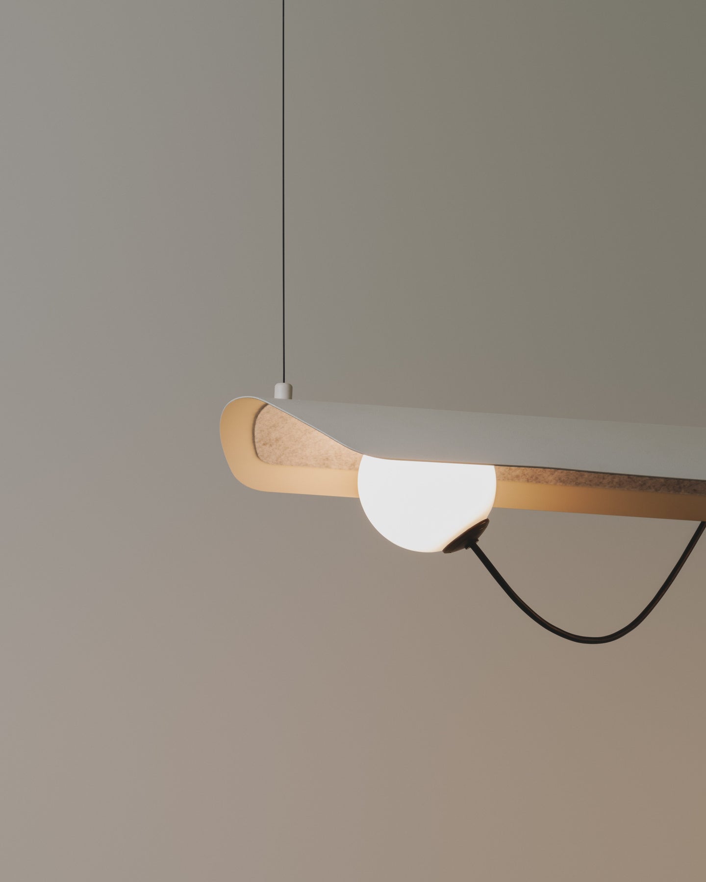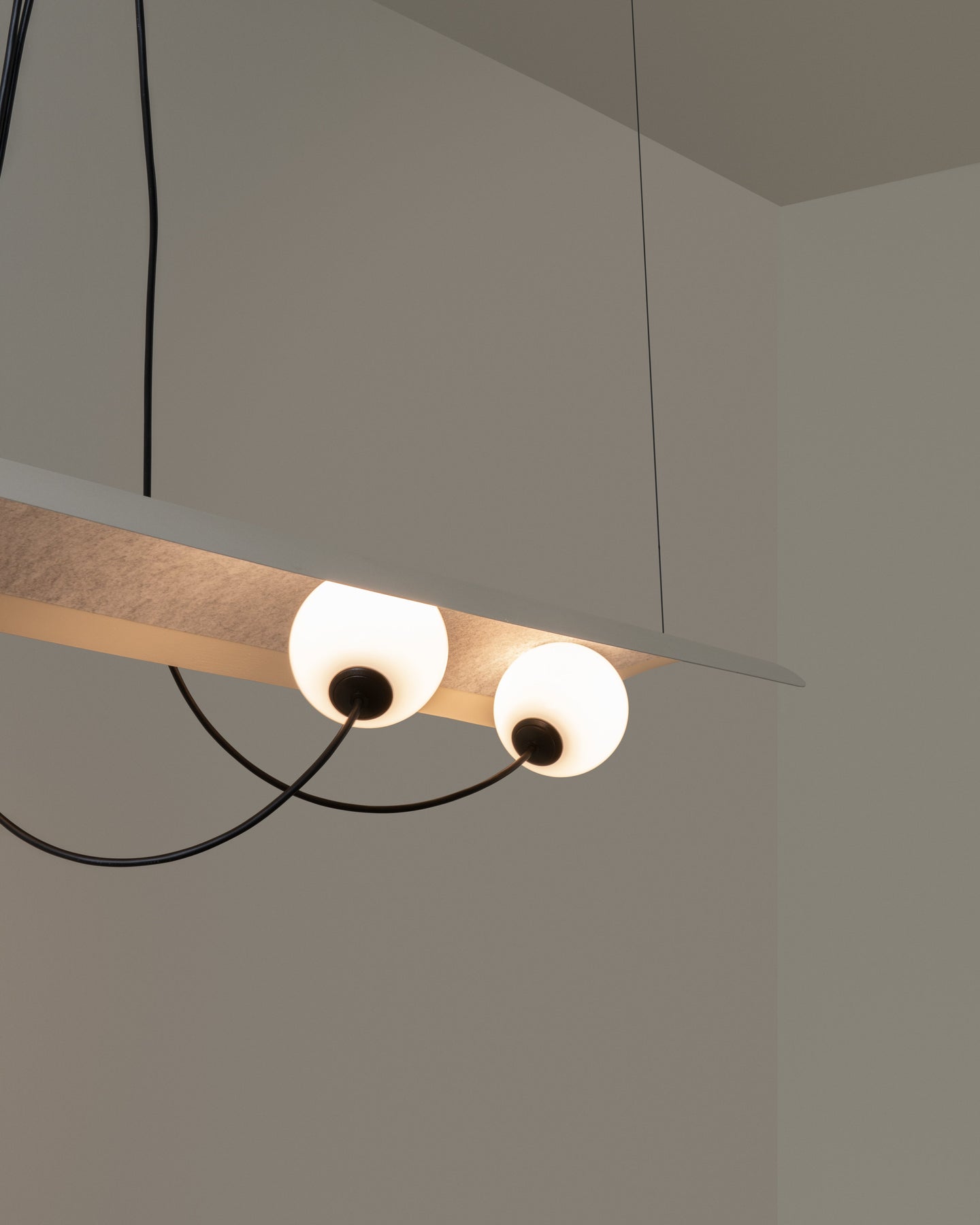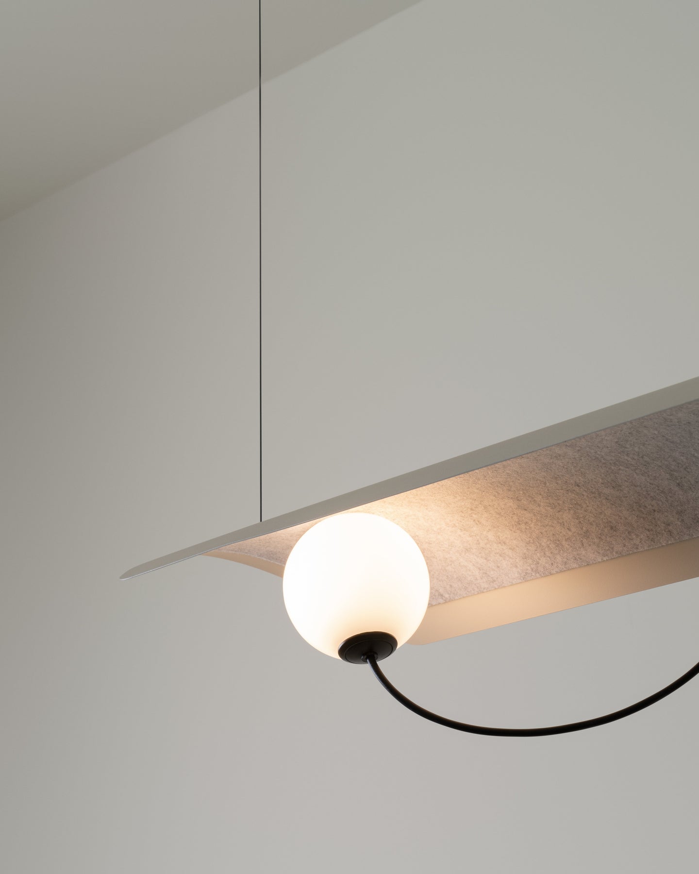 The Magnetic Balance Acoustic Linear Pendant seamlessly integrates advanced acoustic technology with minimalist design, offering both functional lighting and sound absorption in one elegant fixture. Designed to enhance modern interiors, this pendant light features a magnetic glass globe that can be repositioned along a felt-covered panel, allowing for customizable lighting effects and aesthetic flexibility. Its sleek profile and soft grey felt interior contribute to a harmonious blend of form and function, making it an ideal choice for spaces requiring both illumination and noise reduction.