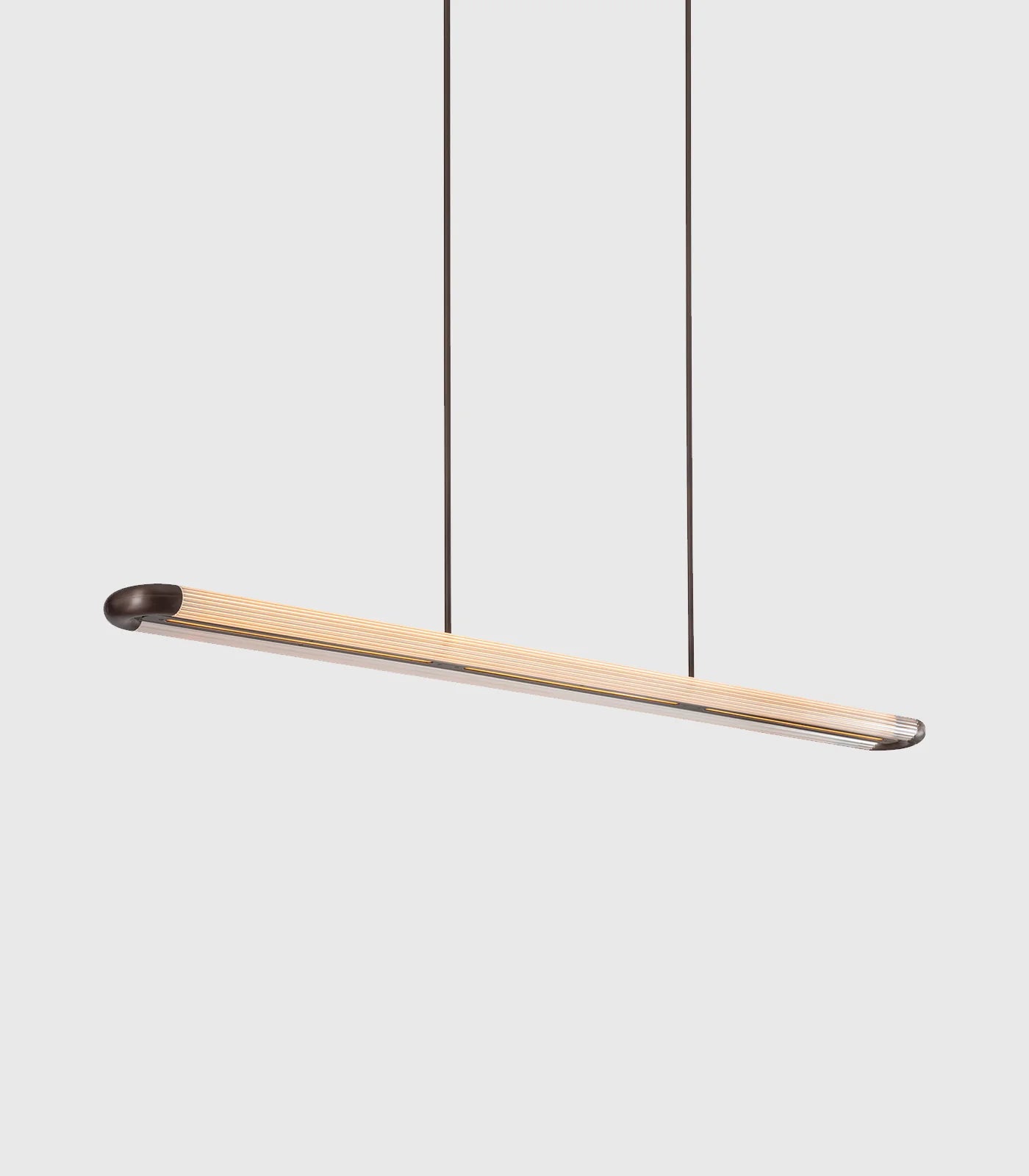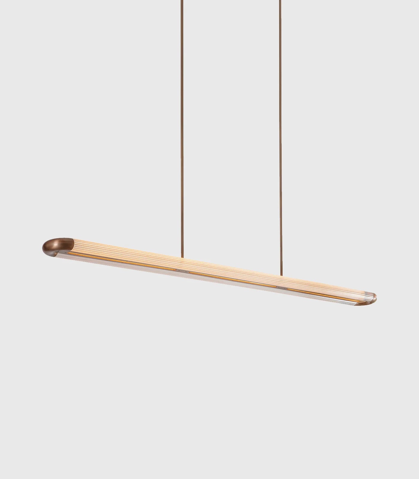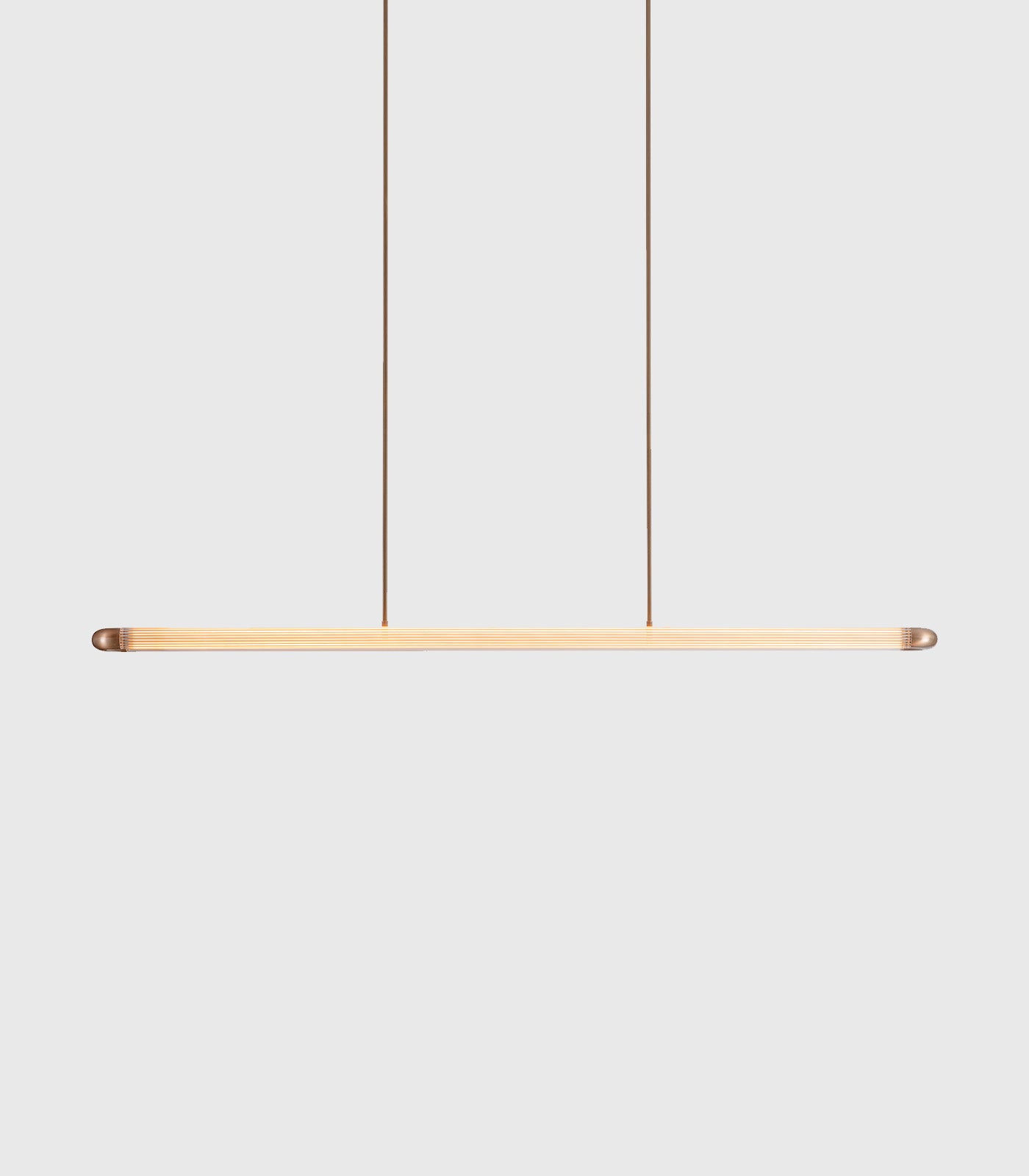 The Reeded Glass Linear Pendant showcases a blend of creativity and craftsmanship with its interplay of materials and captivating effects of light refraction. This linear pendant features two parallel reeded glass tubes connected by brass endcaps and suspended from a brass core, drawing inspiration from the Art-Deco era. It's a suitable option for dining tables, kitchen islands, and countertops. Available in a single or double desogn.