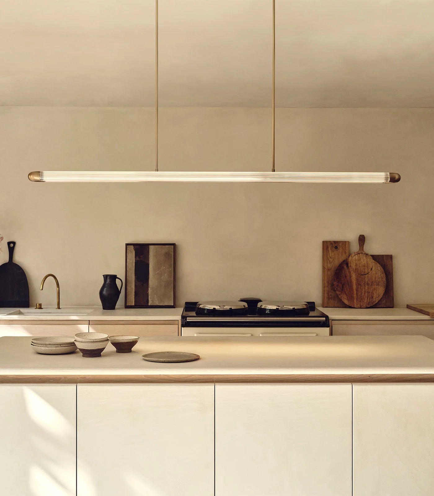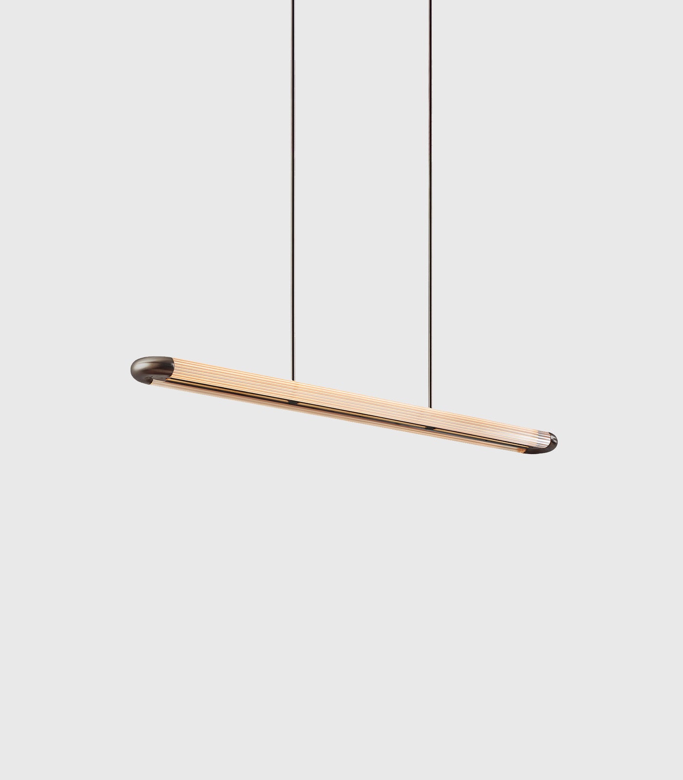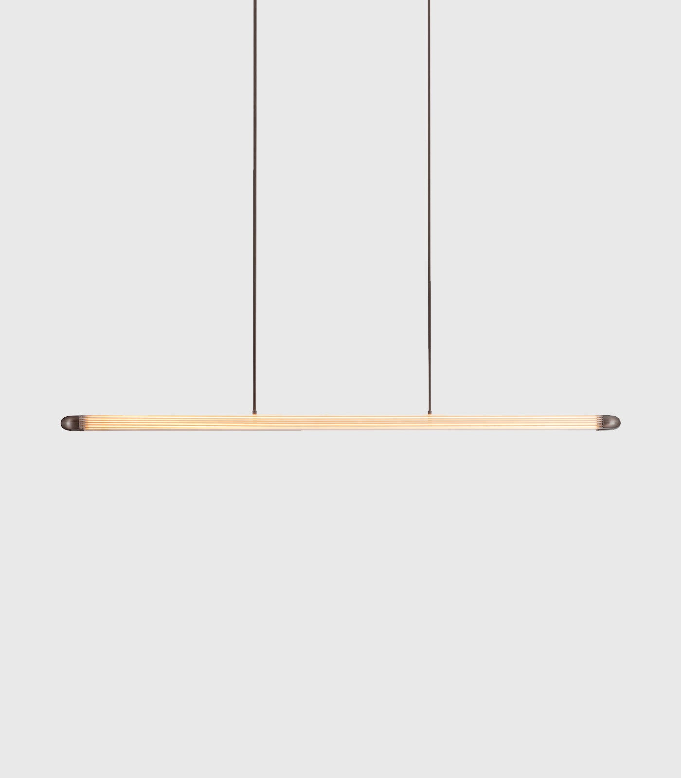 The Reeded Glass Linear Pendant showcases a blend of creativity and craftsmanship with its interplay of materials and captivating effects of light refraction. This linear pendant features two parallel reeded glass tubes connected by brass endcaps and suspended from a brass core, drawing inspiration from the Art-Deco era. It's a suitable option for dining tables, kitchen islands, and countertops. Available in a single or double desogn.