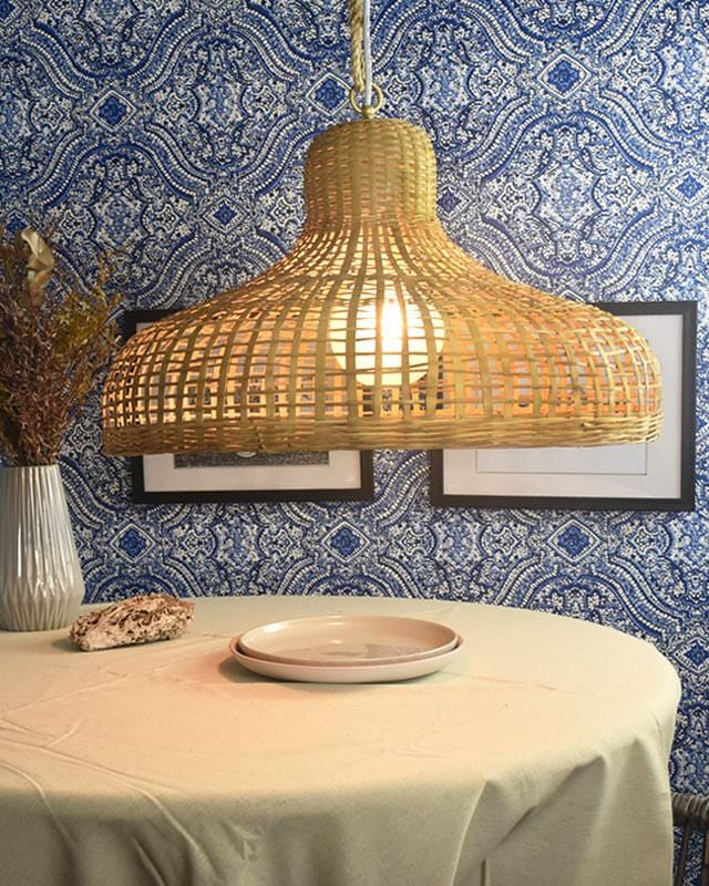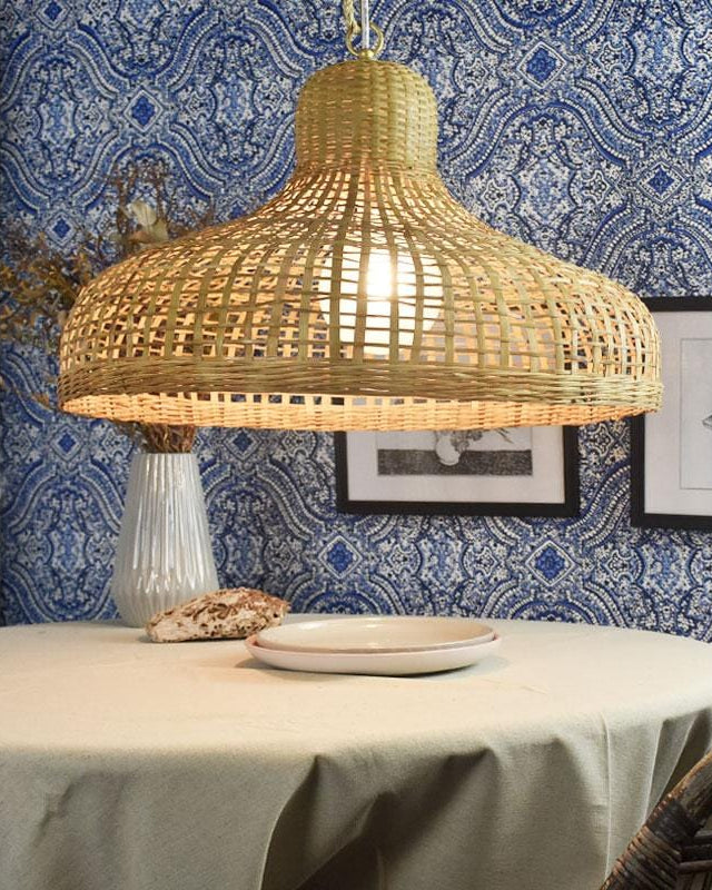Woven pendant light hanging above a table with a blue patterned wallpaper background