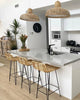 Modern kitchen with white island, bar stools, and bamboo pendant lights.