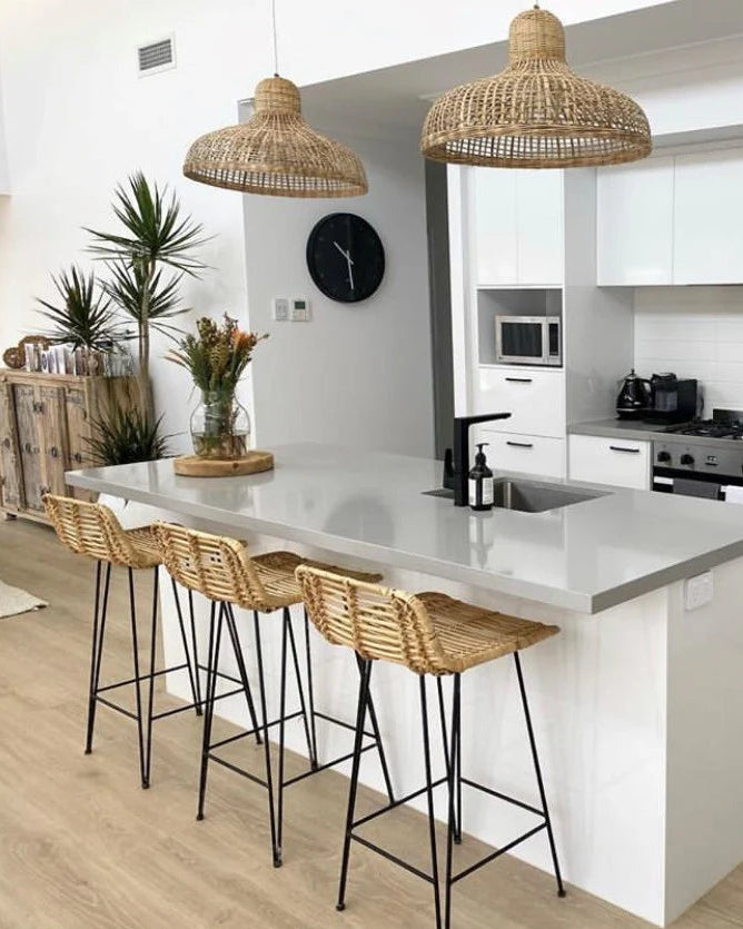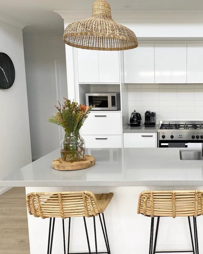 The stunning Rattan Pendant Light is intricately handwoven from natural Rattan. The curved silhouette of this light provides for a captivating and soft appearance, allowing the piece to integrate easily into a range of spaces. As this fitting has a wider profile, it would look amazing suspended above your dining room table, in your bedroom or above your kitchen island counter.