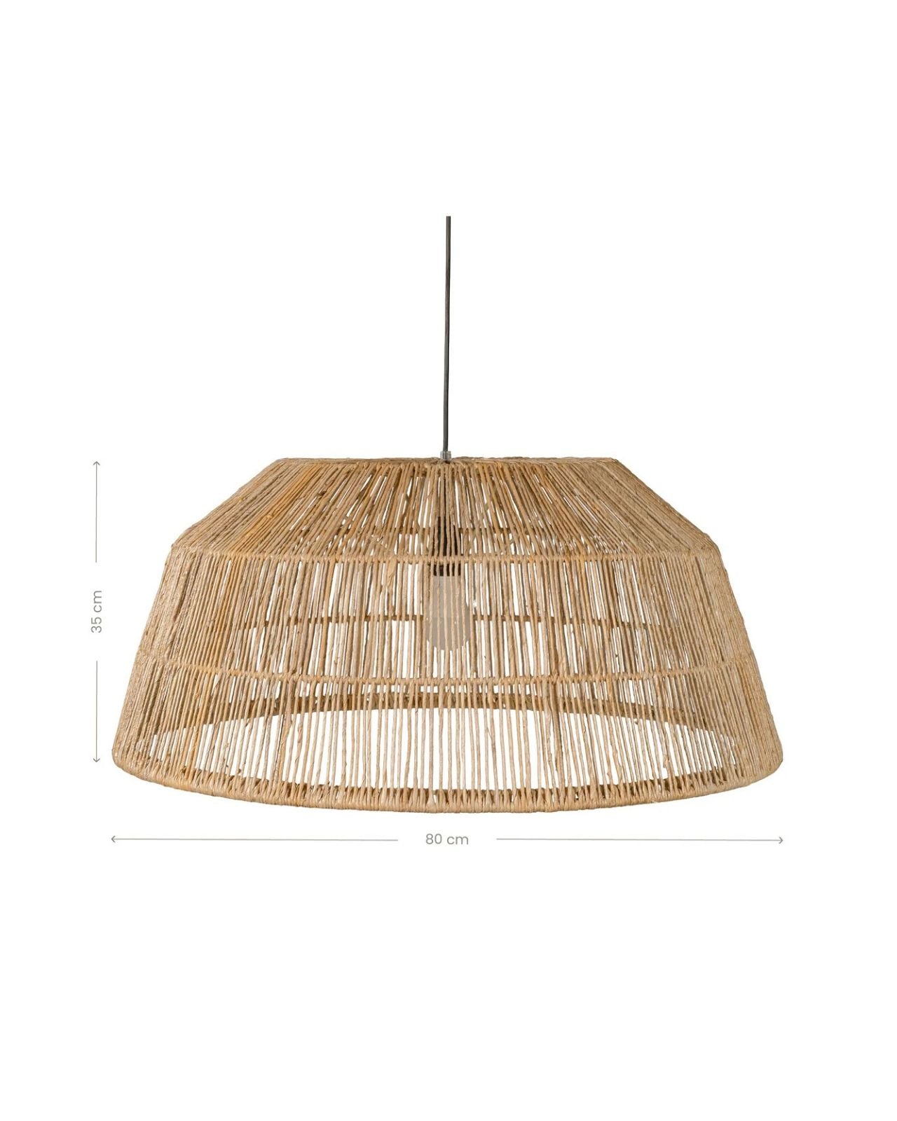 This pendant light has a dome-shaped design made of a sturdy yet elegant iron frame. Its shade has a unique texture that creates a distinct pattern, giving the pendant a highly structured appearance. The fibres of the shade lend a natural and organic feel to its aesthetic.
