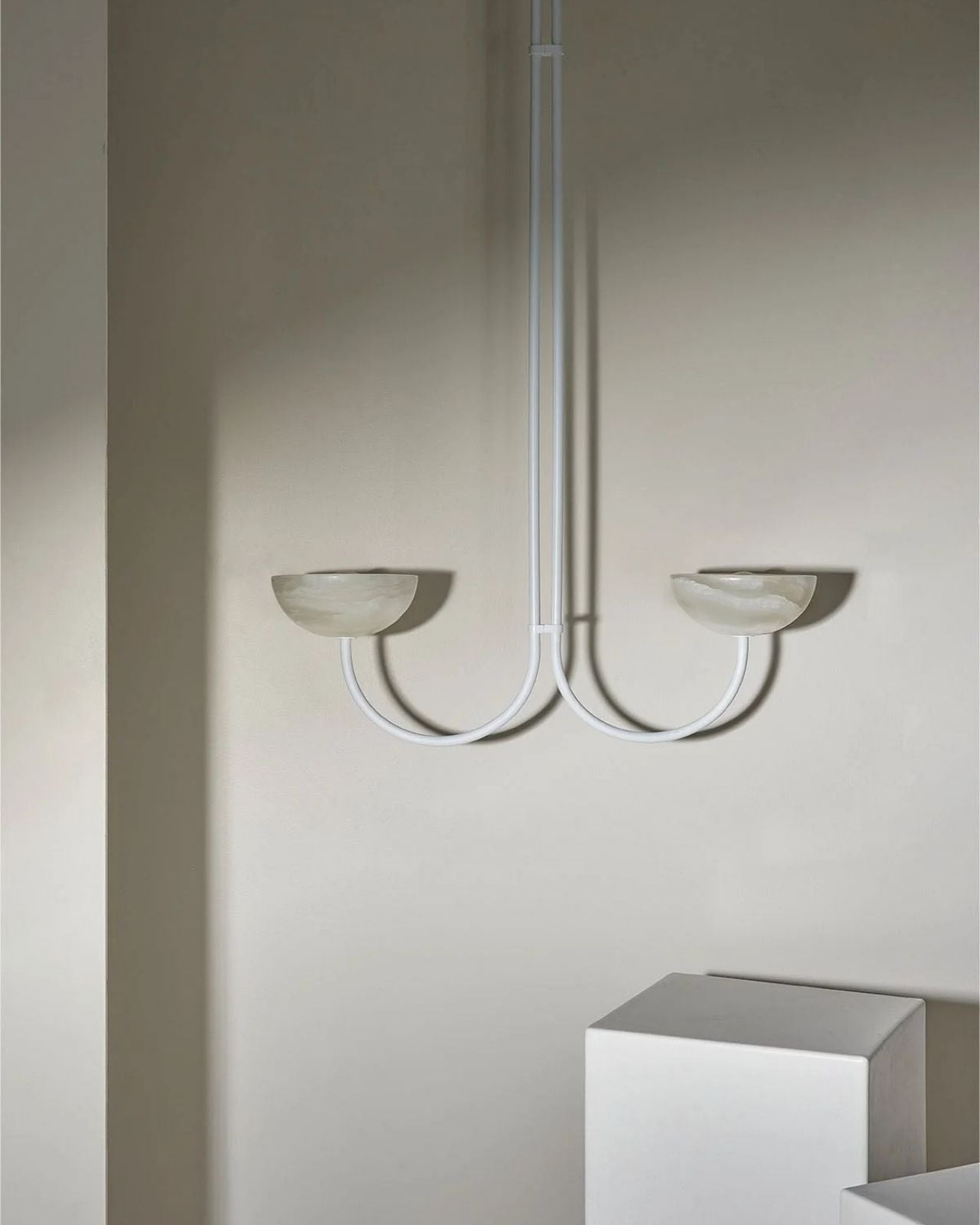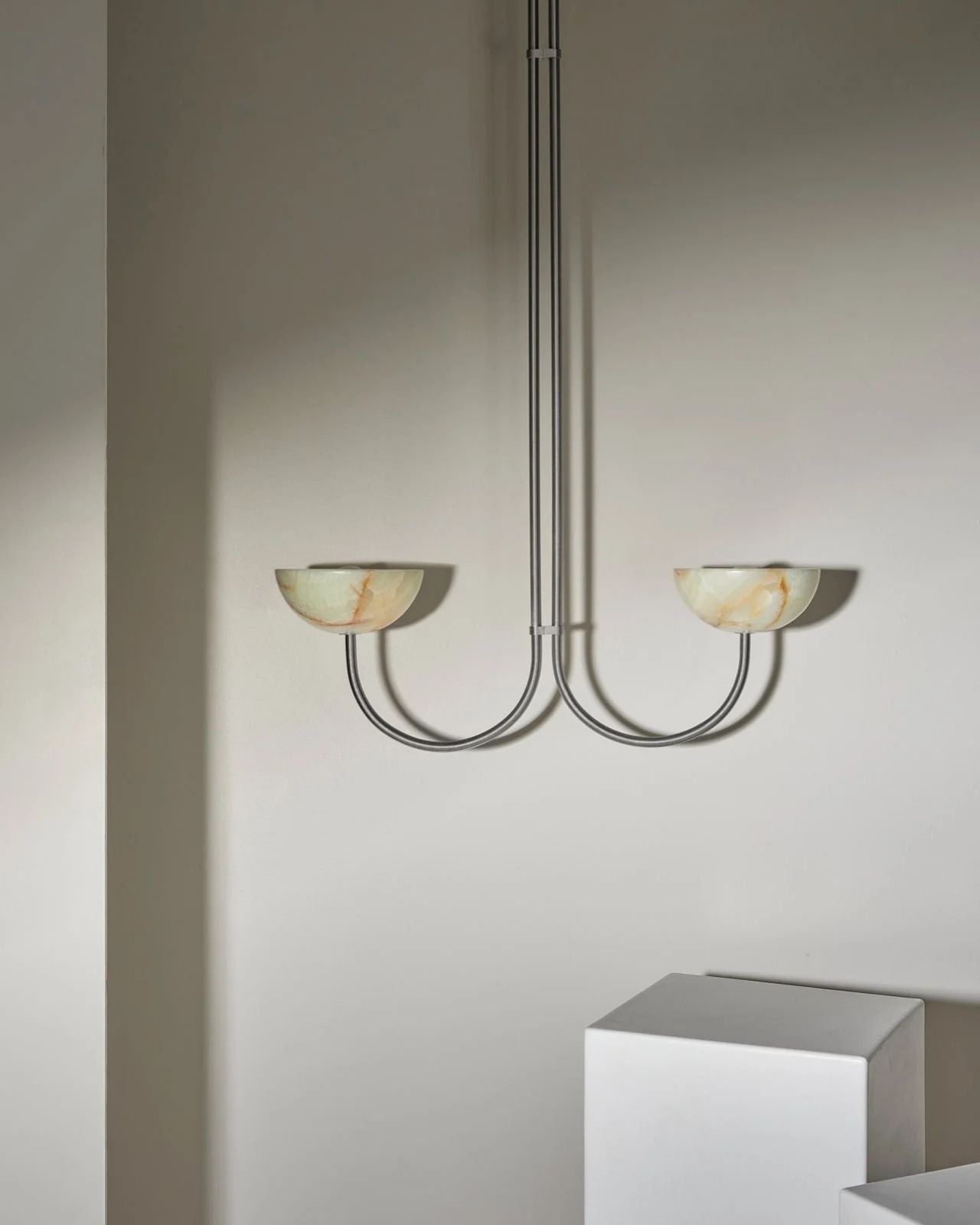 This symmetrical double dome pendant is a contemporary version of a classic chandelier with shades turned upside down for stunning soft illumination. This fixture is made from jade or white onyx and is paired with solid metal rods available in three finishes, brass, brushed black or white finish. Ideal in living rooms, dining rooms or restaurants, this pendant will bring a celestial and refined touch to the surroundings.