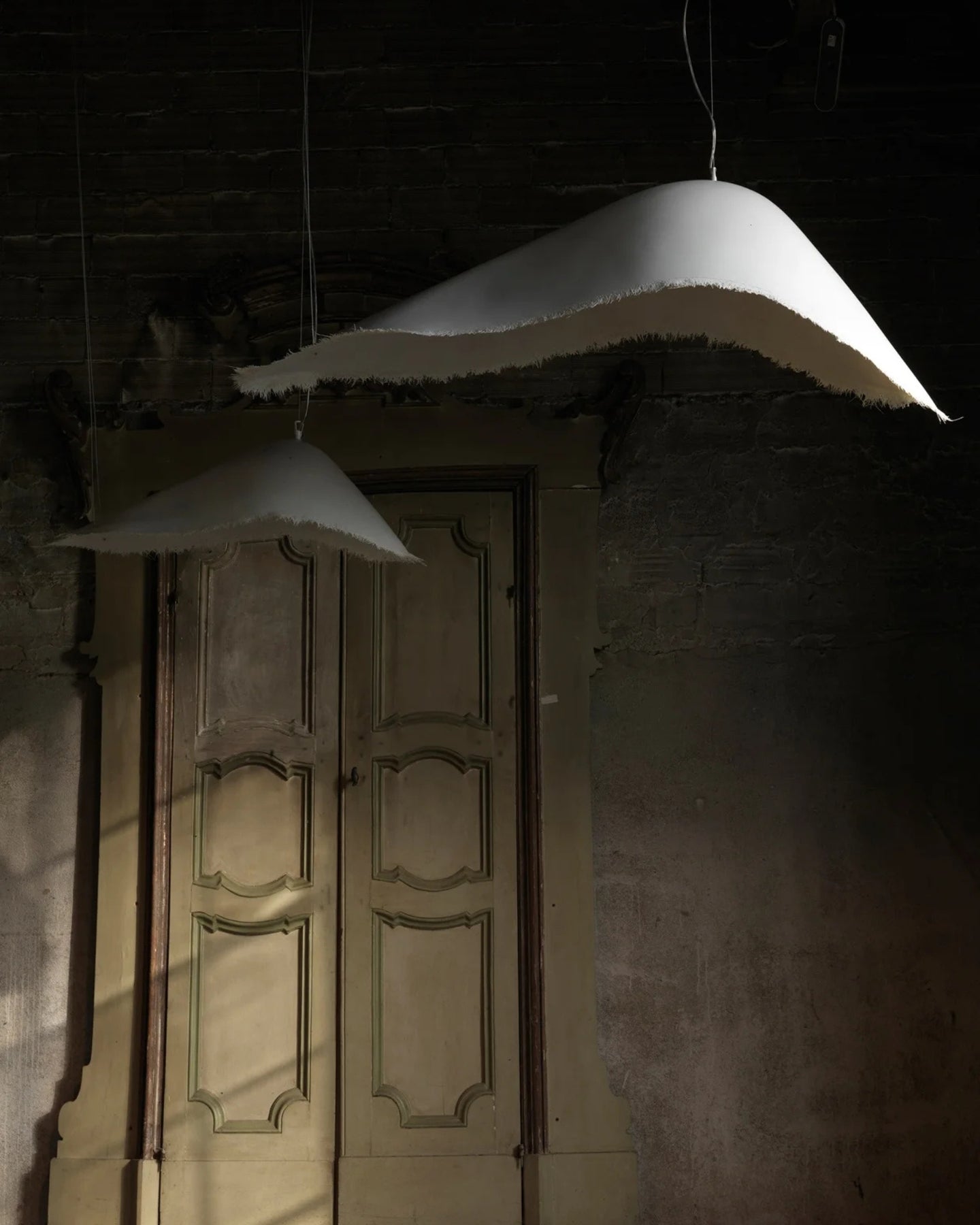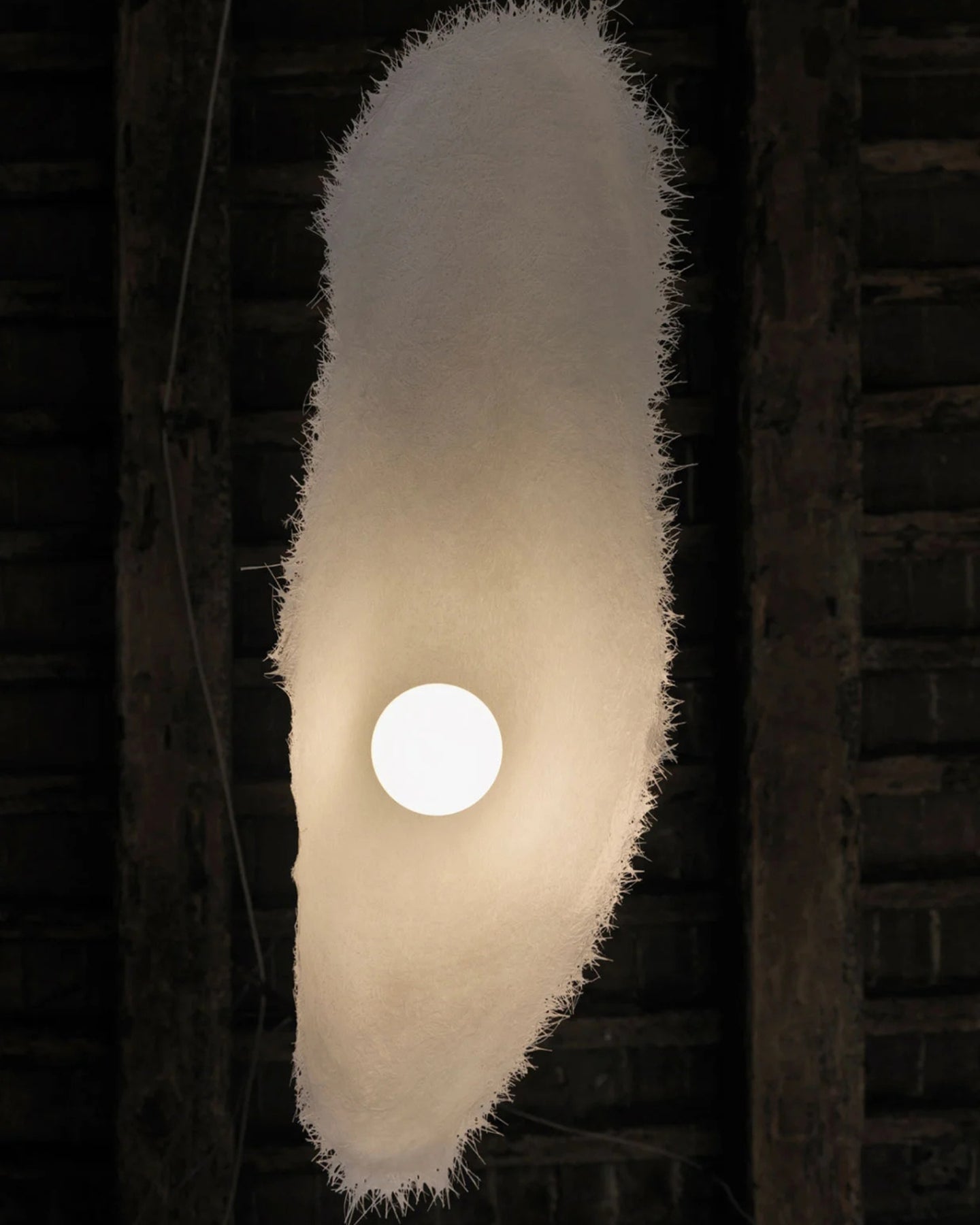 Its sculptural form, made from White fibreglass, is inspired by the curved proportions of Moby-Dick  (“The Whale” novel by Herman Melville). With a smooth outer finishing and rough inner finishing, it is reminiscent of a humpback whale protruding out of the sea with waves and white foam surrounding its stunning shape. Available in either a Medium or Large this pendant is suited to be installed singularly or grouped to create an interior focal point (Sold Singularly).
