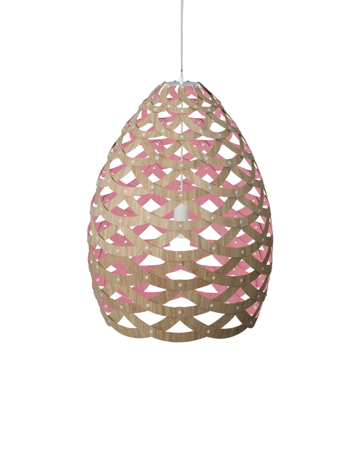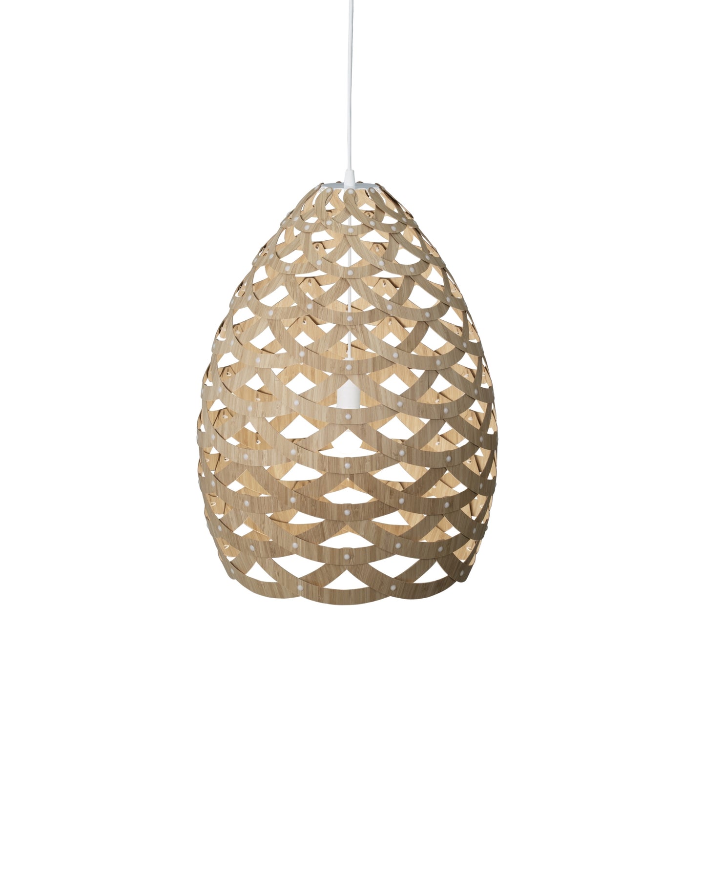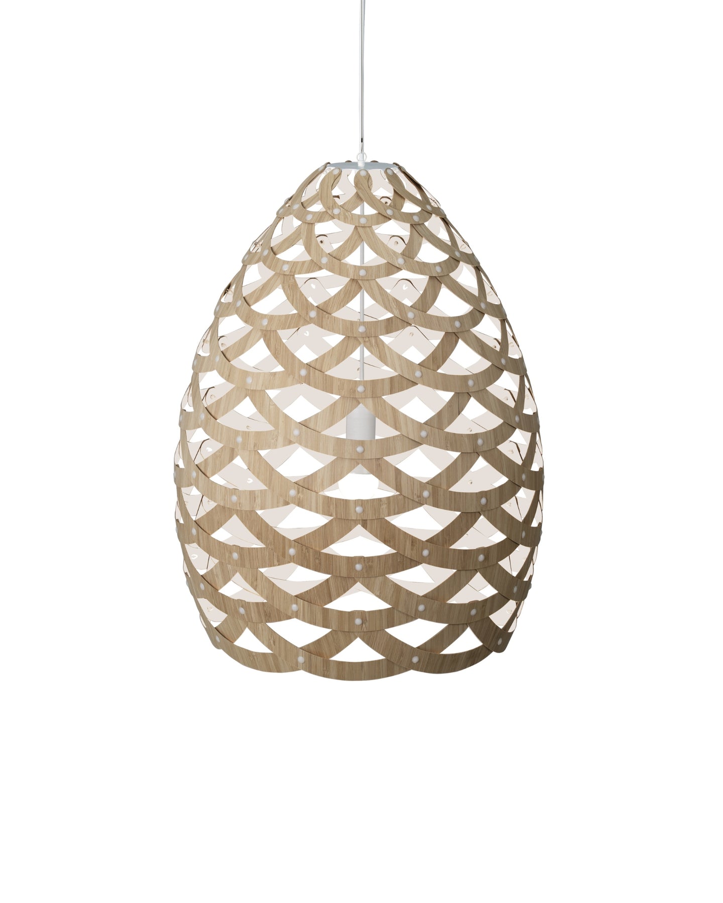Designed and crafted in New Zealand, the Tui Pendant Light is a unique pendant crafted from connecting half-rings of bamboo. Inspired by the Tūī bird native to Aotearoa, this fitting resembles the intricate feather pattern found on the bird's neck. These fittings come with a painted outside and bamboo inside, unless the both sides option is selected, adding dimension to the light. Suitable for installation above a dining room table or to fill voids in high ceilings.