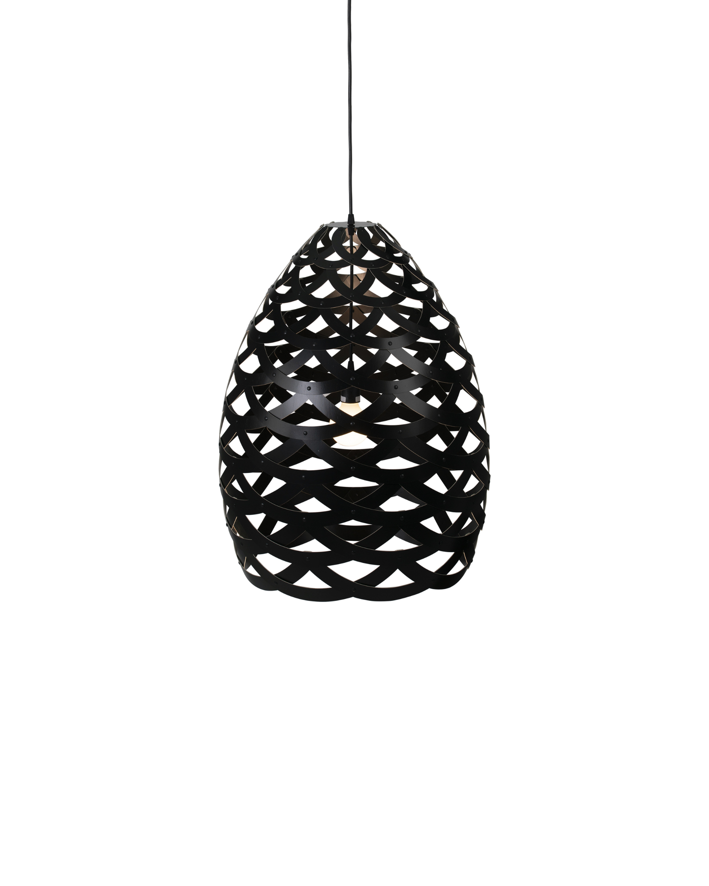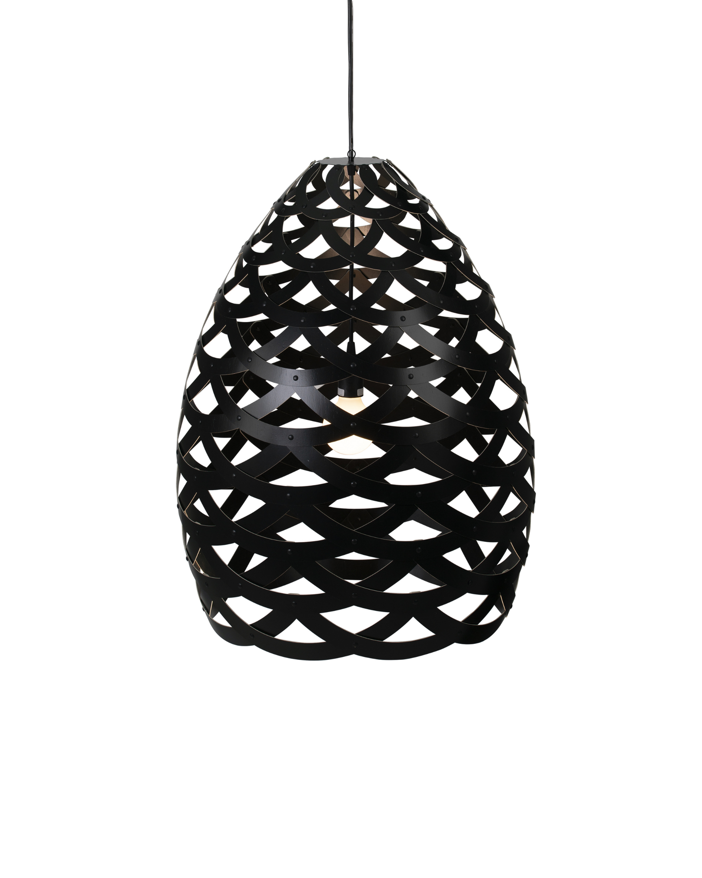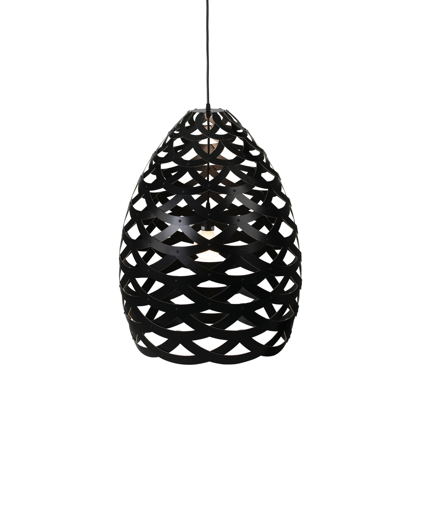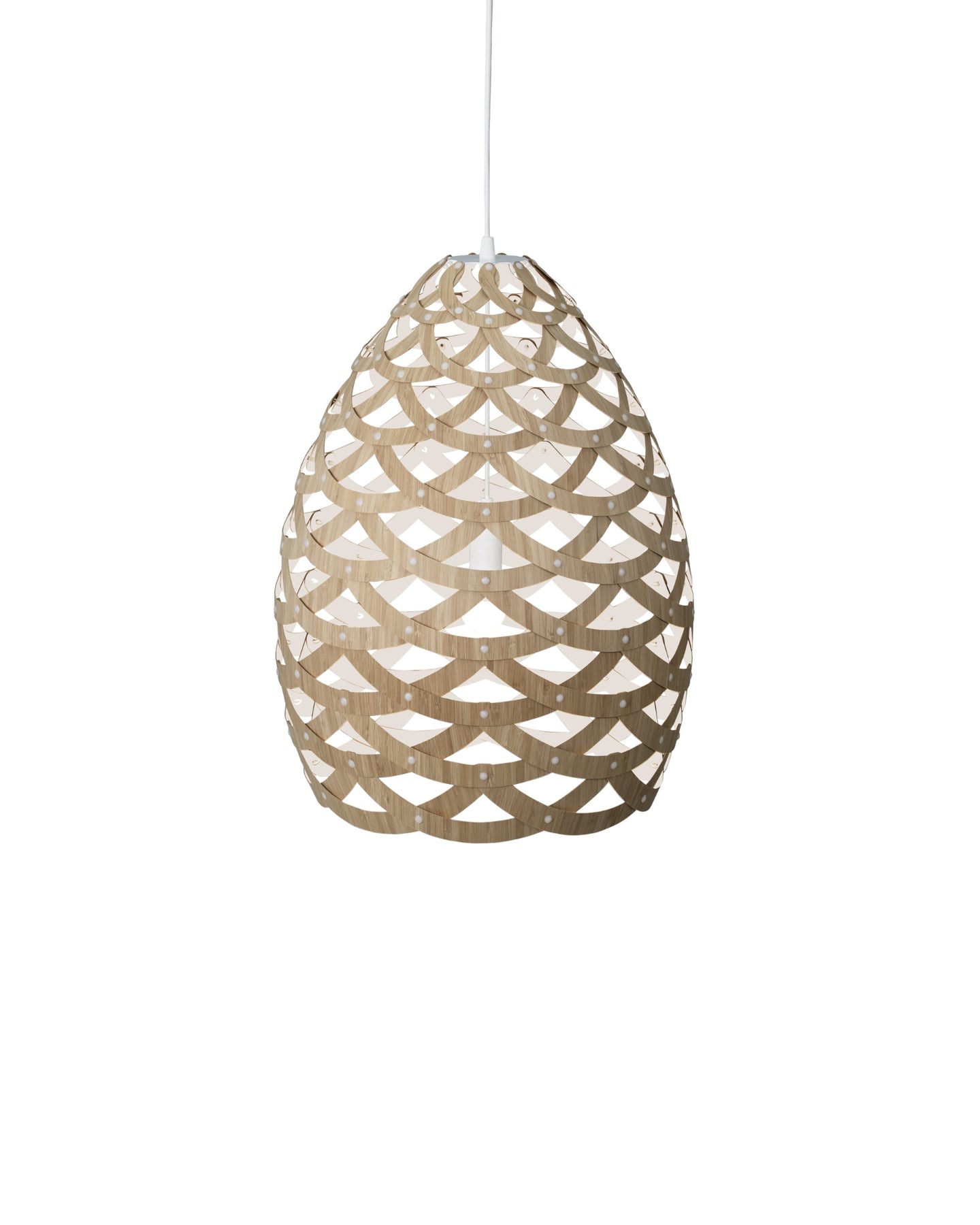 Designed and crafted in New Zealand, the Tui Pendant Light is a unique pendant crafted from connecting half-rings of bamboo. Inspired by the Tūī bird native to Aotearoa, this fitting resembles the intricate feather pattern found on the bird's neck. These fittings come with a painted outside and bamboo inside, unless the both sides option is selected, adding dimension to the light. Suitable for installation above a dining room table or to fill voids in high ceilings.