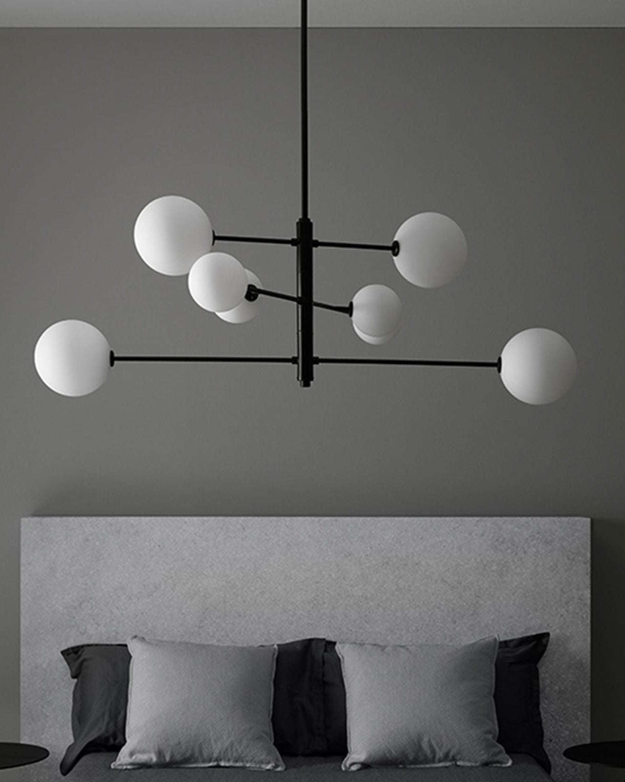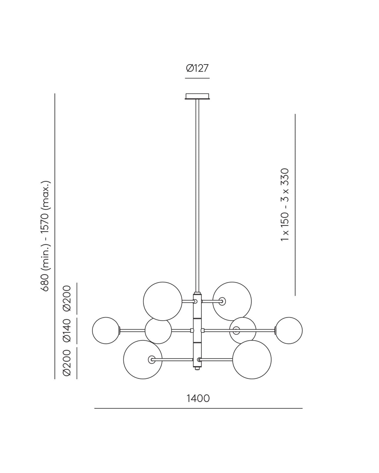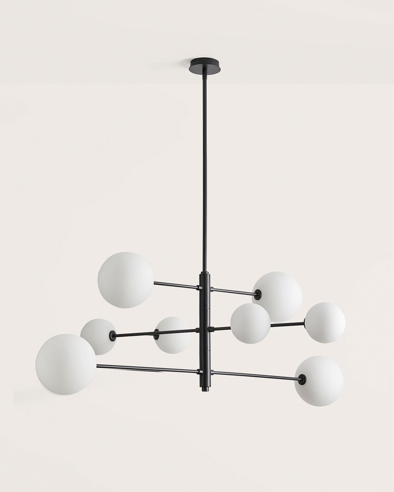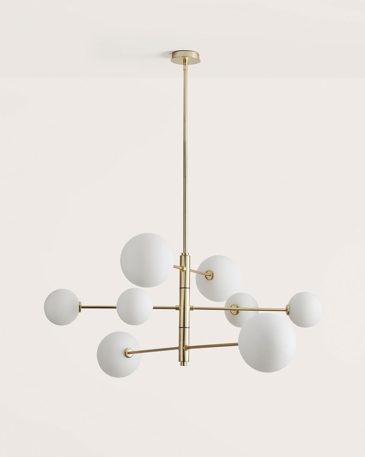 This intricate contemporary design showcases a steel structure finished in Matte Brass or Matte Black. At the end of the pendant's eight arms, a mixture of small and large blown glass orbs sit, housing the fittings G9 LED globes (included). Available in a clear or opal glass finish this contemporary take on a chandelier provides indirect light suited for dining rooms, living areas or large voids as a remarkable centrepiece.