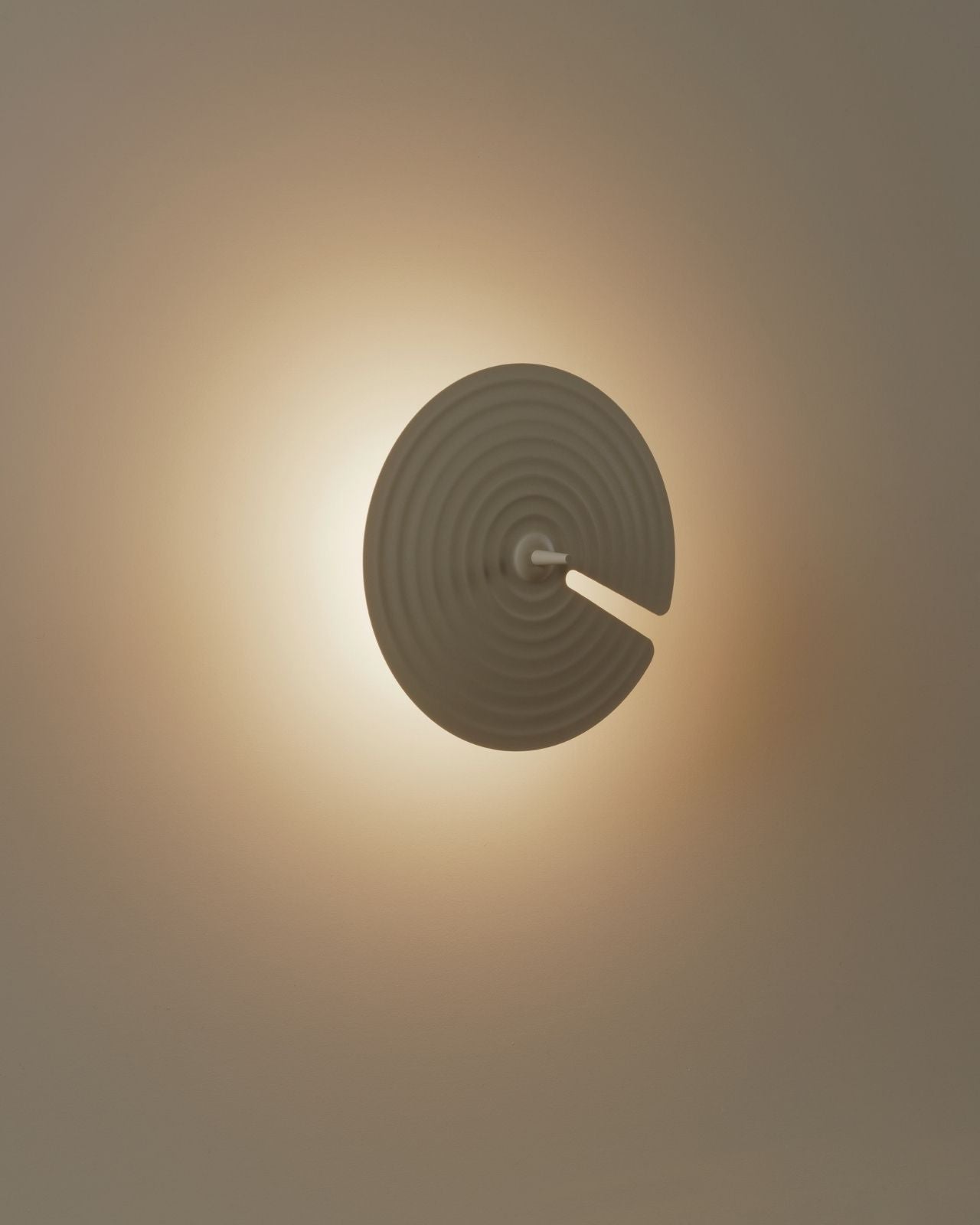 Inspired by percussion instruments this Spanish design features a ribbed dish shade and magnetic system. The magnet located within the diffuser allows the shade to be rotated and adjusted to achieve the desired lighting effect. This geometric wall light will enhance living areas, bedrooms and entranceways with its soft diffused light. Available in Copper, Mink or Anthracite. Dimmable with a compatible globe.