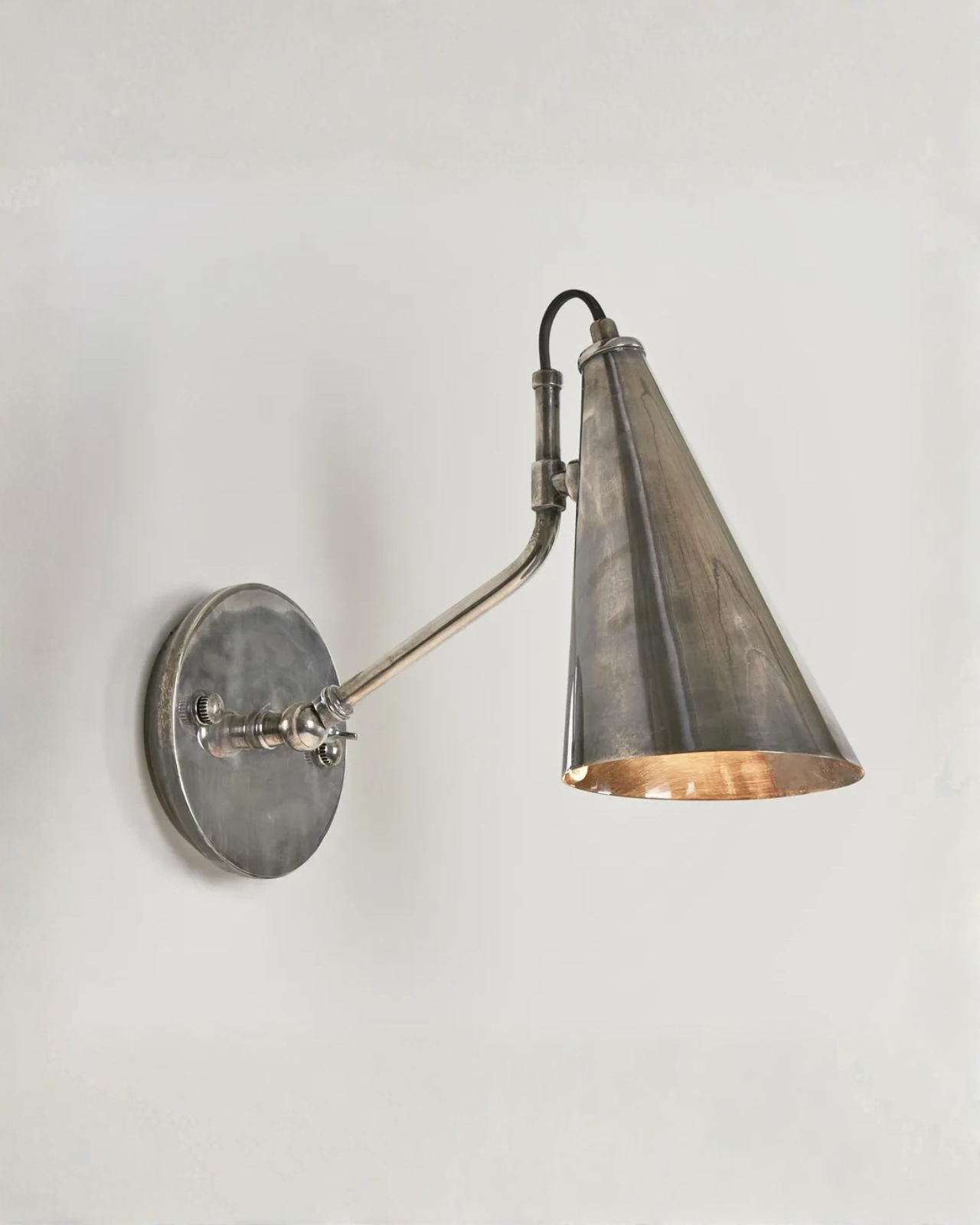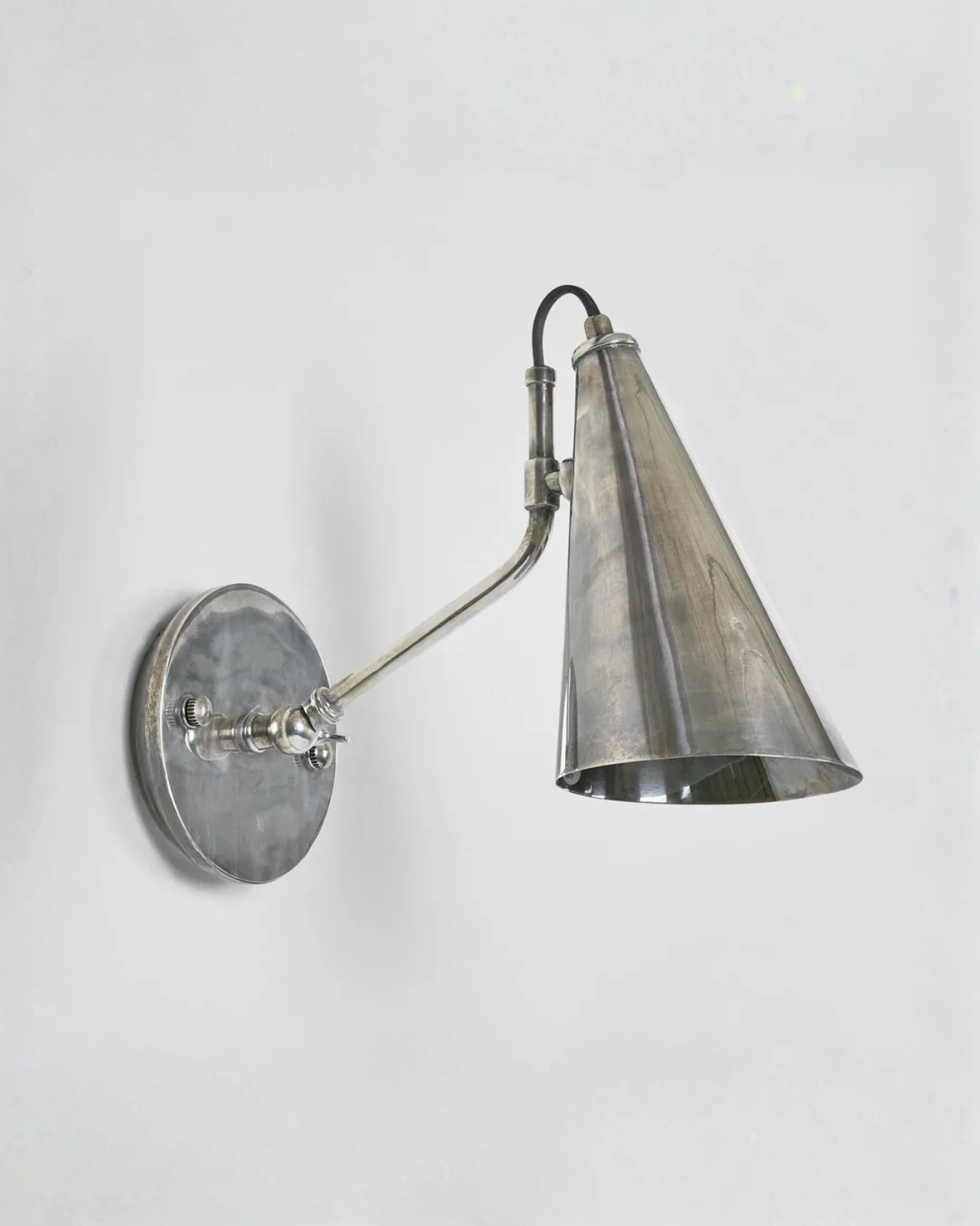 Enhance any interior space with a touch of sophisticated industrial style with this wall light. Its antique brass or antique silver finish, cone shape and sleek arm make it the ideal reading light for bedrooms, reading nooks or study rooms. Made with solid, anti-rust brass, this fixture is adjustable using one interlocking joint to rotate the lamp up and down, providing both functionality and elegance.