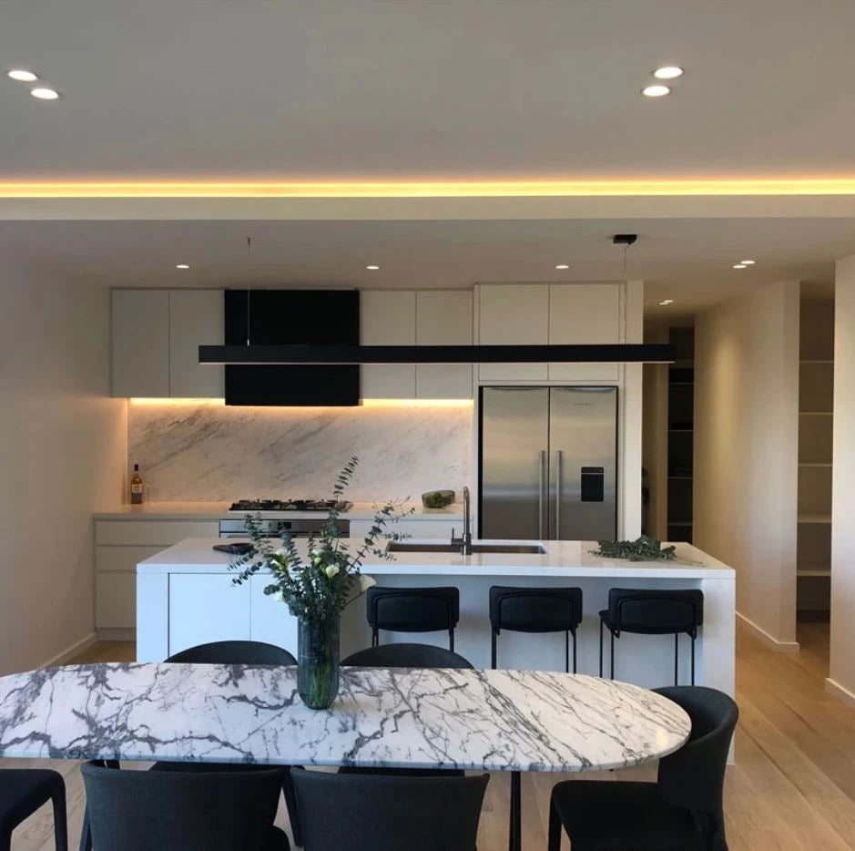 The High Side suspended linear LED pendant light is a popular option due to its minimalistic design and modern appeal. Exuding an atmosphere of elegance and simplicity, and available in a white finish. The pendant is dimmable with an integrated driver. It is designed with wires that run along a track, allowing it to fit into any preexisting ceiling holes.