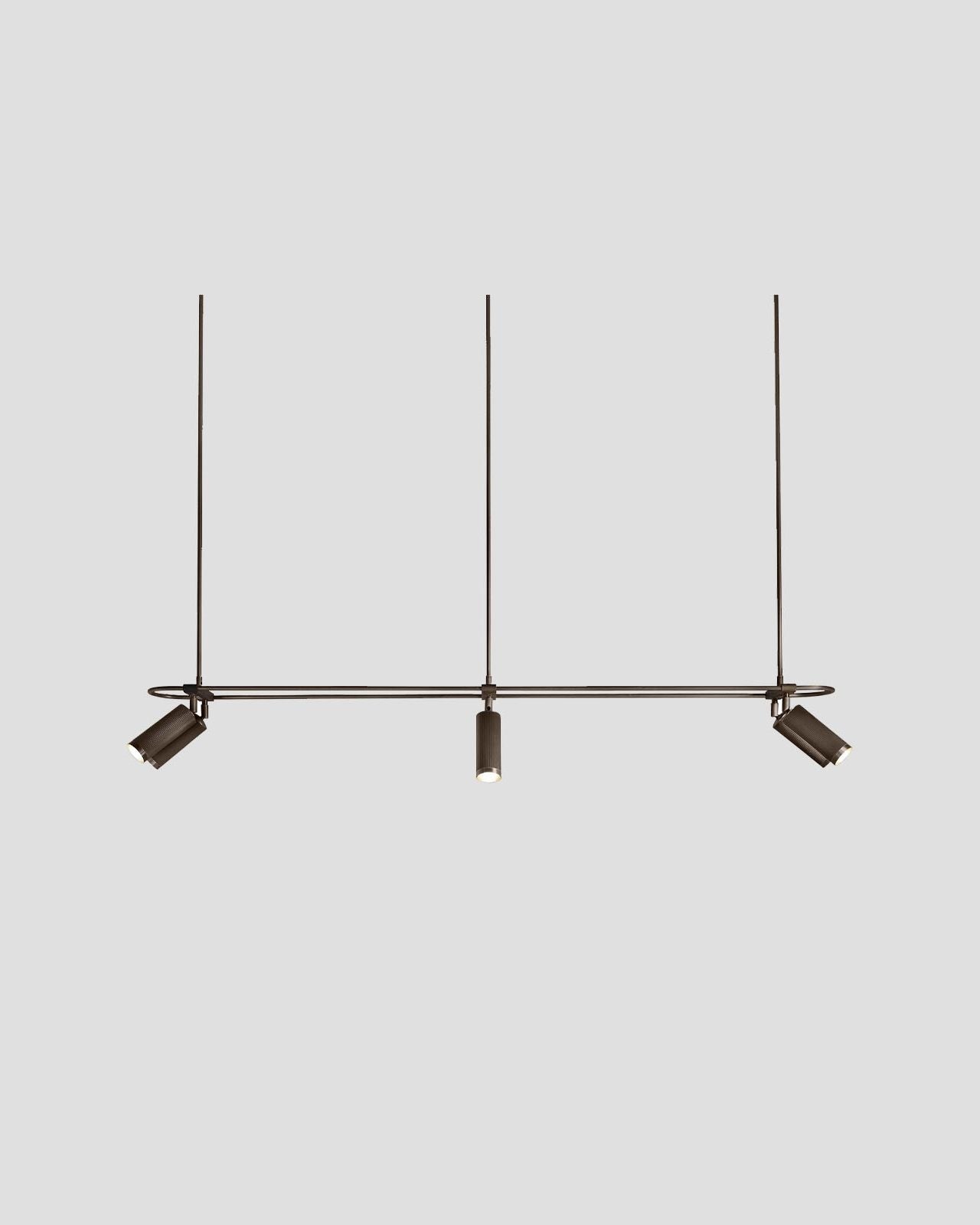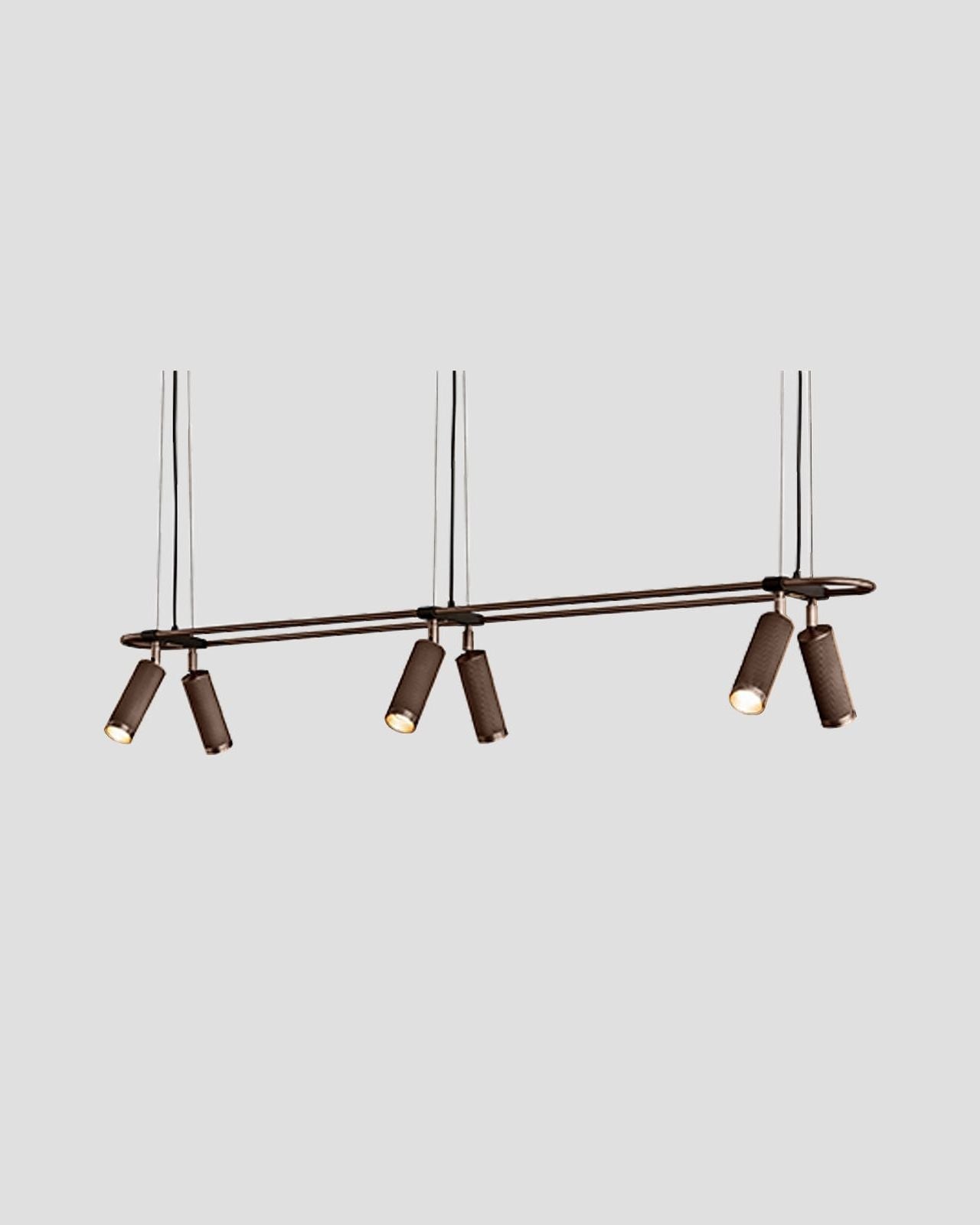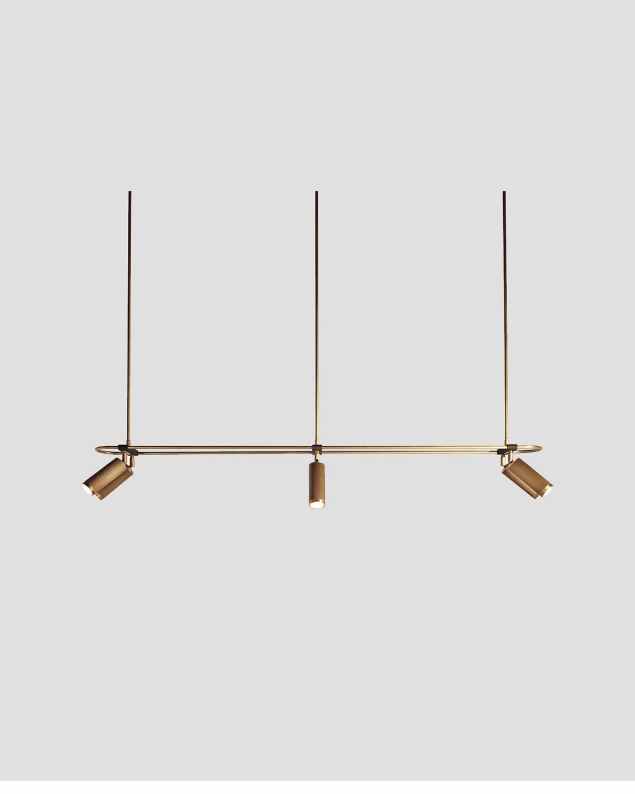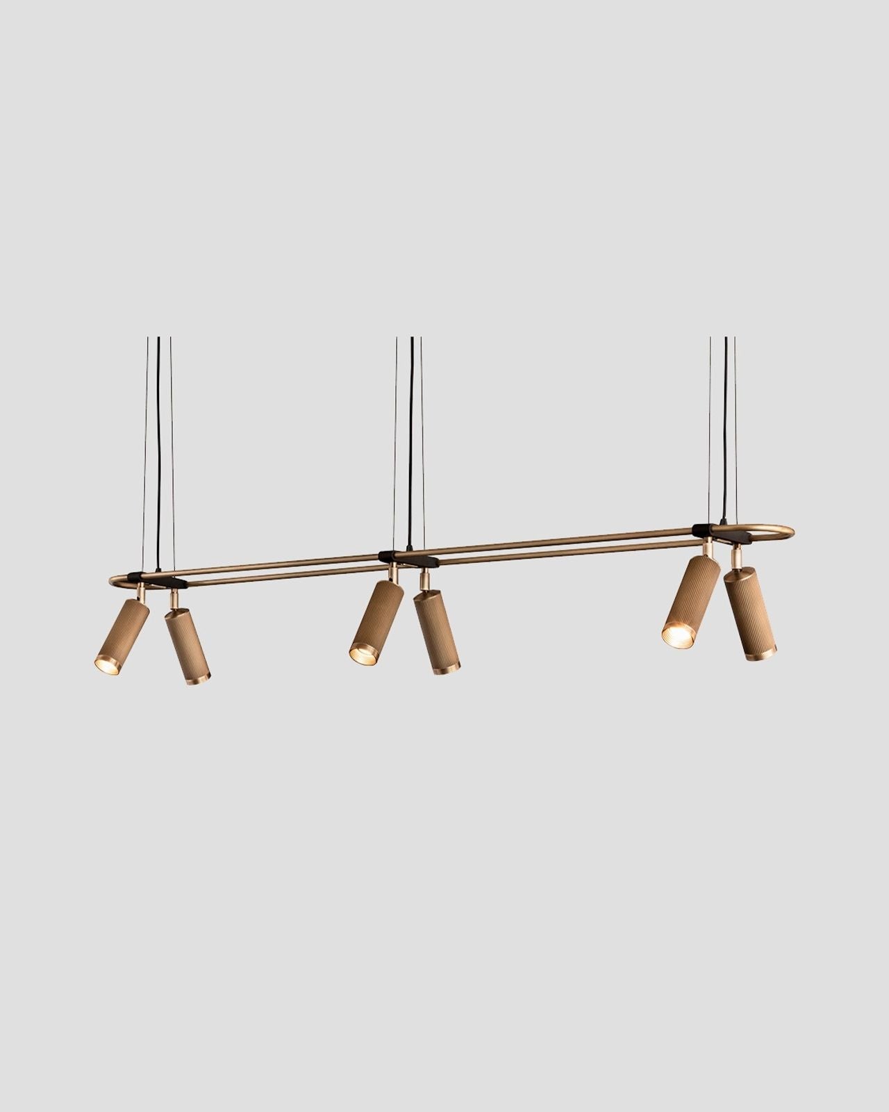 Elevating modern or contemporary kitchens, living rooms, dining rooms or commercial areas, this linear pendant features an oblong ring made from brass and on which are mounted six adjustable cylindrical heads. The refined brass details combined with the available finishes, antique brass, bronze, satin brass or satin nickel make this fixture an elegant and sophisticated addition to interiors. Suspended from a wire or a drop rod, this versatile pendant will direct a warm light where it is needed most.