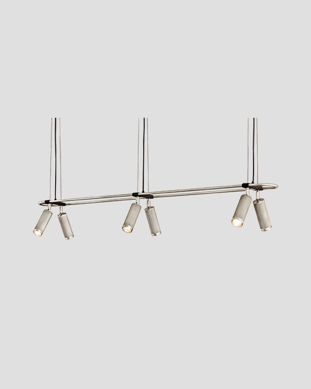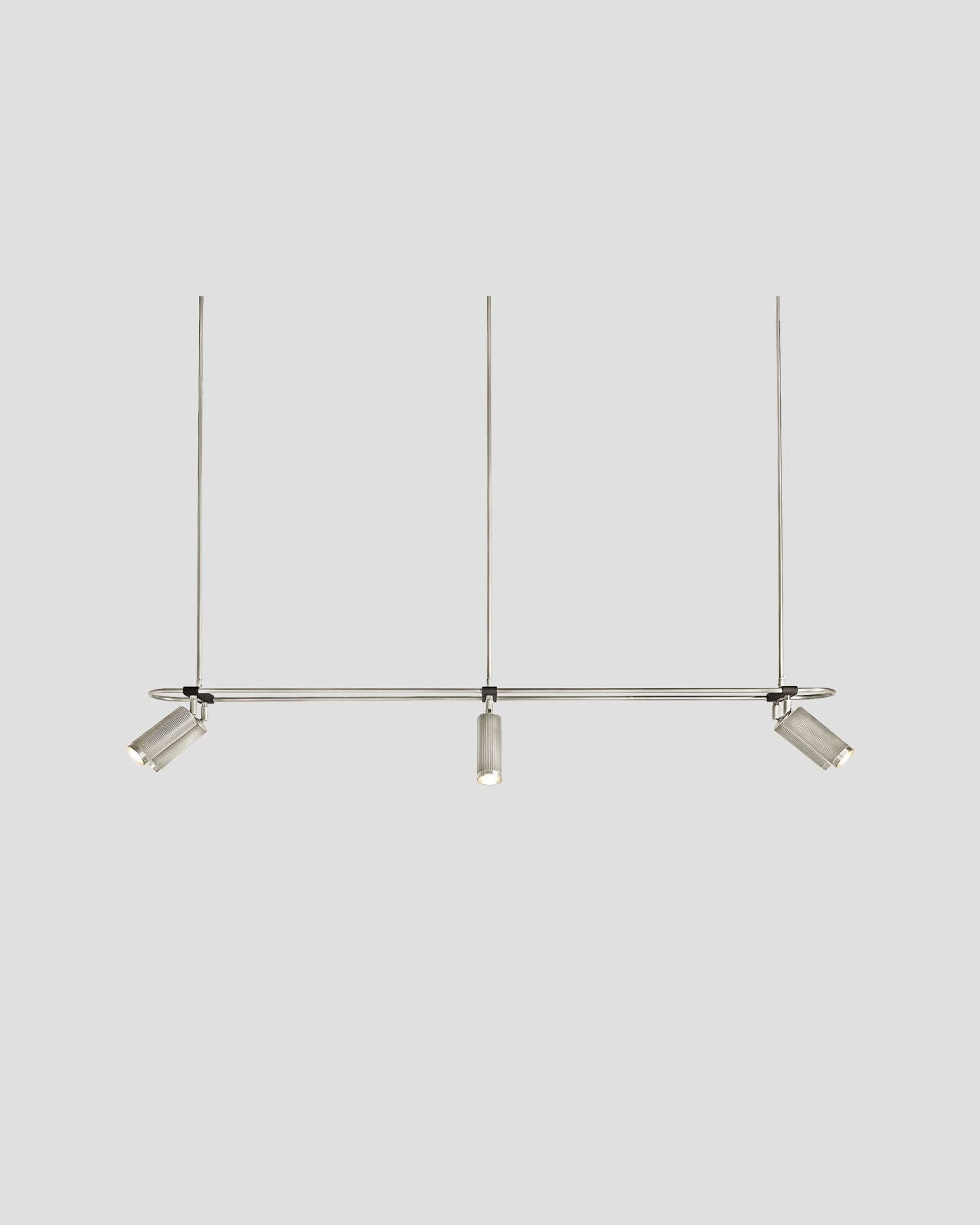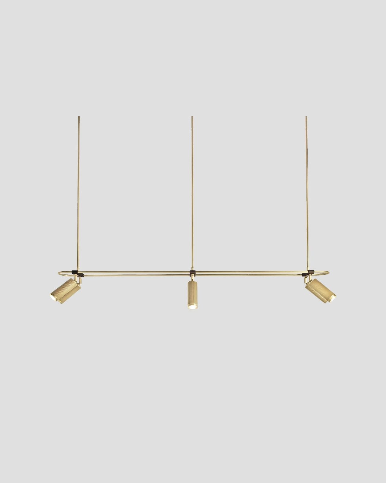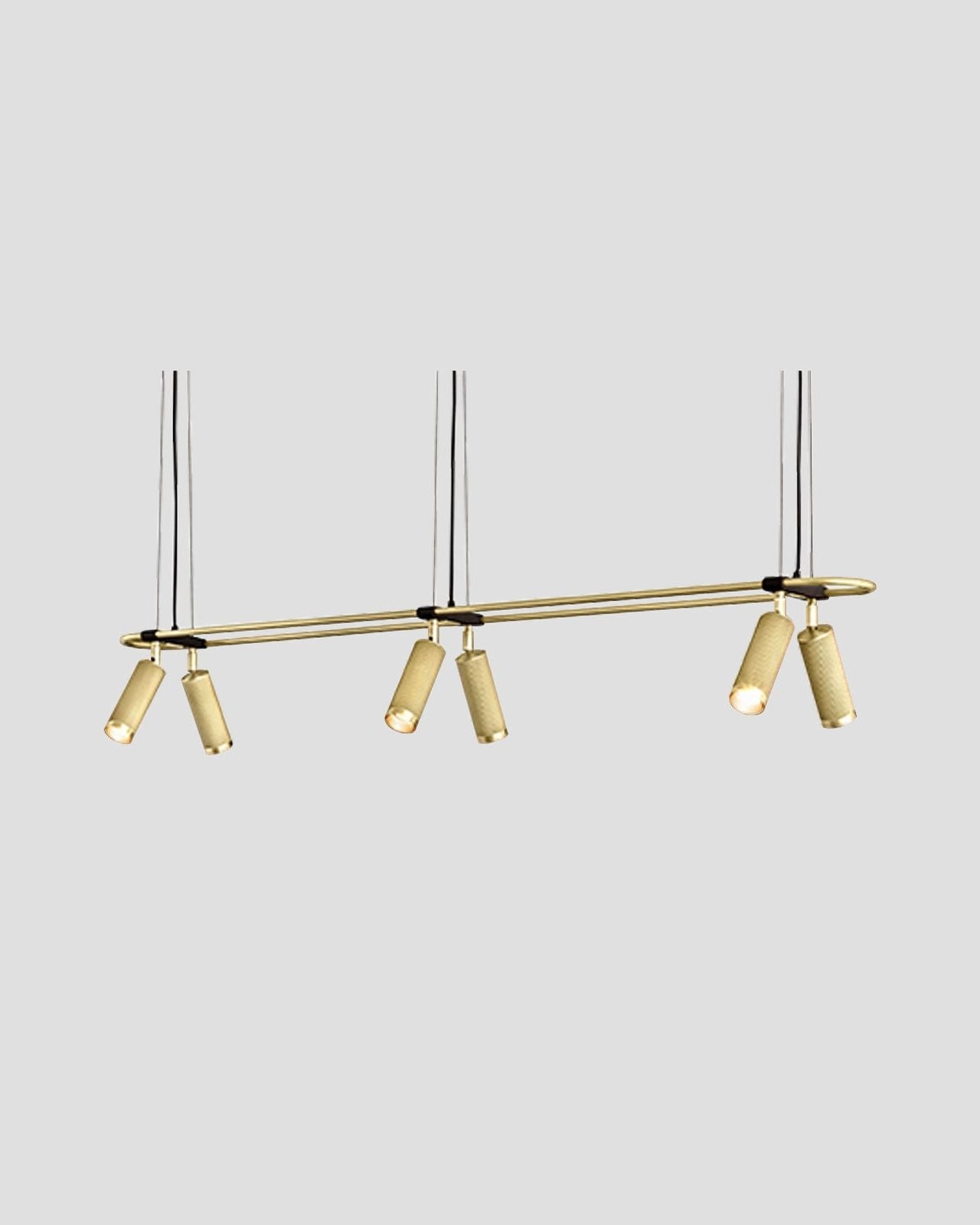 Elevating modern or contemporary kitchens, living rooms, dining rooms or commercial areas, this linear pendant features an oblong ring made from brass and on which are mounted six adjustable cylindrical heads. The refined brass details combined with the available finishes, antique brass, bronze, satin brass or satin nickel make this fixture an elegant and sophisticated addition to interiors. Suspended from a wire or a drop rod, this versatile pendant will direct a warm light where it is needed most.