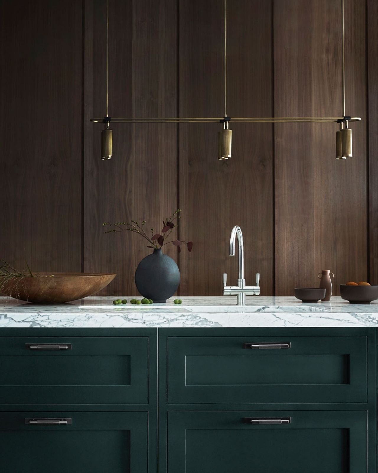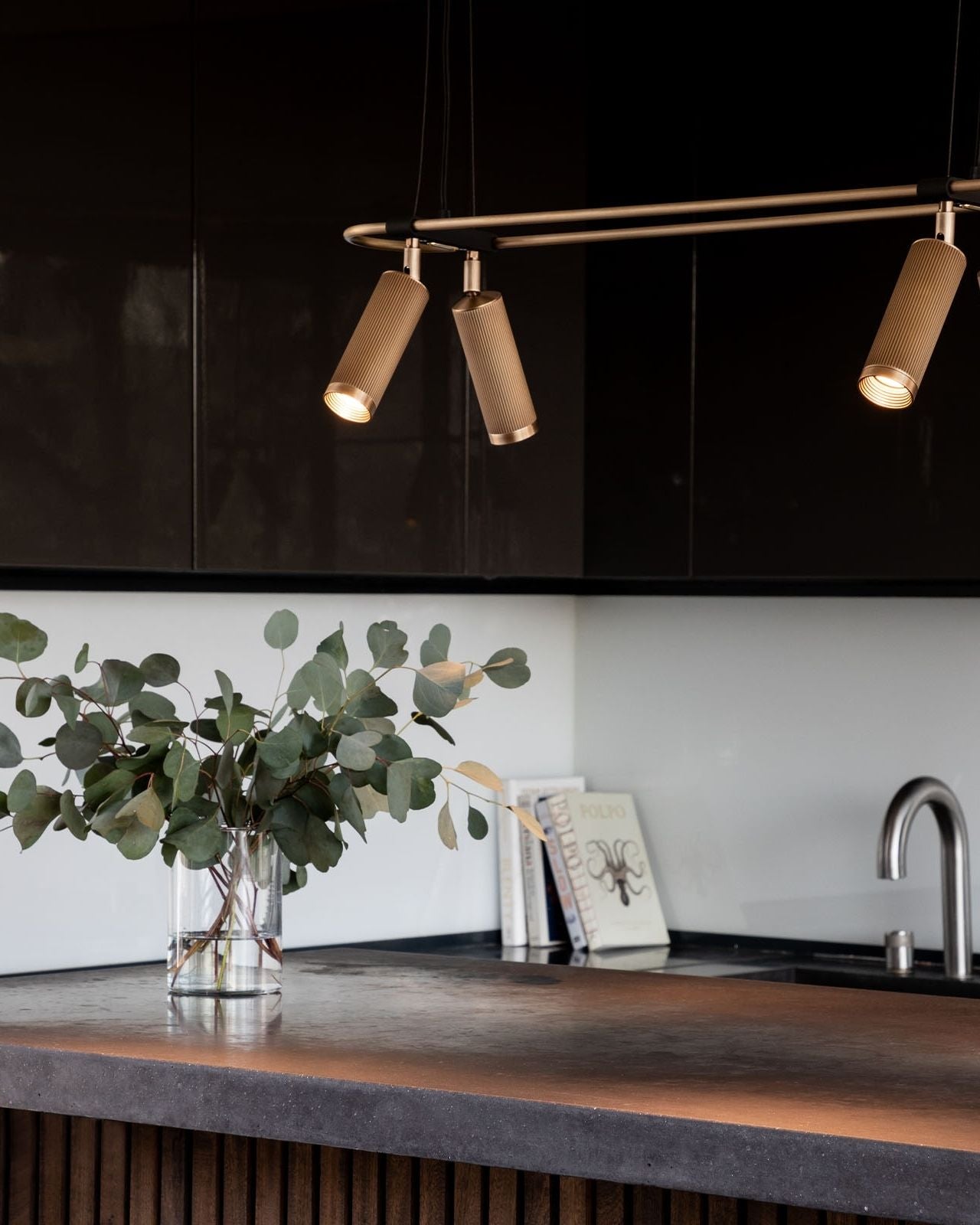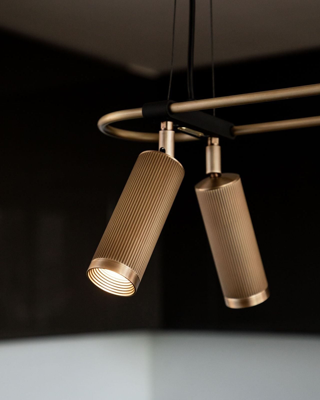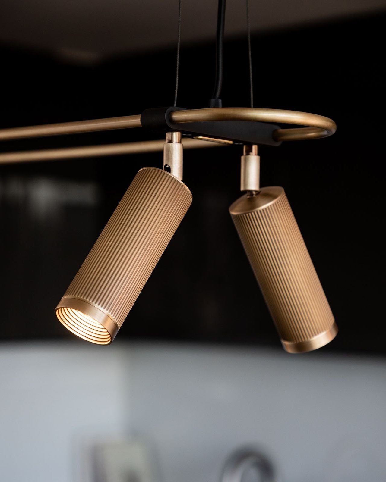 Elevating modern or contemporary kitchens, living rooms, dining rooms or commercial areas, this linear pendant features an oblong ring made from brass and on which are mounted six adjustable cylindrical heads. The refined brass details combined with the available finishes, antique brass, bronze, satin brass or satin nickel make this fixture an elegant and sophisticated addition to interiors. Suspended from a wire or a drop rod, this versatile pendant will direct a warm light where it is needed most.