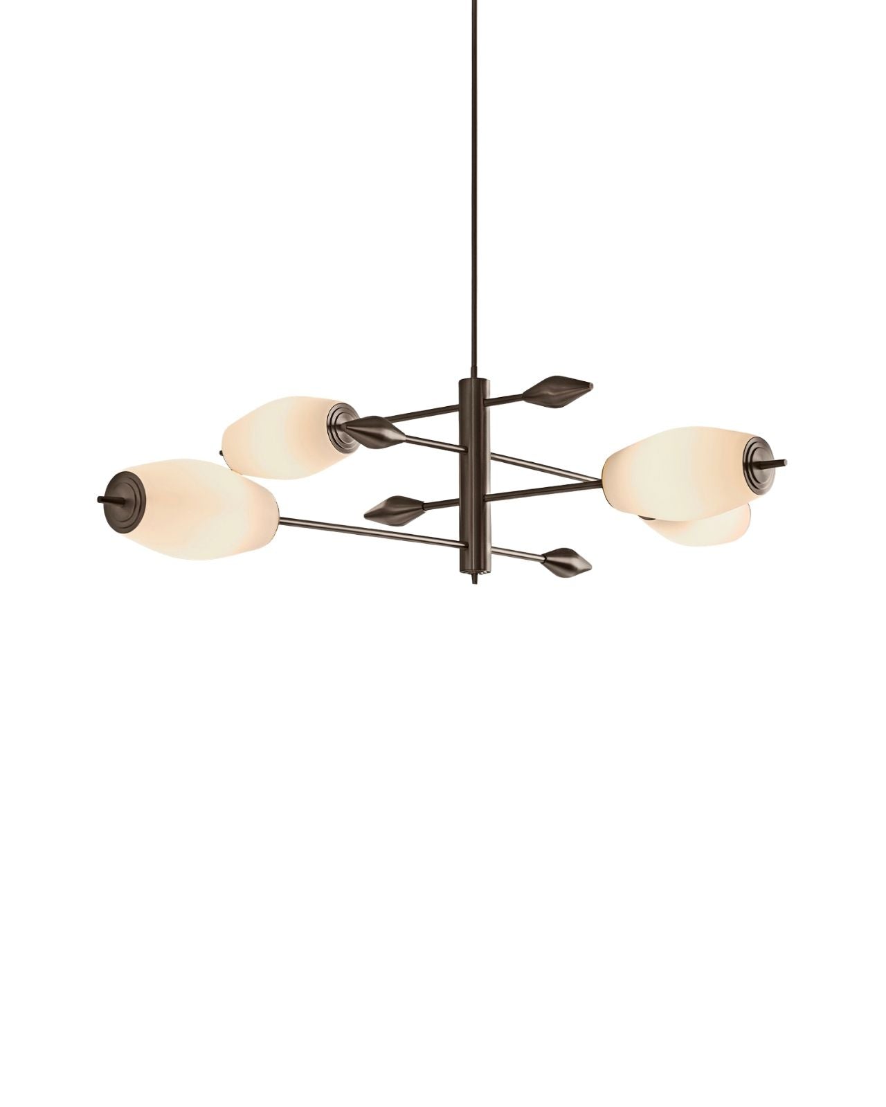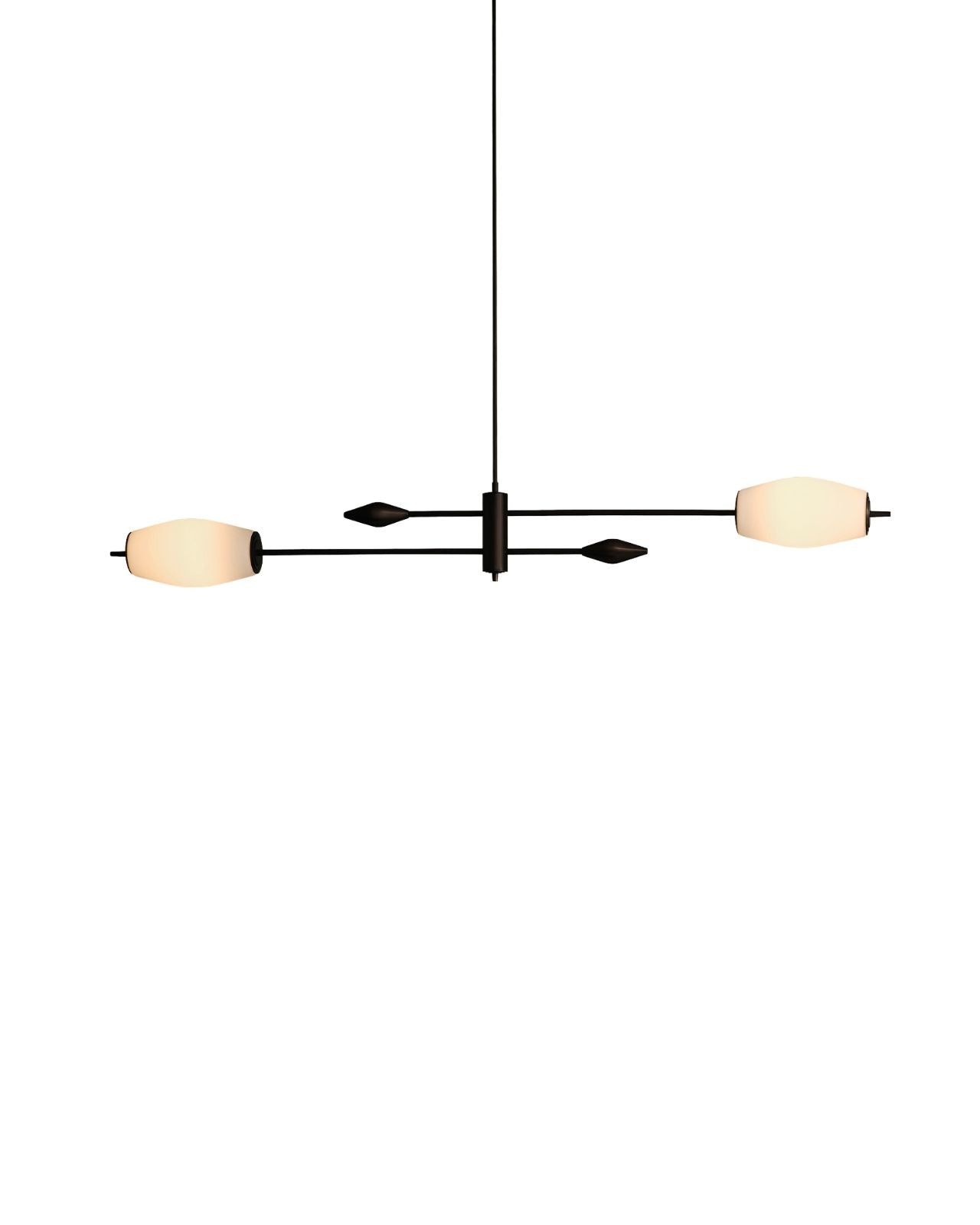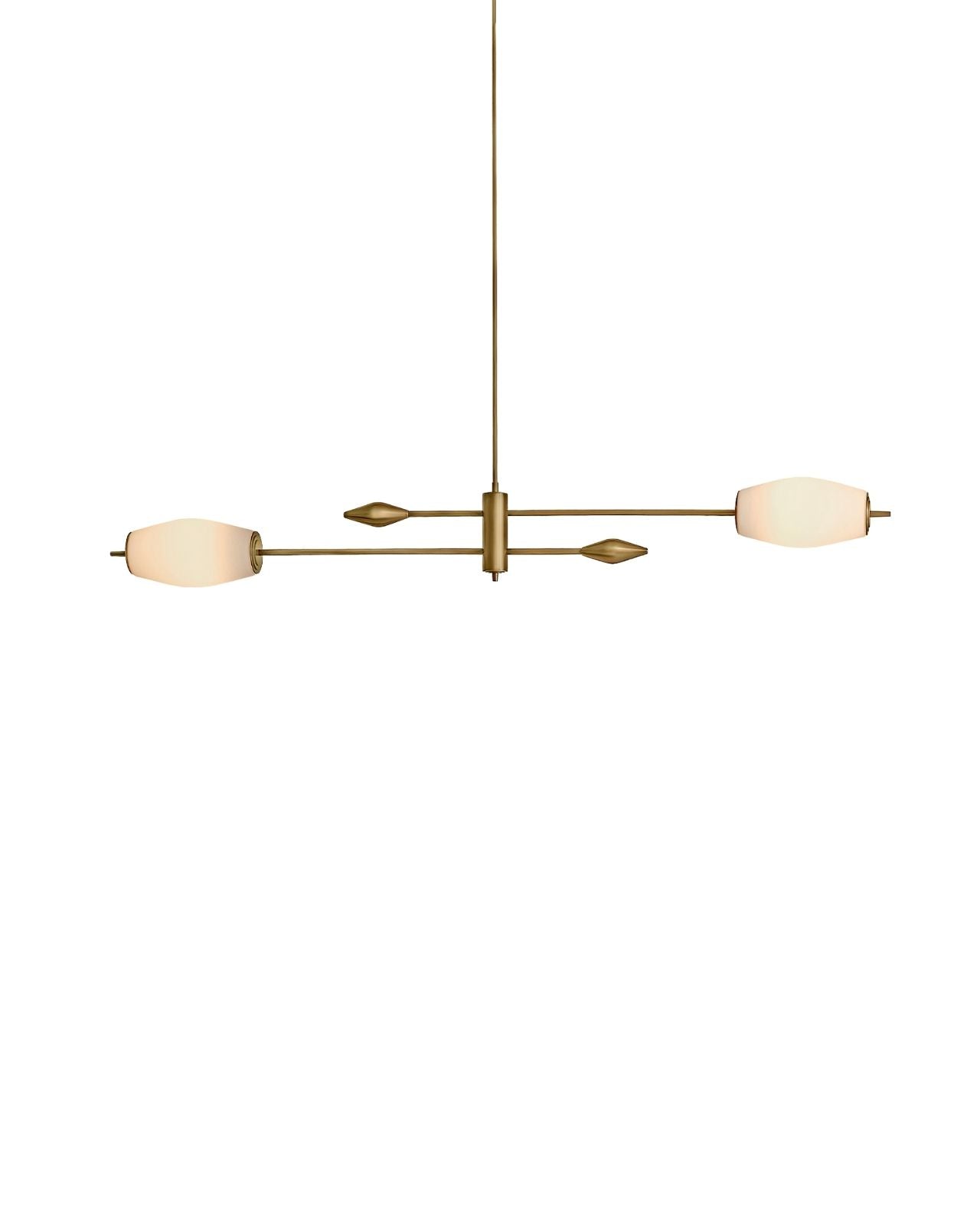 This statement modern pendant is versatile and entirely configurable making it suitable for any setting or any room. Made from brass, the structure is available in antique brass or bronze and features cantilevered arm configured into a 2, 3 or 4-arm formation. While the 2-arm version showcases a linear form perfect over counters or desks, the 3 or 4-arm version will be a bold graphic addition to a living room or dining room. Decorative and eye-catching, this chandelier also includes solid tapered counterweights providing equilibrium with beautiful sandblasted opal glass elliptical shades that offer a soft and diffused warm light in modern or contemporary interiors.