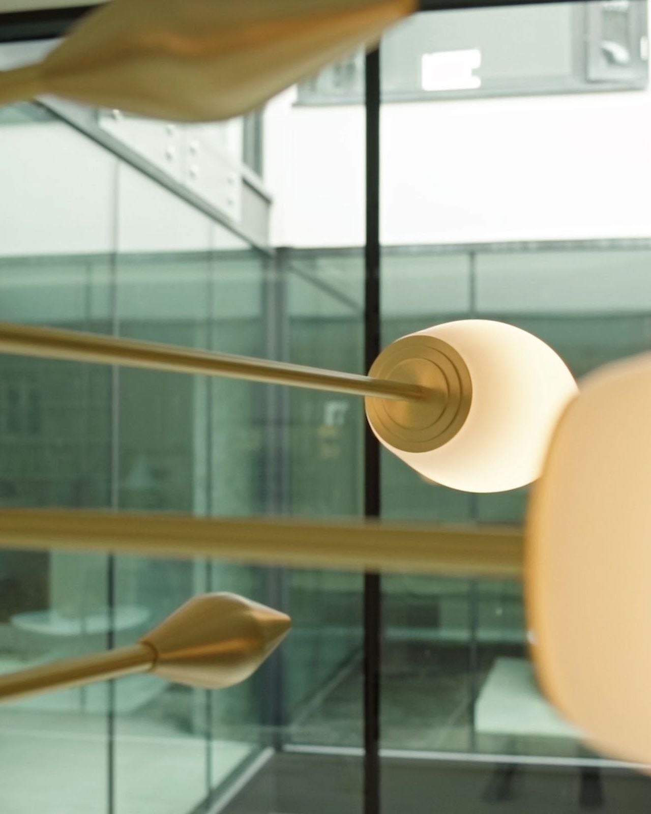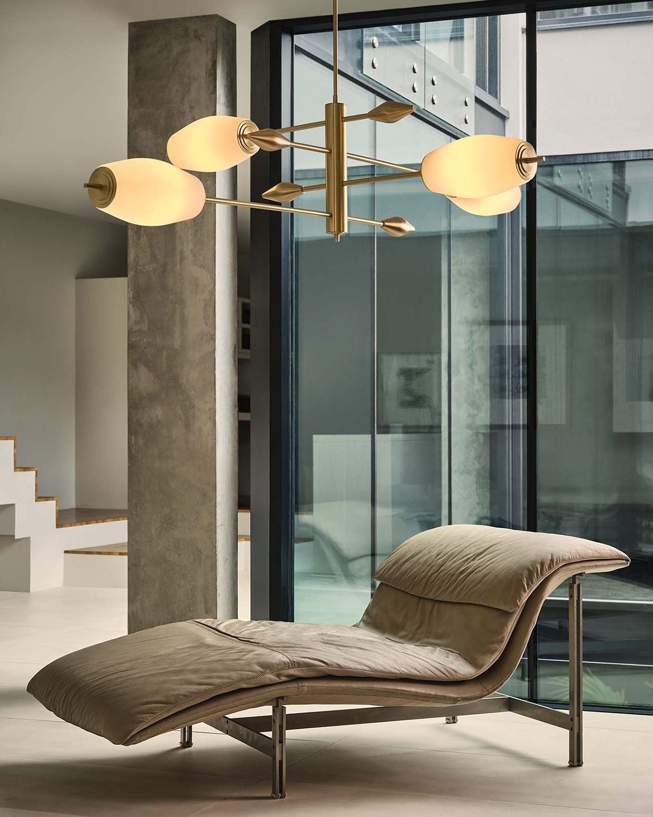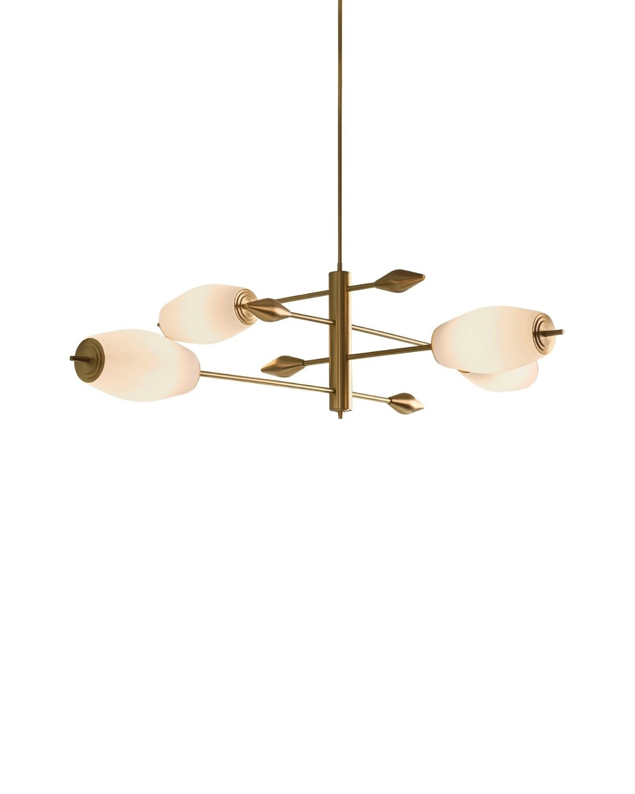 This statement modern pendant is versatile and entirely configurable making it suitable for any setting or any room. Made from brass, the structure is available in antique brass or bronze and features cantilevered arm configured into a 2, 3 or 4-arm formation. While the 2-arm version showcases a linear form perfect over counters or desks, the 3 or 4-arm version will be a bold graphic addition to a living room or dining room. Decorative and eye-catching, this chandelier also includes solid tapered counterweights providing equilibrium with beautiful sandblasted opal glass elliptical shades that offer a soft and diffused warm light in modern or contemporary interiors.