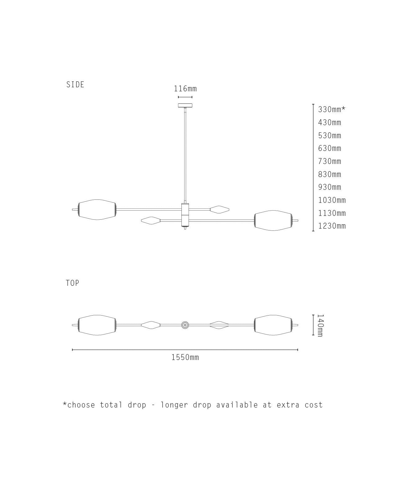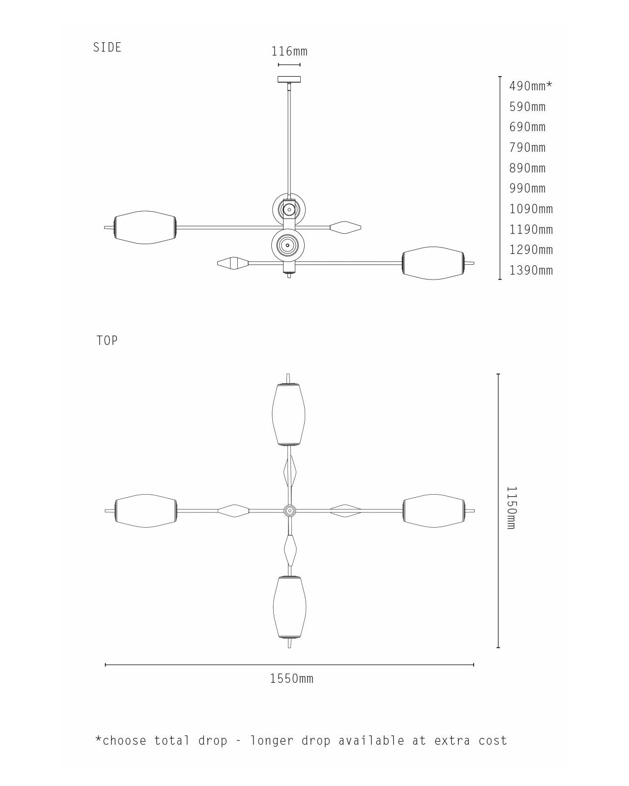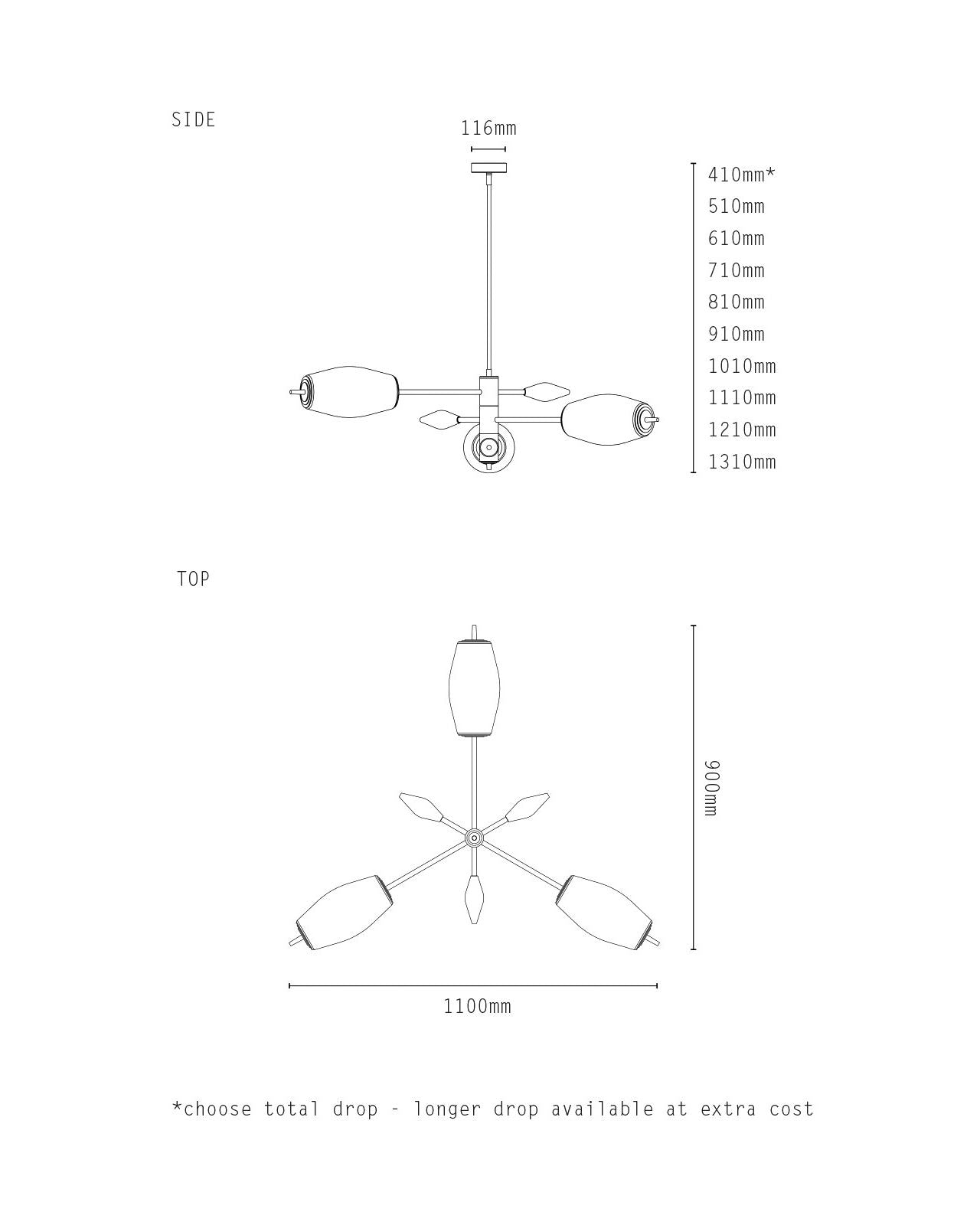 Please note* that you need to choose and share with our friendly customer service the desired total drop, at 100mm increments: from 330mm to 1230mm for the 2-arm version, from 410mm to 1310mm for the 3-arm version, from 490mm to 1390mm for the 4-arm version.